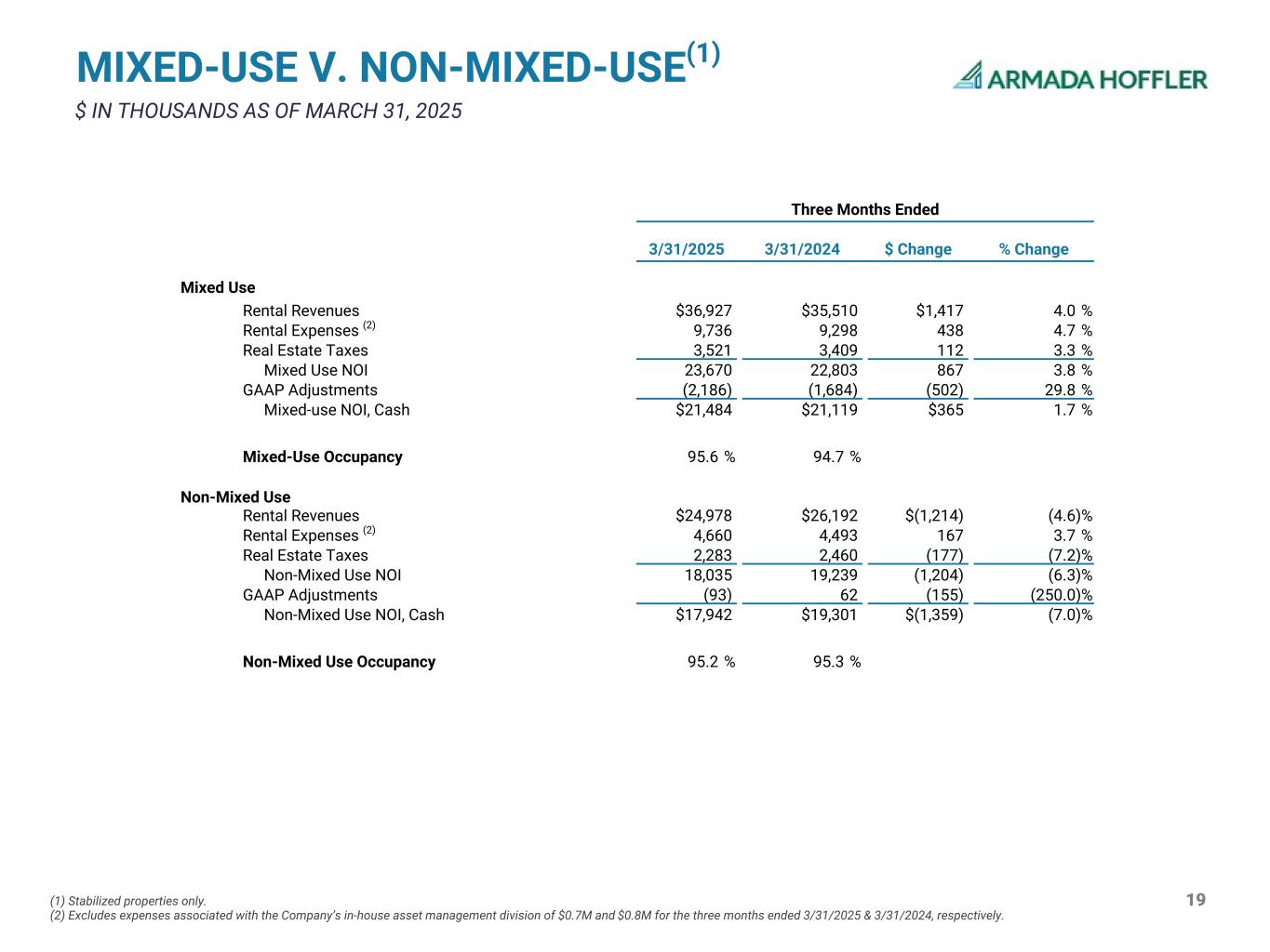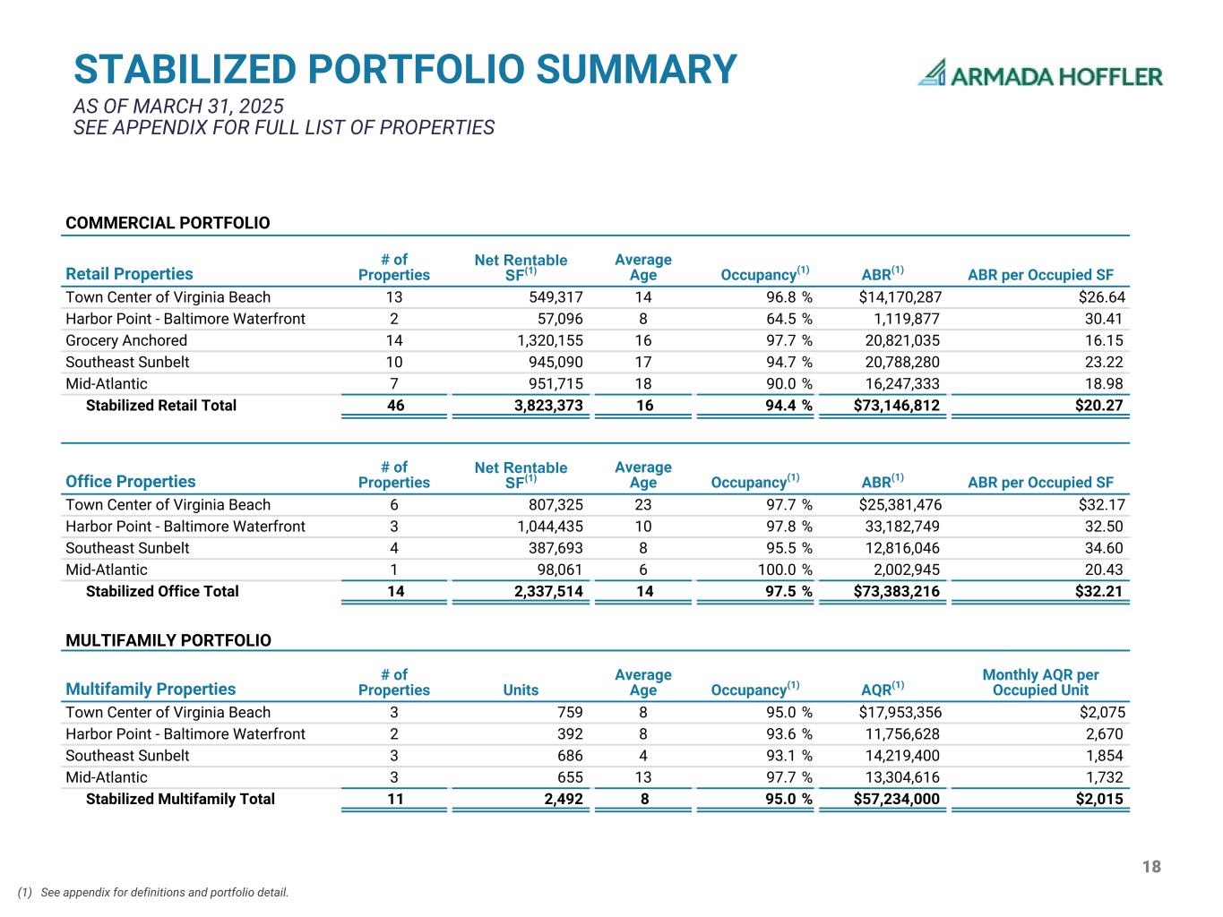 18截至2025年3月31日的稳定投资组合摘要完整的财产清单见附录(1)定义和投资组合详情见附录。商业投资组合零售物业# of properties net rentable SF(1)Average age occupancy(1)ABR(1)ABR per occupied SF Town Centre of Virginia Beach 13549,3171496.8% $ 14,170,287 $ 26.64 Harbor Point-Baltimore Waterfront 257,096864.5% 1,119,87730.41 Grocery Anchored 141,320,1551697.7% 20,821,03516.15 Southeast Sunbelt 10945,0901794.7% 20,788,28023.22 Mid-Atlantic 7951,7151890.0% 16,247,33318.98 Stabilized Retail Total 463,823,3731694.4% $ 736807,3252397.7% $ 25,381,476 $ 32.17 Harbor Point-Baltimore Waterfront 31,044,4351097.8% 33,182,74932.50 Southeast Sunbelt 4387,693895.5% 12,816,04634.60 Mid-Atlantic 198,0616100.0% 2,002,94520.43 Stabilized Office Total 142,337,5141497.5% $ 73,383,216 $ 32.21 Multifamily PortFOLIO Multifamily Properties # of Properties Units Average Ag Occupancy(1)AQR(1)Monthly AQR per Occupied Unit Town Centre of Virginia Beach 3759895。1397.7% 13,304,6161,732稳定的多户家庭总数112,492895.0% $ 57,234,000 $ 2,0 15