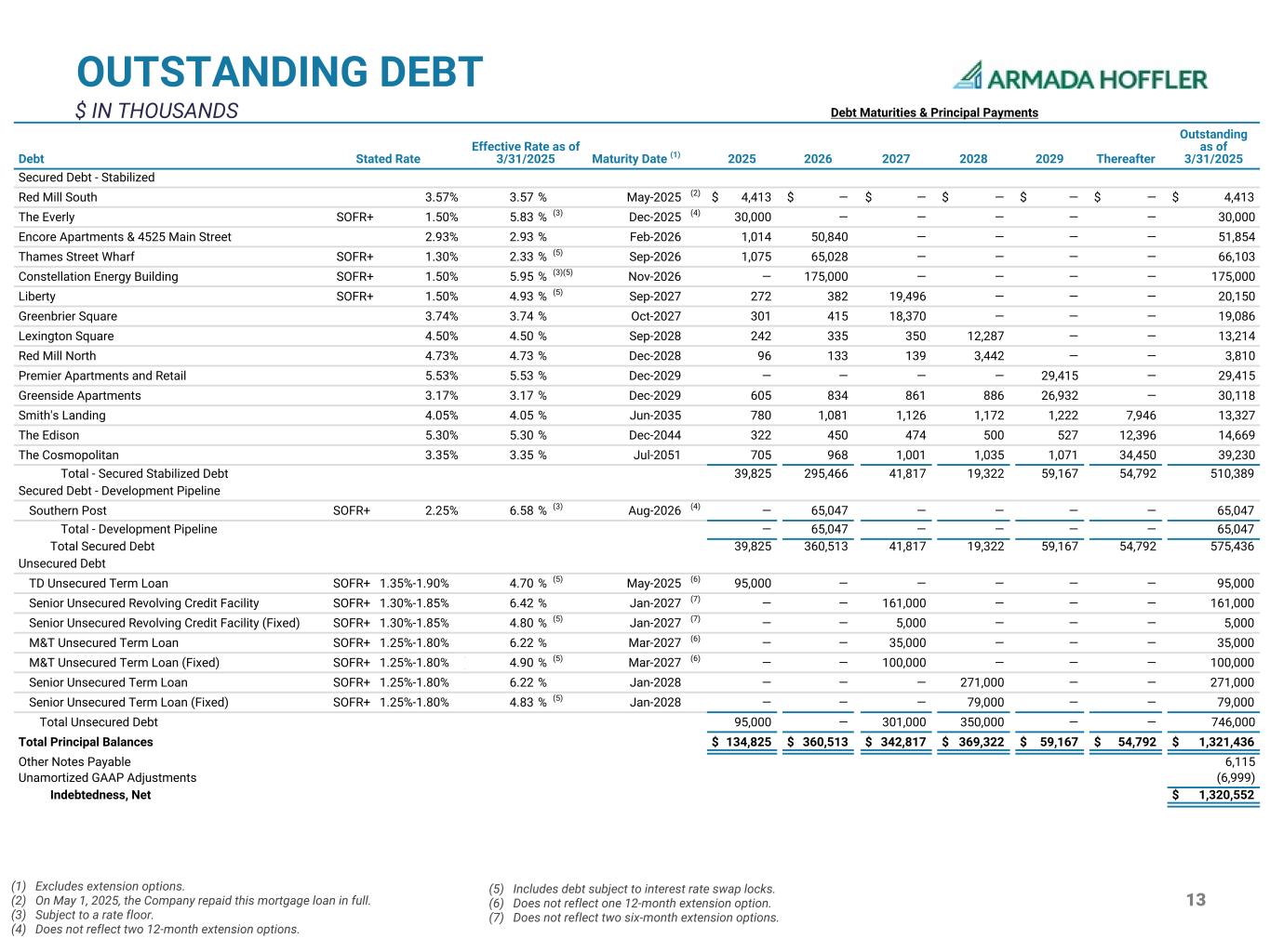 13未偿债务美元单位:千(1)不包括展期选择权。(2)2025年5月1日,公司全额偿还了本次抵押贷款。(3)受费率下限限制。(4)不反映两个12个月的延期选择。债务到期和本金支付截至2025年3月31日到期日的债务规定利率实际利率(1)20252026202720282029此后未偿还截至2025年3月31日有担保债务-稳定的Red Mill South 3.57% 3.57% May-2025(2)$ 4,413 $ — $ — $ — $ — $ 4,413 The Everly SOFR + 1.50% 5.83%(3)Dec-2025(4)30,000 ———— 30,000 Encore Apartments & 4525 Main Street 2.93% 2.93% Feb-2026 1,01450,840 ———— 51,854 Thames Street Wharf SOFR + 1.30% 2.33%(5)Sep-2026 1,07565,028 ———— 66,103 Constellation Energy Building SOFR + 1.50% 5.95%(3)(5)Nov-2026 — 175,000 ———— 175,000 LibertySOFR + 1.50% 4.93%(5)Sep-2027 27238219,496 ———— 20,150 Greenbrier Square 3.74% 3.74% Oct-2027 30141518,370 ———— 19,086 Lexington Square 4.50% 4.50% Sep-2028 24233535012,287 —— 13,214 Red Mill North 4.73% 4.73% Dec-2028 961331393,442 —— 3,810 Premier Apartments零售5.53% 5.53% Dec-2029 ———— 29,415 — 29,415 Greenside Apartments 3.17% 3.17% Dec-2029 60583486188626,932 — 30,118 Smith's Landing 4.05% 4.05% Jun-2035 7801,0811,1261,1721,2227,94613,327 The Edison 5.30% 5.30% Dec-2044 32245047450052712,39614,669 The Cosmopolitan 3.35% 3.35% Jul-2051 7059681,0011,0351,07134,45039,230 Total-Secured Stabilized Debt 39,825295,46641,81719,32259,16754,792510,389 Secured Debt-Develop———— 65,047总计-开发管道—— 65,047 ———— 65,047有担保债务总额39,825360,51341,81719,32259,16754,792575,436无担保债务TD无担保定期贷款SOFR + 1.35%-1.90 % 4.70%(5)May-2025(6)95,000 ———— 95,000高级无担保循环信贷融资SOFR + 1.30%-1.85 % 6.42% Jan-2027(7)—— 161,000 ———— 161,000高级无担保循环信贷融资(固定)SOFR + 1.30%-1.85 % 4.80%(5)Jan-2027(7)——5,000 ———— 5,000 M & T无担保定期贷款SOFR + 1.25%-1.80 % 6.22% Mar-2027(6)——35,000 ————35,000 M & T无抵押定期贷款(固定)SOFR + 1.25%-1.80 % d)4.90%(5)Mar-2027(6)—— 100,000 ———— 100,000高级无抵押定期贷款SOFR + 1.25%-1.80 % 6.22% Jan-2028 ———— 271,000 —— 271,000高级无抵押定期贷款(固定)SOFR + 1.25%-1.80 % 4.83%(5)Jan-2028 ———— 79,000 —— 79,000无抵押债务总额95,000 — 301,000350,000 —— 746,000本金余额总额134,825美元360,513美元342,817美元369,322美元59,167美元54,792美元1,321,436美元其他应付票据6,115未摊销GAAP调整(6,999)债务,净额1,320,552美元(5)包括受利率掉期锁定的债务。(6)不反映一项12个月的延期选择。(7)不反映两个六个月的延期选择。