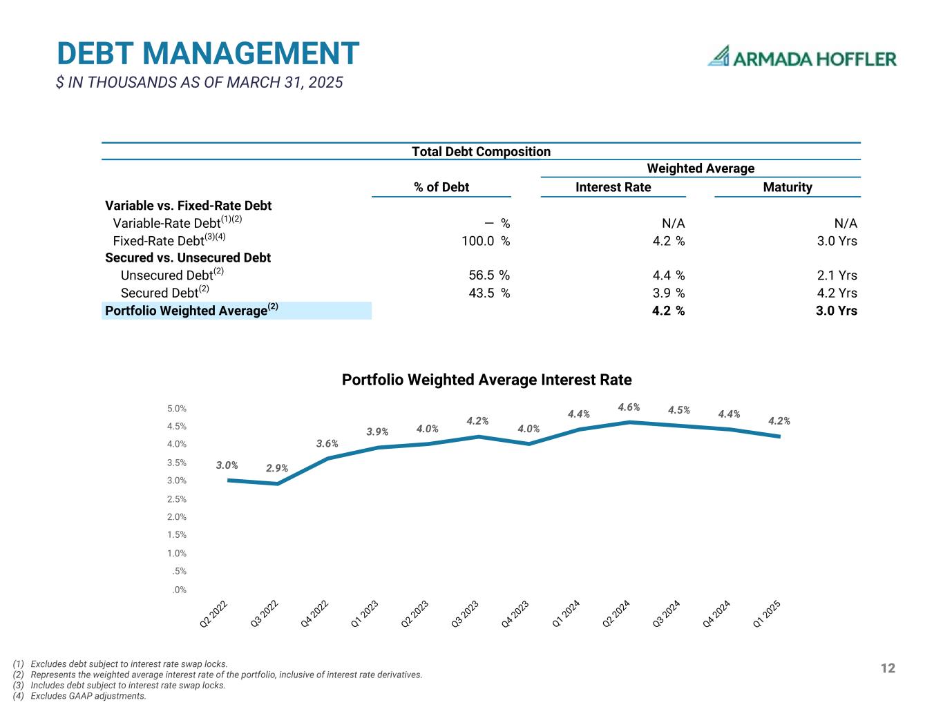 11个以千美元为单位的杠杆指标见附录的定义、计算和调节(1)包括与开发、房地产融资、建筑和我们稳定投资组合之外的其他辅助活动相关的收入和债务。(2)反映总债务减去GAAP调整、现金、限制性现金和其他应付票据。截至2025年3月31日止三个月稳定投资组合调整后EBITDA 43,245美元稳定投资组合债务929,807美元稳定投资组合债务/稳定投资组合调整后EBITDA 5.4 x调整后EBITDA总额45,105美元净债务(2)1,272,869美元净债务/调整后EBITDA总额(1)7.1 x净债务+优先1,443,954美元净债务+优先/调整后EBITDA总额8.0 x 0.0 x 1.0 x 2.0 x 3.0 x 4.0 x 5.0 x 7.0 x 8.0 x 9.0 x 10.0 x 5.4x 7.1x 8.0x稳定投资组合债务/稳定投资组合调整后EBITDA净债务/调整后EBITDA总额(1)净债务+优先/调整后EBITDA总额