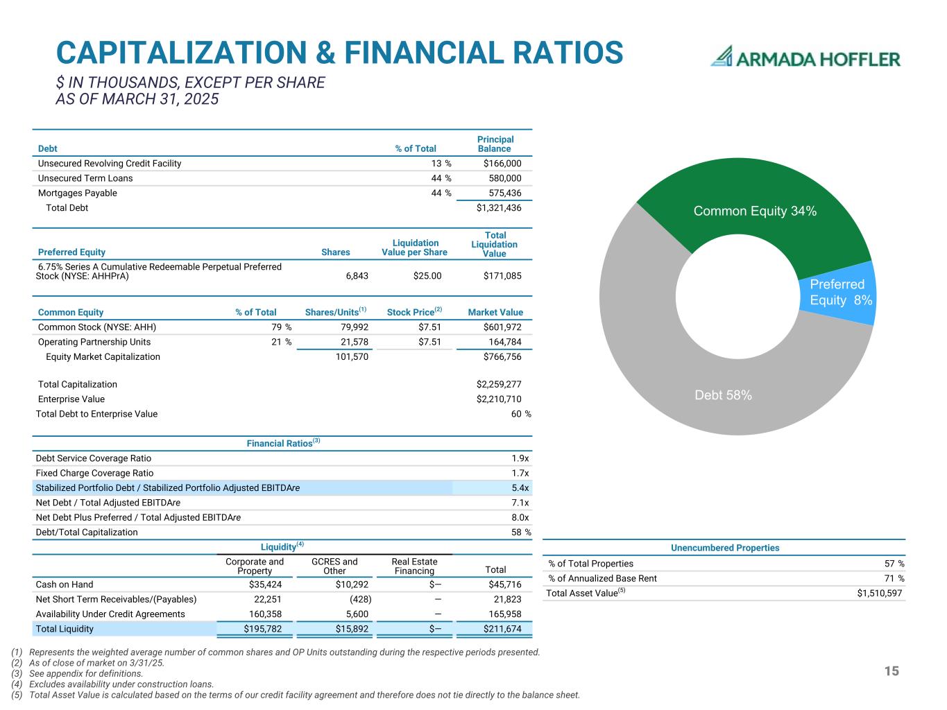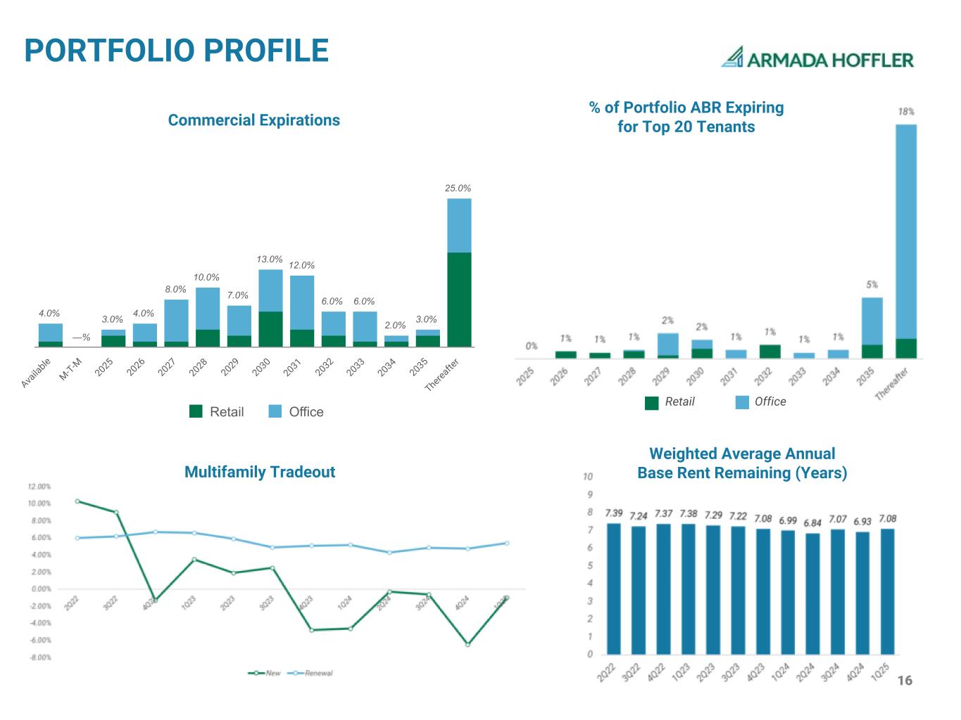 15资本和财务比率以千美元为单位,截至2025年3月31日每股除外(1)表示在所示的相应期间内已发行在外的普通股和OP单位的加权平均数。(2)截至3/31/25收市。(3)定义见附录。(4)不包括建设贷款项下的可用性。(5)总资产价值是根据我们的信贷安排协议条款计算的,因此与资产负债表没有直接联系。债务占总本金余额的百分比无担保循环信贷融资13% $ 166,000无担保定期贷款44% 580,000应付抵押贷款44% 575,436总债务$ 1,321,436优先股每股清算价值总清算价值6.75% A系列累积可赎回永久优先股(NYSE:AHHPRA)6,843 $ 25.00 $ 171,085普通股权%总股份/单位(1)股票价格(2)市值普通股(NYSE:AHH)79% 79,992 $ 7.51 $ 601,972运营合伙单位21% 21,578 $ 7.5 1164,784股权市值101,570 $ 766,756总资本化$ 2,259,277企业价值$ 2,210,710总债务与企业价值60%财务比率(3)债务覆盖率1.9x固定费用覆盖率1.7x稳定投资组合债务/稳定投资组合调整后EBITDA为5.4x净债务/调整后EBITDA总额为7.1x净债务加上优先/调整后EBITDA总额为8.0x债务/总资本58%流动性(4)企业和财产GCRES和其他房地产融资总手头现金$ 35,424 $ 10,292 $ — $ 45,716净短期应收账款/(应付账款)22,251(428)— 21,823信贷协议下的可用性160,3585,600 — 165,958总流动性$ 195,782 $ 15,892 $ — $ 211,674未支配财产占总财产的百分比57%%年化基本租金71%总资产价值(5)$ 1,510,597优先股8%债务58%普通股34%