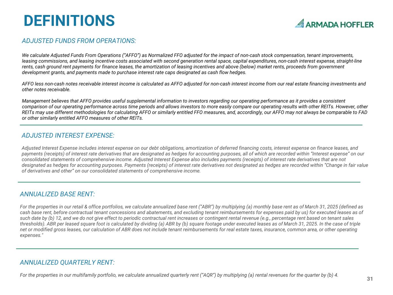 31年度基础租金:对于我们零售和办公组合中的物业,我们计算年化基础租金(“ABR”)的方法是(a)截至2025年3月31日的已执行租赁的每月基础租金(定义为现金基础租金,在合同租户优惠和减免之前,不包括我们支付的费用的租户报销)乘以(b)12,并且我们不实施定期合同租金上涨或或有租金收入(例如,基于租户销售门槛的百分比租金)。根据截至2025年3月31日的已执行租约,每租赁平方英尺的ABR是通过(a)ABR除以(b)平方英尺计算得出的。在三重净额或修改总租赁的情况下,我们的ABR计算不包括租户偿还的房地产税、保险、公共区域或其他运营费用。”定义年化季度租金:对于我们多户组合中的物业,我们通过将(a)本季度的租金收入乘以(b)4来计算年化季度租金(“AQR”)。调整后的利息支出:调整后的利息支出包括我们的债务义务的利息支出、递延融资成本的摊销、融资租赁的利息支出以及为会计目的指定为套期保值的利率衍生工具的付款(收入),所有这些都记录在我们的综合综合收益表的“利息支出”中。调整后的利息费用还包括未指定为会计目的套期保值的利率衍生工具的付款(收款)。未被指定为套期保值的利率衍生工具的付款(收款)记入我们综合综合收益表的“衍生工具公允价值变动及其他”项下。调整后的运营资金:我们将调整后的运营资金(“AFFO”)计算为正常化的FFO,调整了与第二代租赁空间相关的非现金股票补偿、租户改善、租赁佣金和租赁激励成本、资本支出、非现金利息支出、直线租金、融资租赁的现金地租付款、租赁奖励摊销和高于(低于)市场租金、政府开发赠款收益以及为购买指定为现金流对冲的利率上限所支付的款项的影响。AFFO减去非现金应收票据利息收入计算为AFFO调整后的非现金利息收入来自我们的房地产融资投资和其他应收票据。管理层认为,AFFO为投资者提供了有关我们经营业绩的有用补充信息,因为它提供了我们跨时间段经营业绩的一致比较,并使投资者能够更容易地将我们的经营业绩与其他REITs进行比较。然而,其他REITs可能会使用不同的方法来计算AFFO或类似的有权FFO措施,因此,我们的AFFO可能并不总是与其他REITs的FAD或其他类似有权的AFFO措施具有可比性。