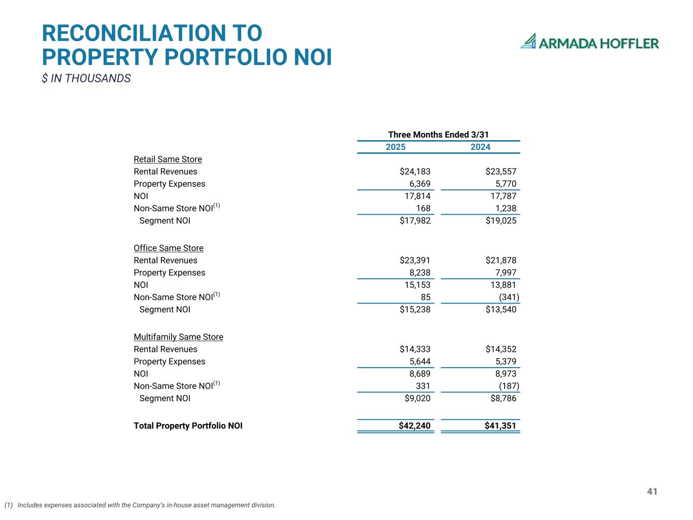 41与物业组合NOI $的对账单位:千(1)包括与公司内部资产管理部门相关的费用。截至3/31的三个月2025年2024年零售同店租金收入24,183美元23,557美元物业费用6,3695,770 NOI 17,81417,787非同店NOI(1)1681,238分部NOI 17,982美元19,025美元办公室同店租金收入23,391美元21,878美元物业费用8,2387,997 NOI 15,15313,881非同店NOI(1)85(341)分部NOI 15,238美元13,540美元多户同店租金收入14,333美元14,352美元物业费用5,6445,379 NOI 8,6898,973非同店NOI(1)331(187)分部NOI 9,020美元8,786总物业组合NOI 42,240美元41,351美元