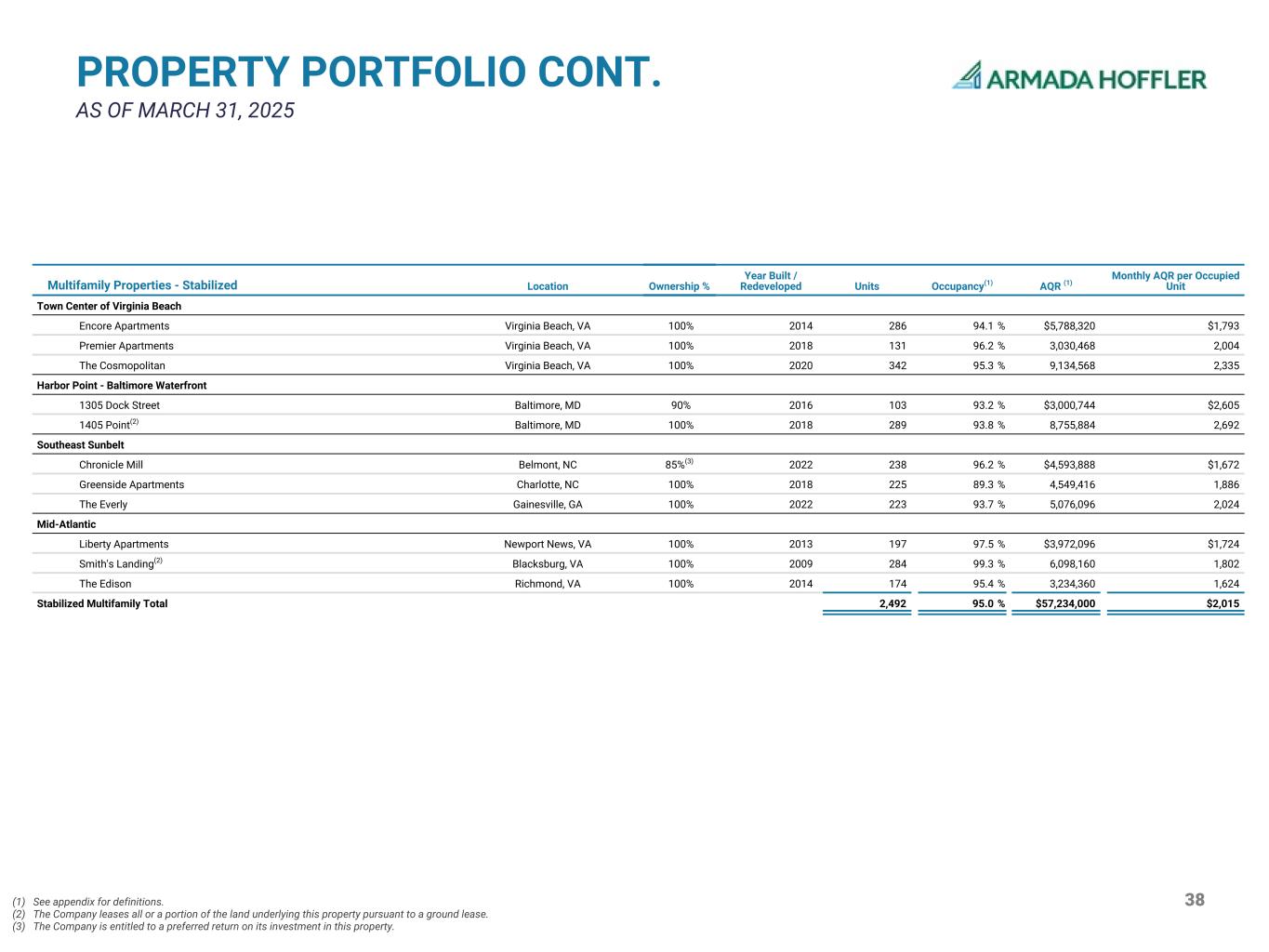 38 Property Portfolio CONT。截至2025年3月31日多户房产-稳定位置所有权%年已建成/重新开发单位入住率(1)AQR(1)每月每占用单位AQR弗吉尼亚海滩Encore Apartments Virginia Beach,VA 100% 201428694.1% $ 5,788,320 $ 1,793 Premier Apartments Virginia Beach,VA 100% 201813196.2% 3,030,4682,004 The Cosmopolitan Virginia Beach,VA 100% 202034295.3% 9,134,5682,335 Harbor Point-Baltimore Waterfront 1305 Dock Street Baltimore,MD 90% 201610393.2% $ 3,000,744 $ 2,6051405 Point(2)Baltimore,MD 100% 201828993.8% 8,755,8842,692 Southeast Sunbelt Chronicle Mill Belmont,NC 85%(3)202223896.2% $ 4,593,888 $ 1,672 Greenside Apartments Charlotte,NC 100% 201822589.3% 4,549,4161,886 The Everly Gainesville,GA 100% 20222393.7% 5,076,0962,024 Mid-Atlantic Liberty Apartments Newport News,VA 100% 201319797.5% $ 3,972,096 $ 1,724 Smith's Landing(2)Blacksburg,VA 100% 200928499.3% 6,098,1601,802 The Edison Richmond,VA 100% 201417495.4% 3,234,3601,624 Stabilized M(2)公司依据地租租赁该物业的全部或部分地皮。(3)公司有权就其对该物业的投资获得优先回报。
