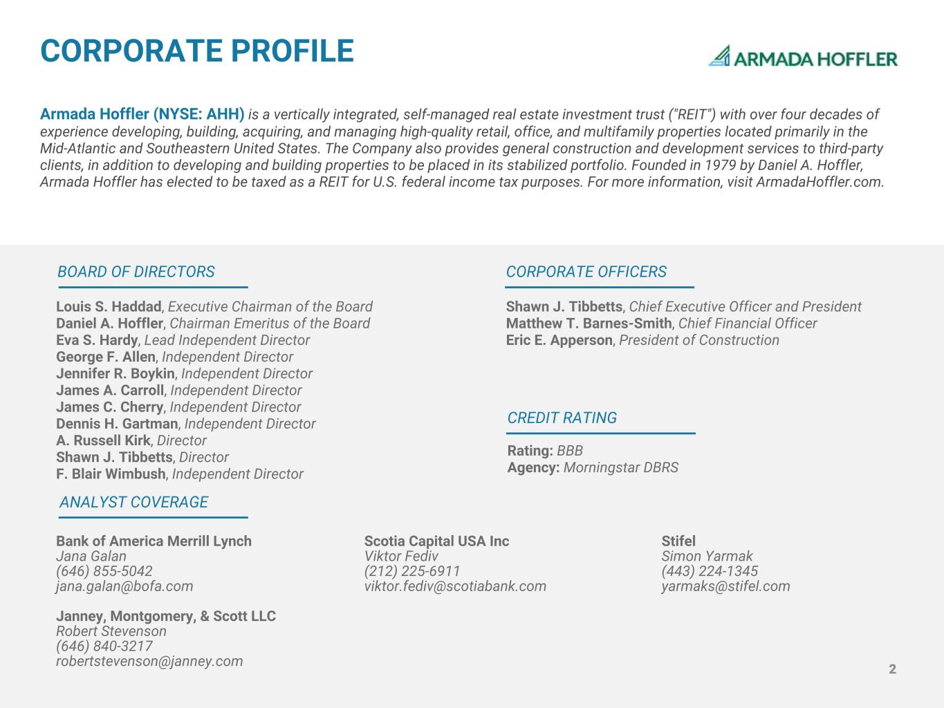 2家董事会,Louis S. Haddad,董事会执行主席Daniel A. Hoffler,董事会名誉主席Eva S. Hardy,首席独立董事George F. Allen,独立董事Jennifer R. Boykin,独立董事TERM4,James A. Carroll,独立董事TERM5,James C. Cherry,TERM6,独立董事Dennis H. Gartman,独立董事A. Russell Kirk,独立董事TERM7,董事Shawn J. Tibbetts,董事F. Blair Wimbush,独立董事CORPORATE Officers Shawn J. Tibbetts,首席执行官兼总裁Matthew T. Barnes-Smith,首席财务官Eric E. Apperson,Construction Scotia Capital USA Inc总裁Viktor Fediv(212)225-6911 viktor.fediv@scotiabank.com美银美林Jana Galan(646)855-5042 jana.galan@bofa.com Janney,Montgomery,& Scott LLC Robert Stevenson(646)840-3217 robertstevenson@janney.com分析师报道Armada Hoffler(纽约证券交易所代码:AHH)是一家垂直整合、自我管理的房地产投资信托基金(“REIT”),在开发、建造、收购和管理主要位于美国中部大西洋和东南部的优质零售、办公和多户型物业方面拥有超过四十年的经验。该公司还向第三方客户提供一般建设和开发服务,此外还开发和建造将置于其稳定投资组合中的物业。Armada Hoffler由Daniel A. Hoffler于1979年创立,已选择作为REIT因美国联邦所得税目的而征税。欲了解更多信息,请访问ArmadaHoffler.com。企业概况信用评级:BBB机构:晨星信息 DBRS Stifel Simon Yarmak(443)224-1345 yarmaks@stifel.com