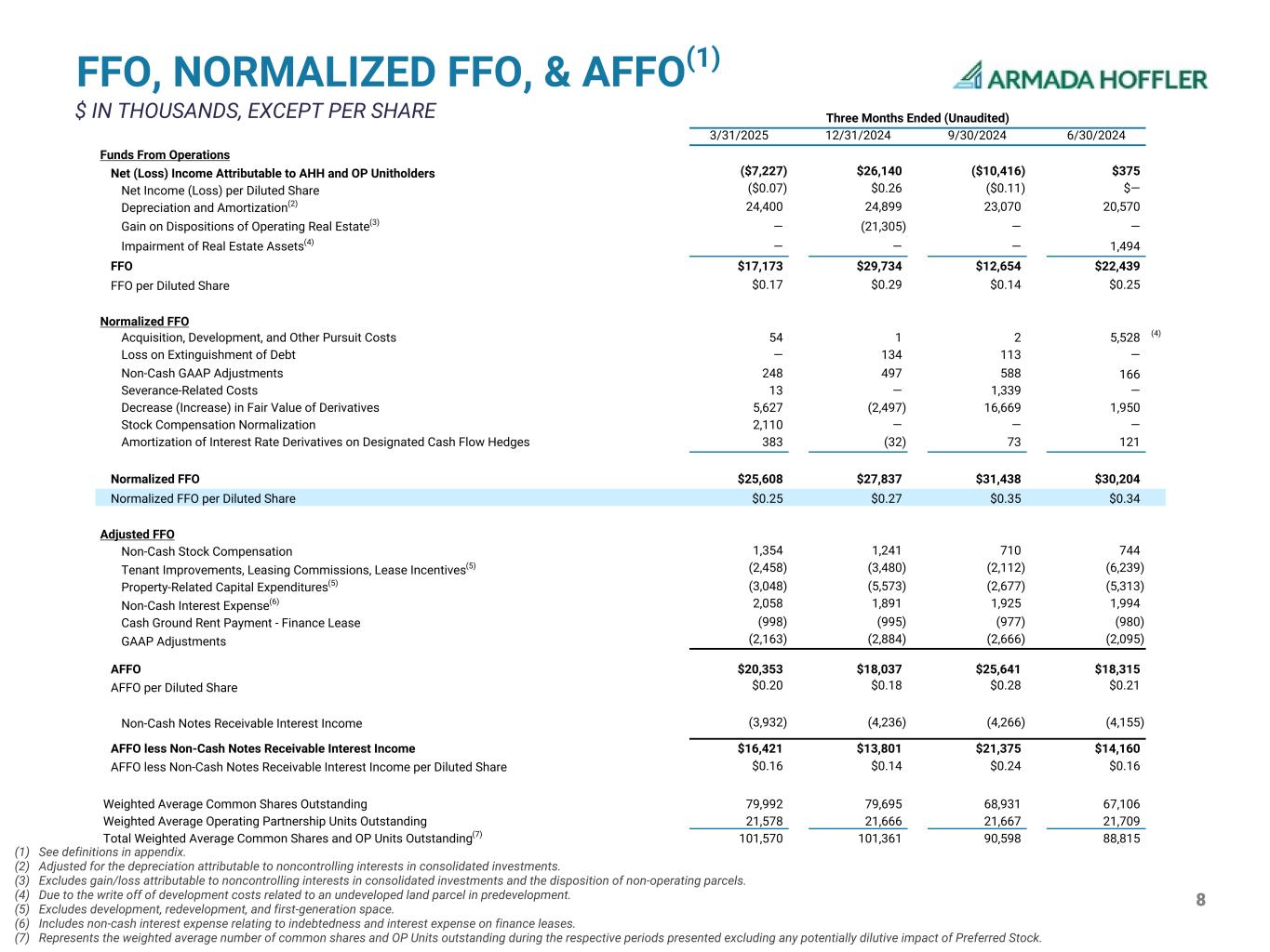 8 FFO、正常化FFO和AFFO(1)以千美元计,每股除外截至三个月(未经审计)3/31/202512/31/20249/30/20246/30/2024来自运营的资金归属于AHH和OP单位持有人的净(亏损)收入(7,227美元)26,140美元(10,416美元)375美元每股摊薄净收益(亏损)(0.07美元)0.26美元(0.11美元)$ —折旧和摊销(2)24,40024,89923,07020,570经营性不动产处置收益(3)—(21,305)——不动产资产减值(4)———— 1,494 FFO 17,173美元和其他追索成本54125,528(4)债务清偿损失— 134113 —非现金公认会计原则调整数248497588166与遣散费相关的成本13 — 1,339 —衍生工具公允价值减少(增加)5,627(2,497)16,6691,950股票补偿正常化2,110 ——指定现金流对冲的利率衍生工具摊销383(32)73121正常化FFO $ 25,608 $ 27,837 $ 31,438 $ 30,204正常化FFO每稀释股份$ 0.25 $ 0.27 $ 0.35 $ 0.34调整后FFO非现金股票补偿1,3541,2417 10744租户改善,租赁佣金,租赁奖励(5)(2,458)(3,480)(2,112)(6,239)与物业相关的资本支出(5)(3,048)(5,573)(2,677)(5,313)非现金利息支出(6)2,0581,8911,9251,994现金地租支付-融资租赁(998)(995)(977)(980)GAAP调整(2,163)(2,884)(2,666)(2,095)AFFO $ 20,353 $ 18,037 $ 25,641 $ 18,315 AFFO每稀释股份$ 0.20 $ 0.18 $ 0.28 $ 0.21非现金应收票据利息收入(3,932)(4,236)(4,266)(4,155)AFF21,66621,66721,709总加权平均普通股和已发行OP单位(7)101,570101,36190,59888,815(1)见附录中的定义。(2)经综合投资的非控制性权益应占折旧调整。(3)不包括归属于综合投资的非控制性权益的收益/亏损以及非经营性包裹的处置。(四)前期开发中未开发地块相关开发成本核销所致。(五)不含开发、再开发、第一代空间。(6)包括与负债有关的非现金利息支出和融资租赁利息支出。(7)表示在列报的相应期间内已发行普通股和OP单位的加权平均数,不包括优先股的任何潜在稀释影响。