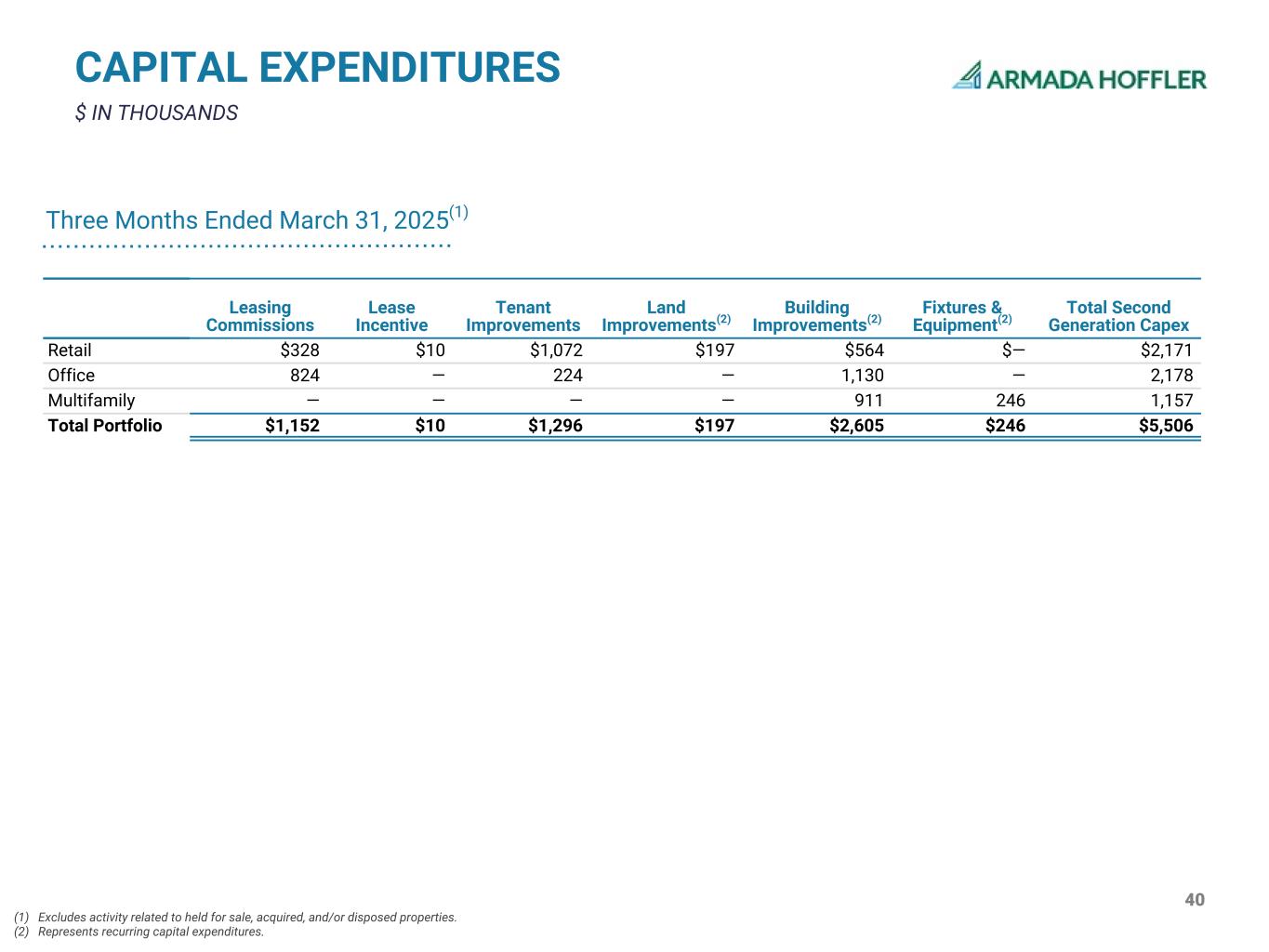40美元单位:千元资本支出(1)不包括与持有待售、收购和/或处置财产相关的活动。(2)代表经常性资本支出。租赁佣金租赁奖励租户改善土地改善(2)建筑改善(2)固定装置和设备(2)第二代总资本支出零售328美元10美元1072美元197美元564美元— 2,171美元办公室824 — 224 — 1,130 — 2,178多户家庭———— 9112461,157总投资组合1,152美元10美元1,296美元197美元2,605美元246美元5,506美元截至2025年3月31日的三个月(1)截至12月31日的三个月,2024年(1)租赁佣金租赁奖励租户改善土地改善(2)建筑改善(2)固定装置和设备(2)第二代总资本支出零售328美元10美元1072美元197美元564美元2,171美元办公室8242241,1302,178多户家庭9112461,157总投资组合1,152美元10美元1,296美元197美元2,605美元246美元5,506美元