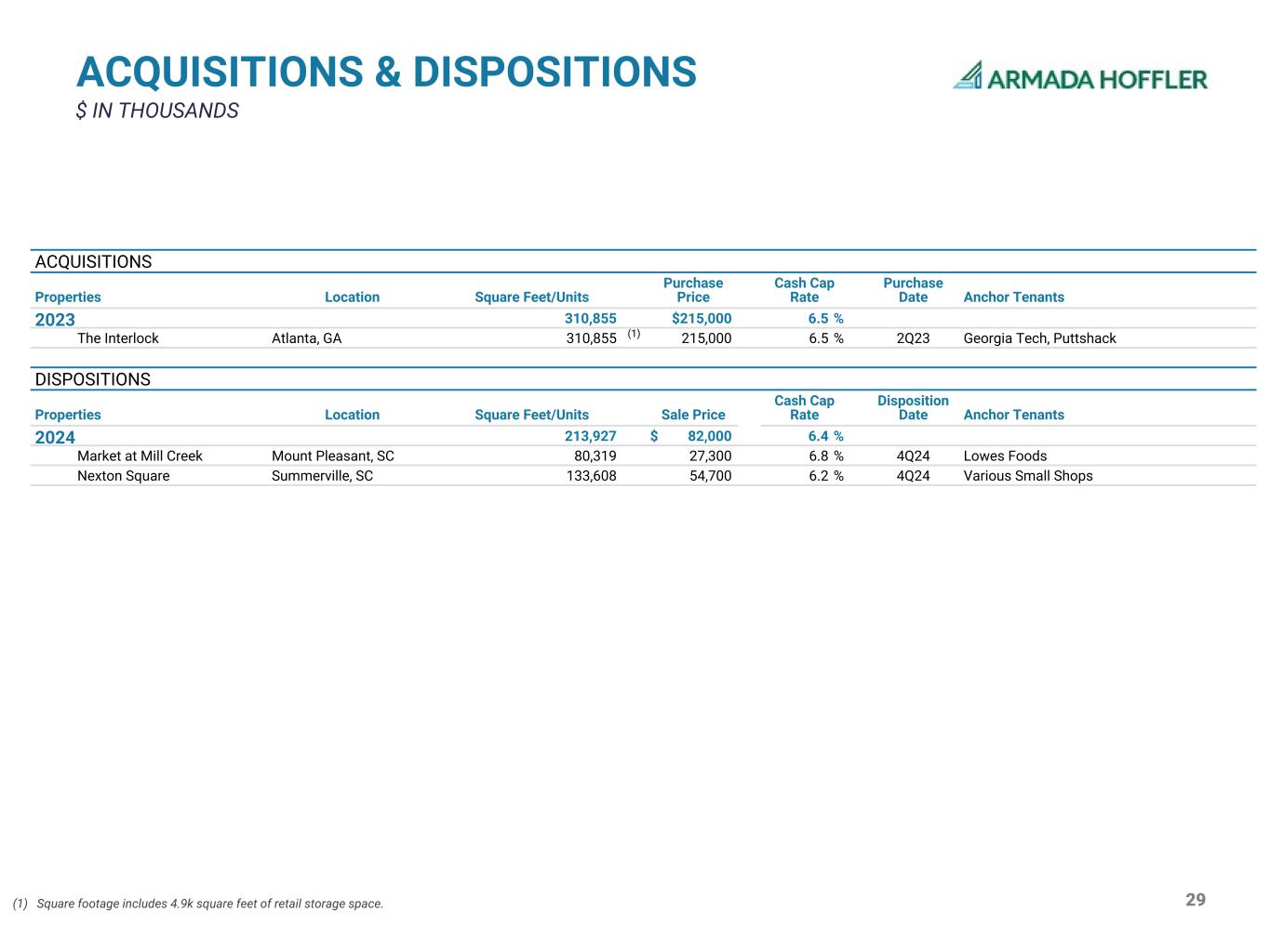 29项收购和处置以千美元计的收购物业位置平方英尺/单位购买价格现金上限率购买日期锚定租户2023310,855 $ 215,0006.5% The Interlock Atlanta,GA 310,855(1)215,0006.5% 2Q23 Georgia Tech,Puttshack处置物业位置平方英尺/单位销售价格现金上限率处置日期锚定租户2024213,927 $ 82,0006.4% market at Mill Creek Mount Pleasant,SC 80,31927,3006.8% 4Q24 Lowes Foods Nexton Square Summerville,SC 133,60854,7006.2% 4Q24各种小型商店(1)平方英尺包括4.9k平方英尺的零售存储空间。