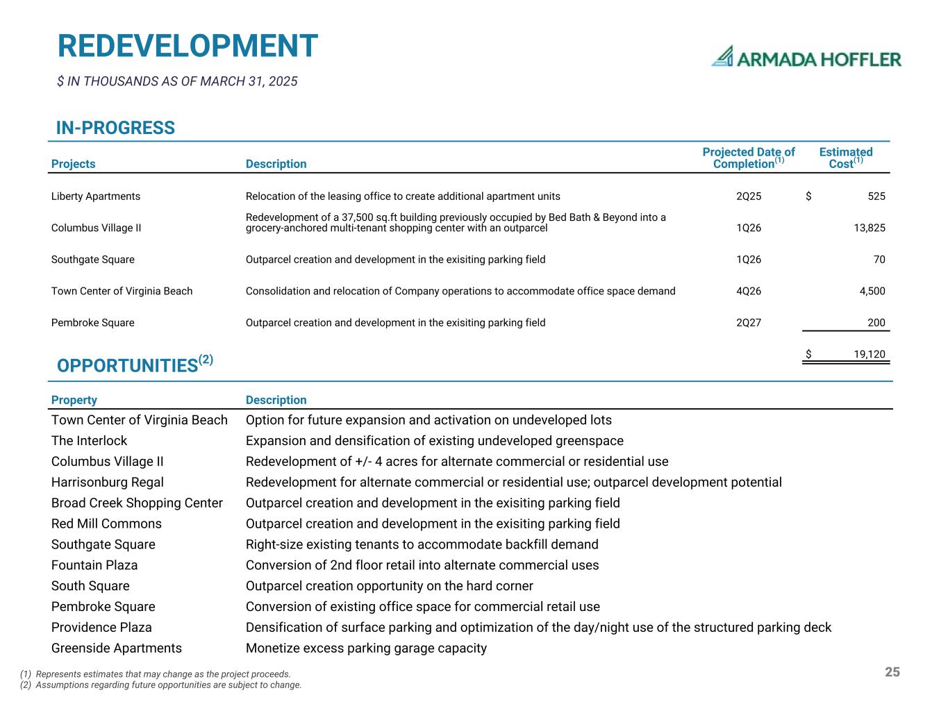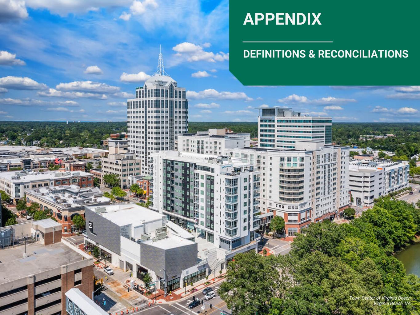 25个重建项目说明预计完工日期(1)估计成本(1)Liberty Apartments搬迁租赁办公室以创造更多公寓单元2Q25 $ 525 Columbus Village II将一座37,500平方英尺的建筑重新开发,该建筑之前由3B家居占据,成为一个以杂货为基础的多租户购物中心,外租地块1Q26 13,825 Southgate Square Outpackel在现有停车场创建和开发1Q26 70 Town Center of Virginia Beach整合和搬迁公司运营以满足办公空间需求4Q26 4,500 Pembroke Square Outpackel Creation截至3月31日,现有停车场的开发2Q27 200 $ 19,120 $以千计,2025年物业描述弗吉尼亚海滩镇中心可供未来在未开发地段上扩建和激活的联锁扩建和加密化现有未开发绿地哥伦布村II再开发+/-4英亩用于替代商业或住宅用途Harrisonburg Regal再开发用于替代商业或住宅用途;Outparcel开发潜力Broad Creek购物中心Outparcel创建和开发在现有停车场Red Mill Commons Outparcel创建及在现有停车场发展Southgate Square合适面积现有租户以容纳回填需求Fountain Plaza将2楼零售转换为替代商业用途South Square Outpackel创建机会在硬角彭布罗克广场将现有办公空间转换为商业零售用途Providence Plaza将地面停车致密化和优化白天/夜间使用的结构化停车甲板Greenside公寓将多余的停车库容量货币化在进行中机会(2)(1)表示随着项目进行可能发生变化的估计。(2)关于未来机会的假设可能会发生变化。