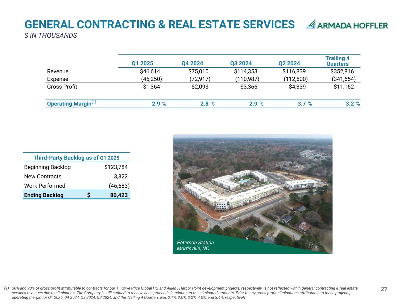 27 General Contracting & Real Estate Services $ in Thousands of Third Party Backlog as of Q1 2025 beginning backlog $ 123,784 new contracts 3,322 work performed(46,683)ending backlog $ 80,423 Q1 2025 Q4 2024 Q3 2024 Q2 2024 trailing 4 quarters revenue $ 46,614 $ 75,010 $ 114,353 $ 116,839 $ 352,816 expense(45,250)(72,917)(110,987)(112,500)(341,654)Gross Profit $ 1,364 $ 2,093 $ 3,366 $ 4,339 $ 11,162 Operating Margin由于消除,未反映在总承包&房地产服务收入中。公司仍有权就已消除的金额收取现金收益。在扣除这些项目应占的任何毛利之前,2025年第一季度、2024年第四季度、2024年第三季度、2024年第二季度和过去4个季度的营业利润率分别为3.1%、3.0%、3.2%、4.0%和3.4%。皮特森站Morrisville,NC