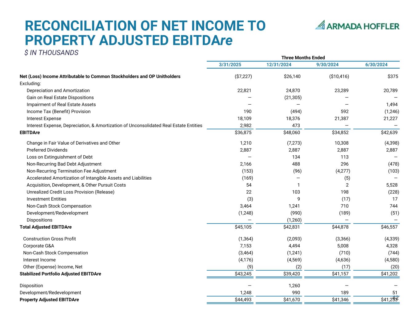42截至3/31/202512/31/20249/30/20246/30/2024归属于普通股股东和OP单位持有人的净(亏损)收入(7,227美元)26,140美元(10,416美元)375美元不包括:折旧和摊销22,82124,87023,28920,789房地产处置收益——(21,305)——房地产资产减值—— 1,494所得税(收益)准备190(494)592(1,246)利息支出18,10918,37621,38721,227利息支出、折旧、&未合并房地产实体摊销2,982473 —— EBITDA为36,875美元48,060美元34,852美元42,639美元衍生工具和其他公允价值变动1,210(7,273)10,308(4,398)优先股息2,8872,8872,887债务清偿损失— 134113 —非经常性坏账调整2,166488296(478)非经常性终止费调整(153)(96)(4,277)(103)无形资产和负债加速摊销(169)——(5)——收购、开发、&其他追求成本54125,528未实现信用损失准备(解除)22103198(228)投资实体(3)9(17)17非现金股票补偿3,4641,2417 10744开发/再开发(1,248)(990)(189)(51)处置——(1,260)——调整后EBITDA总额为45,105美元42,831美元44,878美元46,557美元建筑毛利(1,364)(2,093)(3,366)(4,339)公司G & A 7,1534,4945,0084,328非现金股票补偿(3,464)(1,241)(710)(744)利息收入(4,176)(4,569)(4,636)(4,580)其他(费用)收入,净额(9)(2)(17)(20)稳定投资组合调整后EBITDA为43,245美元39,420美元41,157美元41,202美元处置— 1,260 ——开发/再开发1,24899018951物业调整后EBITDA为44,493美元41,670美元41,346美元41,253美元净收入与财产调整后EBITDA的对账以千美元计