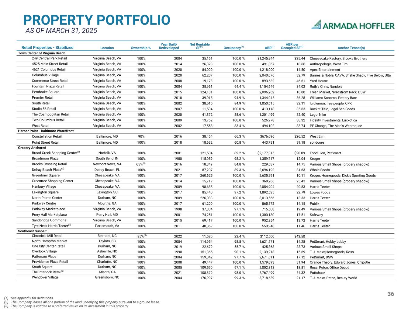 截至2025年3月31日的36个物业组合零售物业-稳定的位置所有权%年已建成/重新开发的净可租SF(1)入住率(1)ABR(1)ABR per occupied SF(1)Anchor Tenant(s)Town Center of Virginia Beach 249 Central Park Retail Virginia Beach,VA 100% 200435,161100.0% $ 1,245,944 $ 35.44 Cheesecake Factory,Brooks Brothers 4525 Main Street Retail Virginia Beach,VA 100% 201426,328100.0% 491,36718.66 Anthropologie,West Elm 4621 Columbus Retail Virginia Beach,VA 100% 202084,000100.0% 1,218,00014.50 Apex Entertainment ColumbusCAVA,Shake Shack,Five Below下的TERM0,Ulta Commerce Street Retail Virginia Beach,VA 100% 200819,173100.0% 893,63246.61 Yard House Fountain Plaza Retail Virginia Beach,VA 100% 200435,96194.4% 1,154,64934.02 Ruth‘s Chris,Nando’s Pembroke Square Virginia Beach,VA 100% 2015124,181100.0% 2,096,26216.88 Fresh Market,Nordstrom Rack,DSW Premier Retail Virginia Beach,VA 100% 201839,01594.9% 1,344,04536.28 TERM0威廉姆斯 Sonoma,Pottery Barn South Retail Virginia Beach,VA 100% 200238,51584.9% 1,050,VA 100% 200711,594100.0% 413,11835.63 Rocket Title,Legal Sea Foods The Cosmopolitan Retail Virginia Beach,VA 100% 202041,87288.6% 1,201,49932.40 Lego,Nike two Columbus Retail Virginia Beach,VA 100% 200913,752100.0% 526,97838.32 Fidelity Investments,Luxxotica West Retail Virginia Beach,VA 100% 200217,55883.4% 494,10233.74 PF Changs,男人服饰 Harbor Point-Baltimore Waterfront Constellation Retail Baltimore,MD 90% 201638,46464.3% $ 676,096 $ 26.52 West Elm Point Street Retail BaltimoreVA 100% 2001121,50489.2% $ 2,177,315 $ 20.09 Food Lion,PetSmart Broadmoor Plaza South Bend,IN 100% 1980115,05998.2% 1,359,71712.04 Kroger Brooks Crossing Retail Newport News,VA 65%(3)201618,34984.8% 229,53714.75各种小型商店(杂货影子)Delray Beach Plaza(2)Delray Beach,FL 100% 202187,20789.3% 2,696,19234.63 Whole Foods Greenbrier Square Chesapeake,VA 100% 2017260,625100.0% 2,635,29110.11 Kroger,Homegoods,迪克体育用品 Greentree购物中心Chesapeake,VA 100% 201415,719100.0% 368,26623。VA 100% 2009年98,638100.0% 2,054,90420.83 Harris Teeter Lexington Square Lexington,SC 100% 2017年85,44097.2% 1,892,53522.79 Lowes Foods North Pointe Center Durham,NC 100% 2009年226,083100.0% 3,013,56613.33 Harris Teeter Parkway Centre Moultrie,GA 100% 2017年61,200100.0% 865,87214.15 Publix Parkway Marketplace Virginia Beach,VA 100% 199837,80497.1% 715,50819.49各种小商店(杂货影子)Perry Hall Marketplace Perry Hall,MD 100% 200174,251100.0% 1,300,13017.51 Safeway Sandbridge Commons Virginia Beach,VA 100% 201569,417100.0% 952,VA 100% 201148,859100.0% 559,94811.46 Harris Teeter Southeast Sunbelt Chronicle Mill Retail Belmont,NC 85%(3)202211,53022.4% $ 112,500 $ 43.50 North Hampton Market Taylors,SC 100% 2004114,95498.8% 1,621,57114.28 PetSmart,Hobby Lobby One City Center Retail Durham,NC 100% 201922,67955.7% 425,86833.73各种小商店俯瞰北卡罗来纳州阿什维尔村100% 1990151,36590.1% 2,139,21315.69 T.J. Maxx | Homegoods,Ross Patterson Place Durham,NC 100% 2004159,84297.7% 2,671,61117.12 PetSmart,DSW Providence PlazaChipotle South Square Durham,NC 100% 2005109,59097.1% 2,002,81318.81 Ross,Petco,Office Depot The Interlock Retail(2)Atlanta,GA 100% 2021108,37998.0% 5,767,49954.32 Puttshack Wendover Village Greensboro,NC 100% 2004176,99790.3% 3,718,63921.17 T.J. Maxx,Petco,Beauty World(1)定义见附录。(2)公司依据地租租赁该物业所依据的全部或部分土地。(3)公司有权就其对该物业的投资获得优先回报。