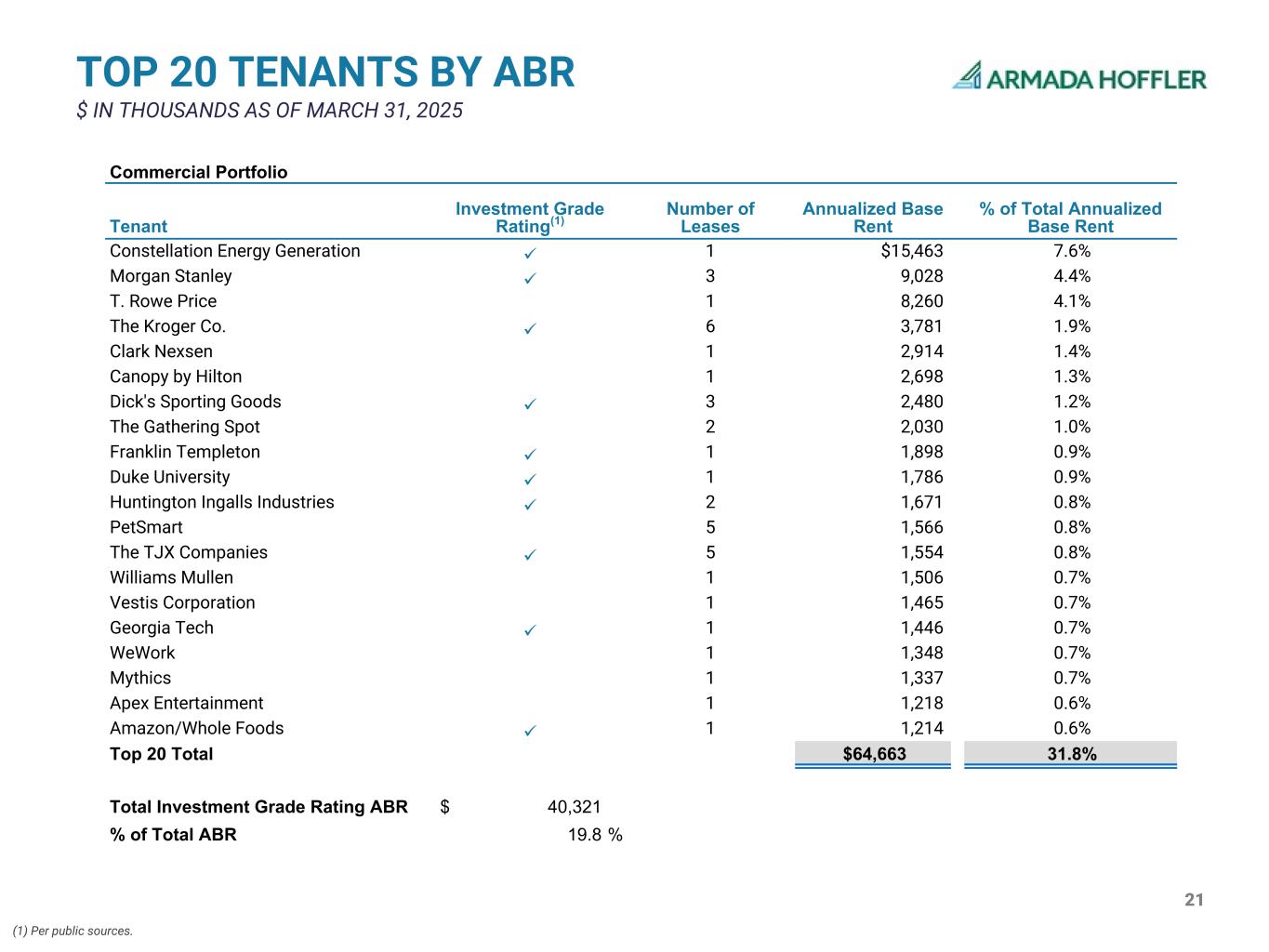 截至3月31日按ABR美元计算的21家排名前20的租户(以千人计),2025商业投资组合租户投资级评级(1)租赁数量年化基础租金占年化基础租金总额的百分比Constellation Energy发电ü 1 $ 15,4637.6% 摩根士丹利 ü 39,0284.4% T. Rowe price 18,2604.1% 克罗格TERM2 Co. ü 63,7811.9% Clark Nexsen 12,9141.4% Canopy by Hilton 12,6981.3% 迪克体育用品 ü 32,4801.2% The Gathering Spot 22,0301.0% Franklin Templeton ü 11,8980.9% Duke University ü 11,7860.9% 亨廷顿英戈尔斯工业 ü 21,6710.8% PetSmart 51,5660.8% The TJX Companies ü 51,5540.8% 威廉姆斯Mullen 11,5060.7% Vestis Corporation 11,4650.7% Georgia Tech ü 11,4460.7% WeWork 11,3480.7% Mythics 11,3370.7% Apex Entertainment 11,2180.6% Amazon/Whole Foods ü 11,2140.6% Top 20 total $ 64,66331.8% Total investment grade rating ABR $ 40,321% of total ABR 19.8%(1)per public sources。