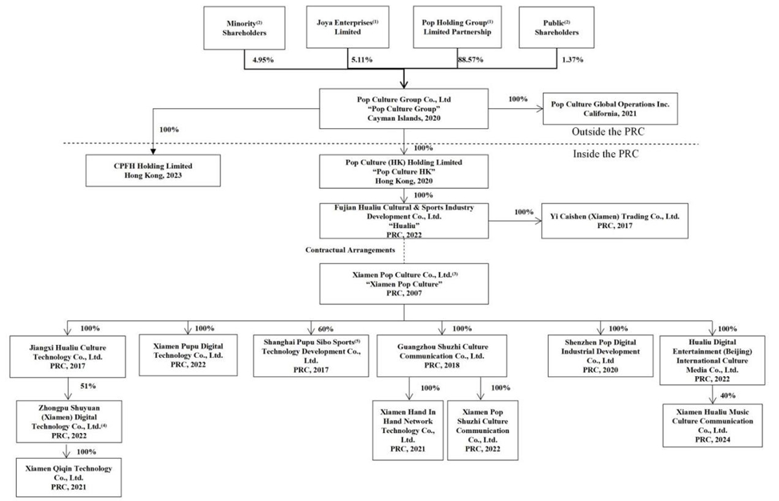 我们是一家在开曼群岛注册成立的控股公司,而不是一家中国运营公司。作为一家控股公司,我们自己没有实质性业务,我们通过VIE及其在中国的子公司开展业务。出于会计目的,我们通过某些合同安排(“VIE协议”)控制并获得VIE及其子公司业务运营的经济利益,这使我们能够根据美国公认会计原则(“美国公认会计原则”)在我们的合并财务报表中合并VIE及其子公司的财务业绩,并且该结构涉及投资者的独特风险。我们评估了财务会计准则委员会会计准则编纂810中的指导意见,并确定出于会计目的,我们被视为VIE的主要受益人。我们在此次发行中提供的证券是开曼群岛的离岸控股公司普普文化集团的证券,而不是VIE或其在中国的子公司的证券。VIE结构为中国法律法规禁止对运营公司进行直接外国投资的中国公司的外国投资提供合同风险敞口。有关VIE协议的描述,请参阅“招股说明书摘要—我们的公司Structure — VIE协议。”由于我们使用VIE结构,您可能永远不会持有VIE或其子公司的股权。