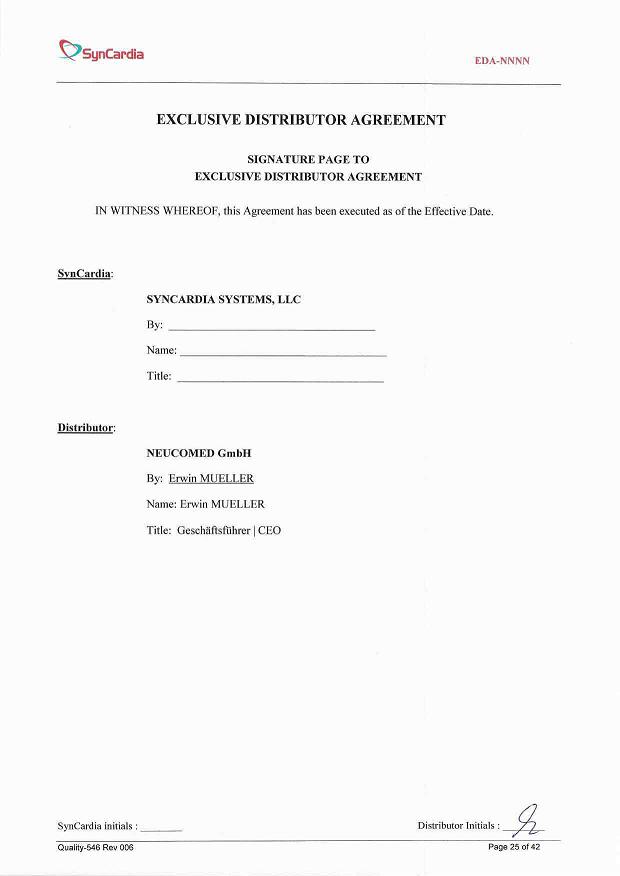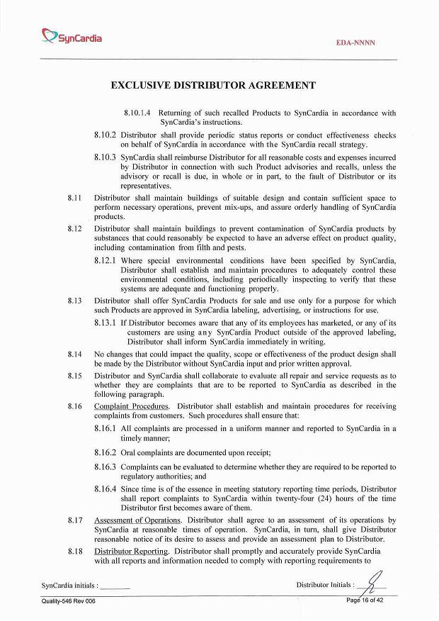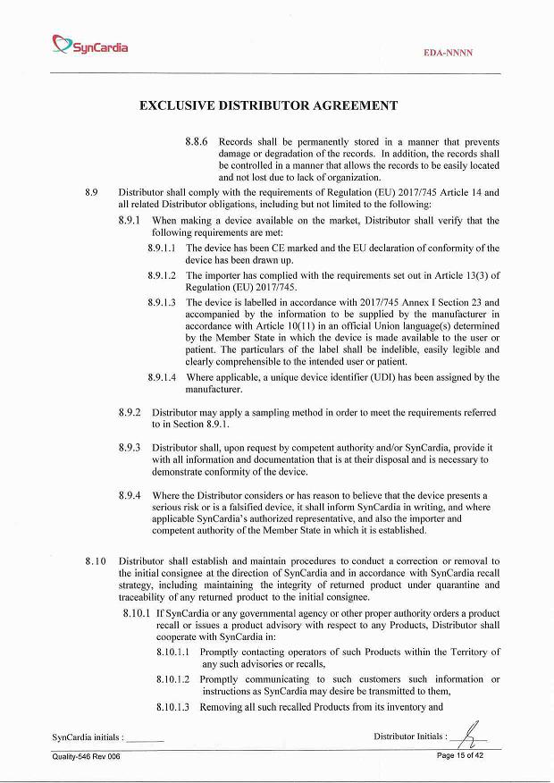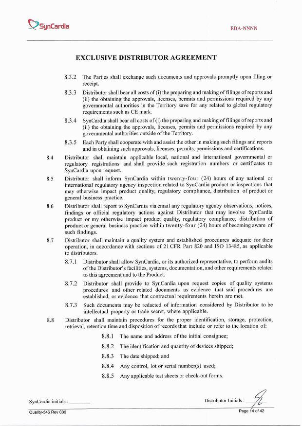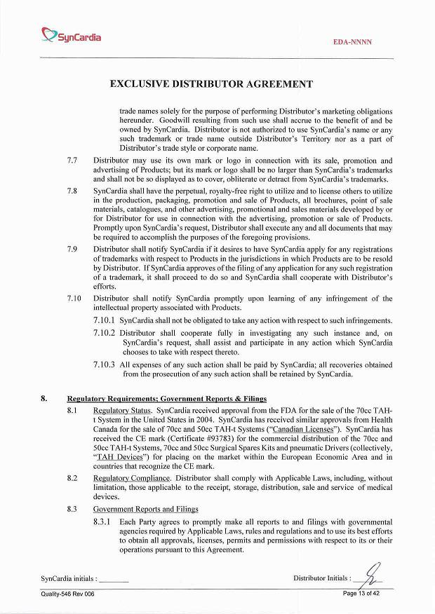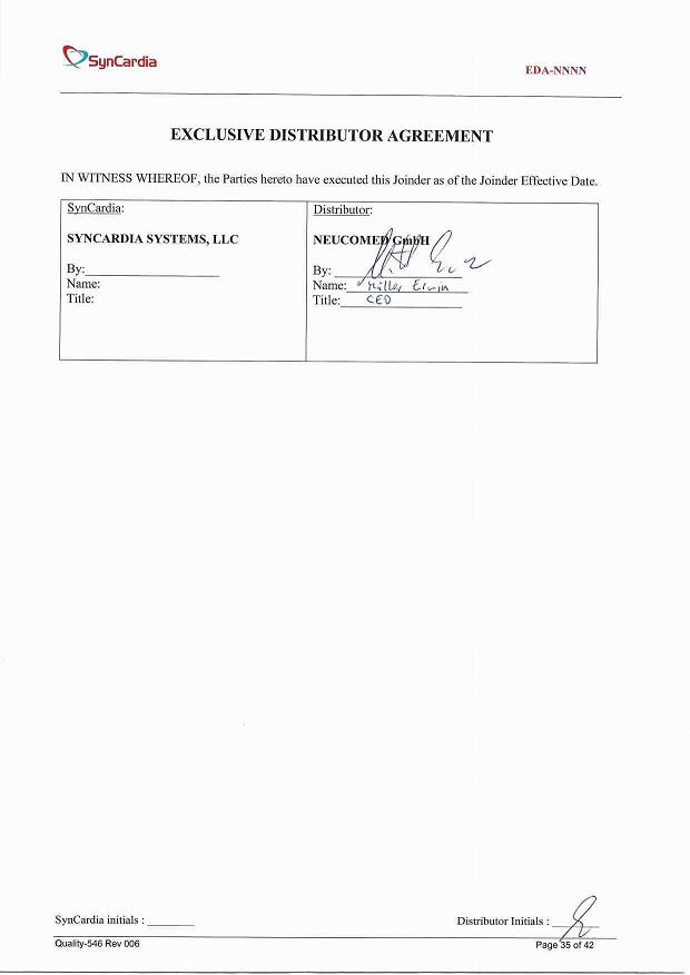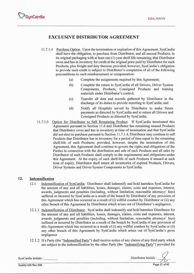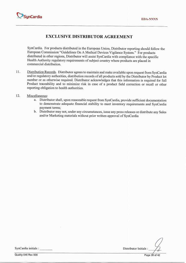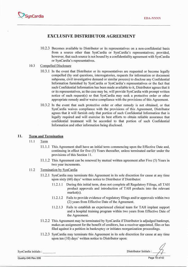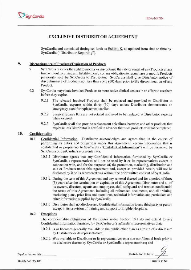 SY n Car d i a s y n c a r d i a i n i tia l s:_ Page 17 of 42 Quality-546 R ev 006 ED A-n n n n n e x CLU s IVE DI S T RIBUTOR Agreement Sync a rd ia and a. SSoc i t e d timi n g set for t h as 附件 k,由SynC a rdia(“D i s t tibutor re p o rtin g”)从t i me更新为t i r n e。9.停产prod u c t s fe x盗版产品9。1 S y n c a r d:i a r es e r ves the r i g h t o modi f y or d i scontinue the sale o r r enta l of any products at any time with l 10 u t inc u r r i ng any lia b il i ty thereby o r any o b l igat i o n t o r ep u r chase或修改P io d u cts先前s o l d b y syncard i a to d i s t r ibut o r。Sync a rd i a sh a ll g i ve d ist r i b u t o r n o t ice of d isconti n ua n ce of prod u ct n ot l ess than sixty(60)days p r i or to the discontinuation of a n y p r o d u ct。SynC a rd i a may rotate [ n v oic e d pr o d u ct to m ore a c tive c l i n i c al c e n t ers. in aa e:ff o 11:to u s e them befo r e t h ey e x pir e。9.29.2.1T h e r e l eased i n voic e d products s halJ be m p laced r u 1 d p ro v i ded to d i distributor at sy 11 card ia exp e n se w i t h in thir t y(30)days unless Distrib u tor d emonstrat e s. a n e m e r g e n cy n e e d for r e p l acem e nt earlier。S ur g ical SP a r e s kits a r e not r o t a t e d and need to b e r e p l ac e d at Distribu t o r e x pense wh e n e x pi r e d。S y n c a rdia s hall also pro v i d e r e placem e n t d r ivel i 11 e s,b a tteries and other p r o d u cts t h at e x pire,除非分销商i s在d v ance中通知s u c h p r o d u cts不会被r e p l aced。9 .2 .2 9.2 .3 1 0.Confidentialitv 10.1 Conf i dential l n f o rm a t i。0 11 .D i s t r i butor a c knowledge es a nd a g r ees tha t,in the c o t irse of p erfo i mi n g i t s duties and obligations u nder th is agreemen t,c e 1 tain inf o rmation that is confidential o r proprietary to SynCardia(“Confidential Information i o n”)wilJ be fm:nished b y syn _ card ia o r s y n c a r di a ' s repr e sentatives。1.D i s t ribu t or agrees t ha any conf i d e n t i al information furnished b y sync a rd ia o r syncard i a ' s repr e sent a tive w ill not be used by it or i ts repr e senta t ives e x cept in c o nne c t i o n w i th,and f o r the p u r p o ses o f,the prom o t i o n,mark e ting,d istri b u tion和s a l e or。P r o d u c t s在此Agre e m e n t an d下,除非提供了h e r ein,否则wi将不会是d i s c l os e d b y i t或其r e p r e n tatives w i t h o u t the pr i o r w r i tten同意SynC a rd i a。2.Du r i n g the term o f this a g reem e n t and any renewal t h ereof and for a p e r i o d of t l u·ee(3)ye a r s after t he t e rination or ex p ir a t i on o f th i s agreemen t,d i s t i-ibu tor and al l of its o winners,d i r e c t o r s,代理商和员工s h all safe g uard and t r eat as c o n fidenti a l the tenns of this Agreement,i n c l ud i n g a ll r ef e r e 11 ced document s,and a lJ training,m a r k e t 1 ng plan s,pr i ce l i s ts a nd q u o tati o ns,技术信息a nd part i c u l a r s and ot h er i n:fo n nat i on由S y u c a rd i a提供。3.D i s t ribu t o r sha II n o t d i sclose a n y c o nfi d e n tial infor m a t i on t o any third p a r ty or person exc e pt in i t s provision of training and s u pport t o eligible h o s pita l s。Excep t i ons t h e c o n fiden t i a lity o b l i ga t离子的Distr i b u tor unde r第10节。1 do not e x tend to a n y conf i d ential 1 n formation furnish e d by syncardia or syncardia ' s represent a tive that:1。I s o r b e c o m es usually availabJe to the publ i c o t h e r than as a r e s ult of a d i s c l osure by d i stri b utor or or its repr e s e n t at i v e s;2。W as a vaila b. l e t o di s trib u t o r o r i t s re p r ese ntati v es o n a non-c o nfi d en t i al b a s is p 1-ior to its d isclosure th. e r eto b y synca r d i a o r sync a rd i a ' s r eprese n t a t i v e s;a 11 d 10。2