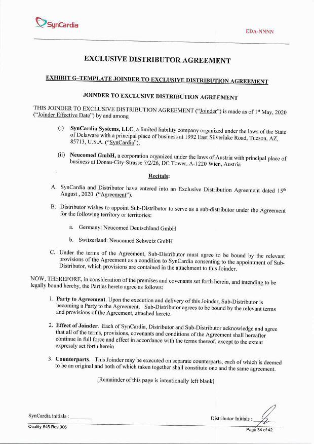 SY n Car d ia Qua l it y-546 Rev 006 EO A-N N N N EXCLU S IVE DISTRI B U T或协议展览g-模板JOIN D ER to EXCL U SIVed I S T RIBUTION Agreement JOIN D E R to Exclusive D I STRI B U TION Agreement this J oinder to Exclusrve DLSTRL B UTION Agreement(“J o i nde r”)i s made as of!ST Ma Y,2020(“J oind e r Effect v e i d a t e”)by a nd a m o n g(i)S y nCard ia Systems,LL C,a limi t ed l i a b ili t y c o m p any organized un d er tbe l aws of the State of D e l aware wi t h a prin c i pal pla c c e of business at 1992 East Silve r l ake roa d,tucso n,a z,8571.3,美国(“S Y n Car di a”),(ii)Neucomed G m b b,a c o r p o rat i on o rgan i z e d under the l a w s of a u s t ria w ith pr i ncipa l pl a ce of b u s i n ess at Donau-ci t y-stra s e 7/2/26,DC t ow e r,a-1220 w i en,奥地利独奏会:A. SynCar d ia a n d d i s t r i bu t o r 1,a v e entered i n to an exc l u s i ve d i stribut i on a g r e e e m ent dated·1 5th a ug u s t,2020(“a greement”)。B. Di s tributor wi s bes委任S ub-D i distributor服务As a s ub-d i stri b u t o r under the Agreement nt f o r t b e f o ljowing t e rrito r y o r t e ritori e s:a. g e r m any:n e u c o m e d d euts c h l a nd g m bh b. SW i t zerland:neuc o m ed Schweiz G mbH C. u n d e r the terms of the agr e em e n t,Sub-Dist r ibutor m ust同意受Ag r ee m e nt的r e l eva n t prov i s i. o n s的约束,作为a c o nd i t i o n to S y n c a rd ia cons e nti n g to the appointment of Sub Di s tributo r,which h provisions are contained i n the atta c h m ent l o this J oind e r。现在,因此,考虑到前提和covena nt s提出了he r ein,并打算被le g a l l y bound。hereb y,t h e Part i es he r e t o a g r ee a s fouows:i.当事人同意t. U p o n t h e execution a n d d e l i very of th i s joinde r,S u b-D i s t r ibutor正在成为一个P a 1 ty t o the agr e e e m ent。Sub-D i stri b utor ag r ees l o be bound b y t h e r elev a n t terms and provision s of the Agreement,atta c h e d h eret o。2.Joinder的效果。每个o f syncardi a,distributor a n d su b-d i st ribu t o r承认并同意,所有th e e r ms,prov i s ion s,covena i 1ts和c o nd i ti o n s of t h e agreement s hall h ereafter continue i n full force and e effect i n acc o rda n ce with terms t h ereof,除了t o t h e程度e x pr e ssly集f o 1 t h h e r ein 3。同行。T H i s Joinder may b e exe c u l ed on separate counterparts s,each of w h i ch i s d e e m e d to be an o r i g i n a l and b oth of which took t ogether s hall c o n stitute one and t h e same agreement。[ R em a i nd e r of this pa g e i s intent离线留白] Sync a r d ia initials:___