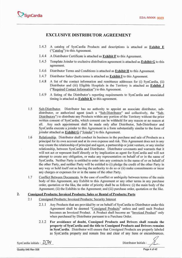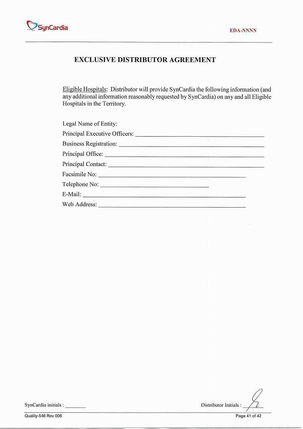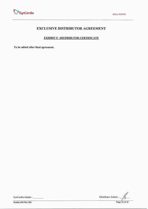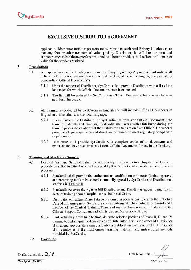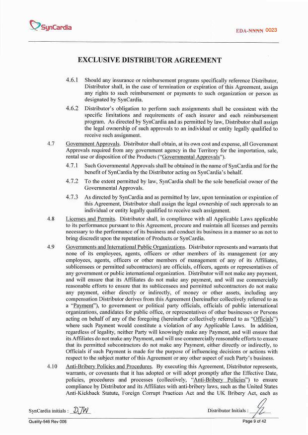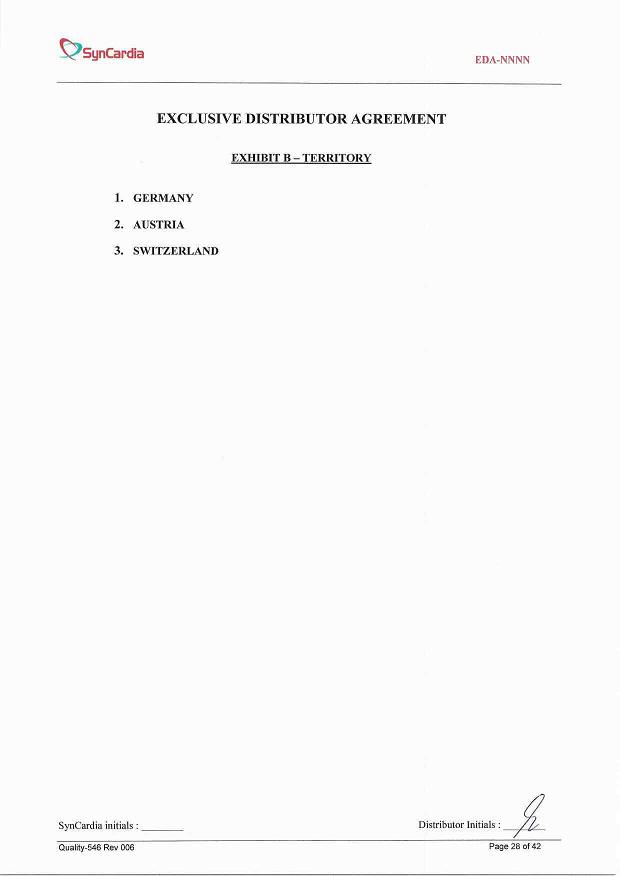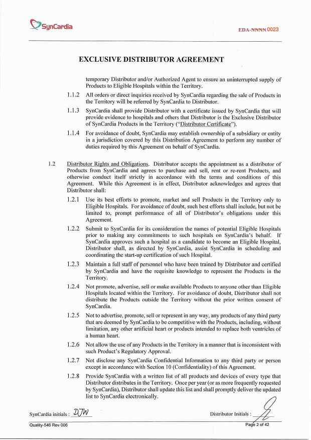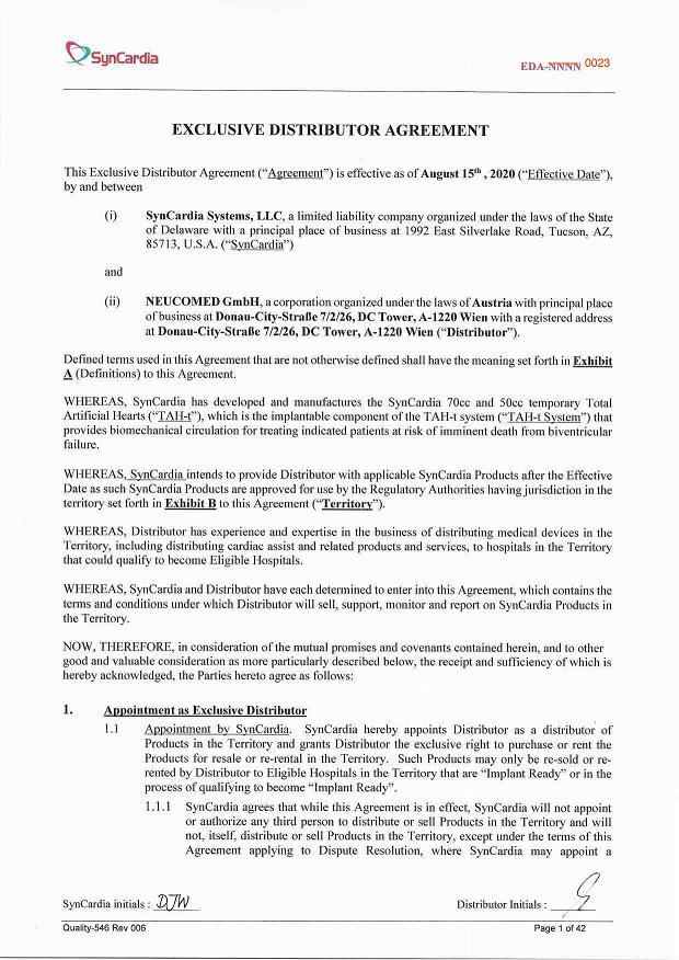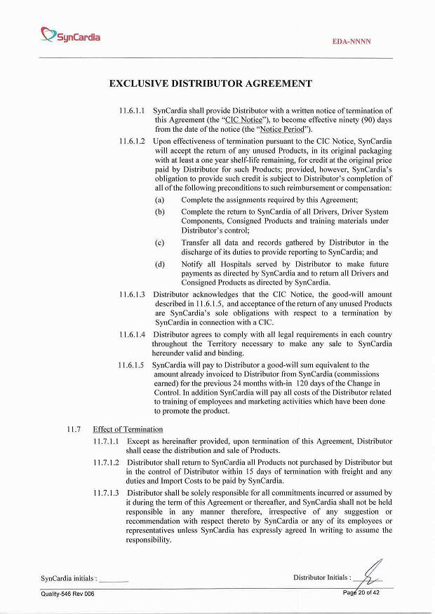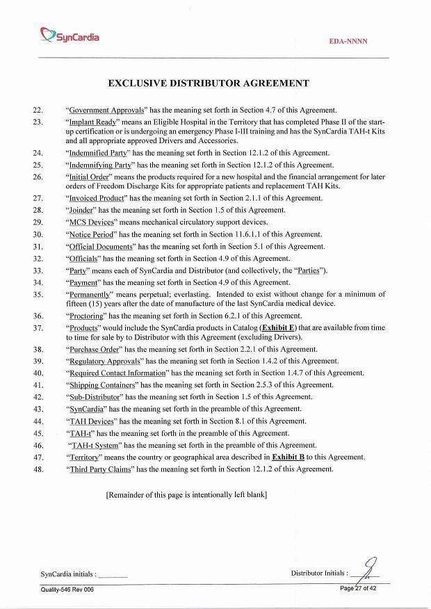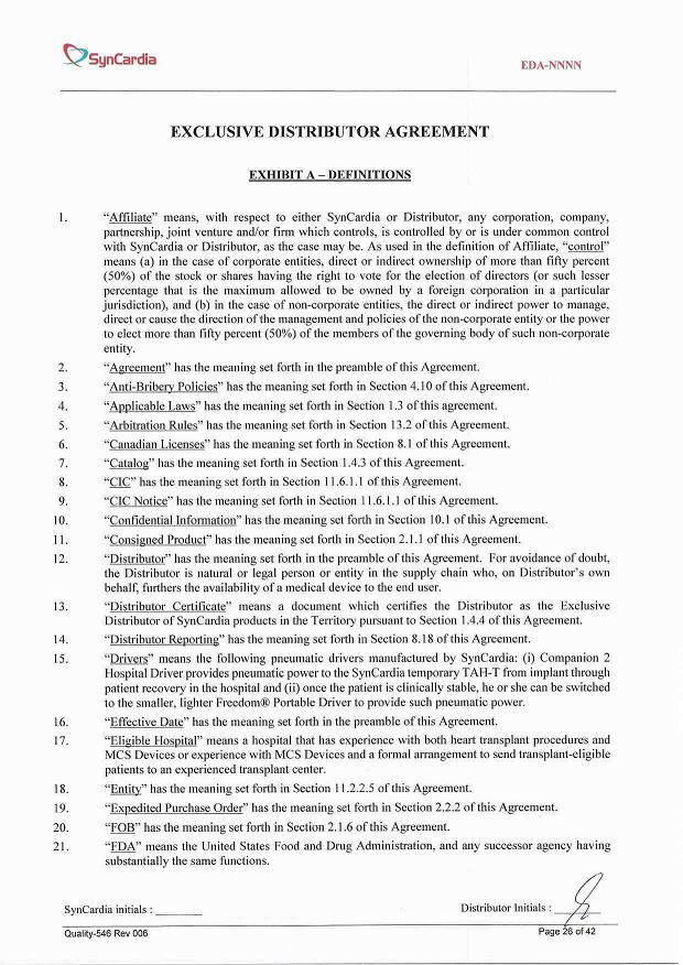 Syn C ar di a Page 26 of 42 Qu A.Lity-546 Rev 006 EDA-NNNN E X CLUSIVE D I S TRIBUTOR A GREMENT Exhibit A-D EFIN I TLONS L. " Affil i a te‘’means,w i t h relative to ei t h er Synca r d i a o r d i s t r i bu t o r,any corporati o n,c o m p an y,partnership,联合通风口u r e和/或fi r m which c o n tr o l s,i s controlled by or is under common control with SynCardia or Distributo r,a s the case m ay b e。A s用于Aff i l i ate的t he d e finition,“con t r o l”是指(a)in t b e c a se of corporate en t i t ie s,d i re c t or i ndire c t o w n er s h i p of m o re than f i fty %(50%)of the stock o r s h are s having the rig h t to vote for the e l ection of d irectors(or such l esser p ercentage that is the maximum a l l owed to be owed by a foreign corp o r ation i n a JJar t i cuJar juri s diction),a n d(b)in the ca s e of non-corporate enti t i e s,the dir e ct o r ind i r e ct power to m anag e,direct or c a u se the direction of the management a nd p o l i c i e s o f t b e non-corporate entity or th e power to elect m ore tban 50%(50%)of the m e mbers of the governing body of su c h n o n-corpor a te en t i ty。" a greement‘’h a s the mea 11 ing set f o r t b in tbe pronember of tbis agreement。tbjs协议第4.10节中规定的“a t 1 t i-bribery policie s”li a s t he meaning。“适用L AWS”在t h i s a g reement的S ection 1.3中具有为t h设置的tbe含义。“AR b i tration R ul e s”has t h e m ea:n i n g set for t h i n section L 3。2 of this A g r e e m ent。“c a n adian l i cense s”b作为本协议第8.1节中的m e aning set f01th。“C atalog”b a s t h e m e a ni n g载于SE c tion 1.4.3 o f t his agreement。“C I C”在l L.上有m e a n i n g集f o 1th i l 1 8ect i。6.1.1这个Agre e m e n t.“C I C No t i c e”有S e ct i于11.6提出的me a 11 ing。1.1of lh i s a g r e e m ent。“Confide n tia l i nformatio n”在t b i s agr e em e n t的第10.1节中有t h e的含义s e t f o 1 i h。“C o nsigned produc t”11 a s secti <;> n2中提出的m eaning。1 .一、本协议。“d istribu t o r”has the meaning s e t forth i n t h e p r eamble of t b i s agreement for avoiding doubt,tbe d istributor i s n atu r al o r l e gal p e r son or en t i ty in the supply c h a i n wh o,o. n d. i s t ributor's o w jl behal f,f u r thers the avail a bil i ty of a m e d _ i c a l device to t h e end user。“D iDistributor Cer t i Fi c a t e”是指证明d 1 e distributor为t h e ex c l u s i ve d i distributor of SynCard i a produ c ts b,the TED " itory pu r s u a nt to Section 1的文件。4 .本协议4。“Distributor Rep 0 1 t ing”有第8节中规定的m e a ni n g。18 o f th i s协议。" Driver‘’是指SynC a rdi a制造的fo l l owns p n eUmatic drive r s:(d c o m p a n i on 2 h ospital Driver通过医院的患者r ecovery向i m plant的SynCardia temp o rary t a h-t提供p n e um a t i c pow e 1·和(ii)一旦i ca l y sta b l e中的p a ti e n t i s c l,h e或s h e可以是s w i tched to t h e s maller,li g h t er f r e e dom®端口a b le dri v er t o pro v i d e such p n eUmatic power。“e effective Da. t e”bas the me a ni n g set in the pre a m ble of this a g r eeme n t。“E ligible H o s p i t a l”mea n s a ho s pital that has experience both herut t r a n s p l a n t procedur e s and MCS devices or e x perience w ith m cs d e vices a nd a formal an-an g ement to s e nd transplant-e l i gible patients t o an exper i ened transplant ce n t er。“e ntitv”有第1节1中阐述的含义。2 .2 .t h的5是协议。“E x pedited purch a se o rder”在第2节中具有均值i ng s e t f o 1 th。2 .2 o f this a g r e e m e n t。“F O B”h作为第2节中的m e a n ing set fortb。1 .6 of th i s a g reement。“F D A”m eans the U n i ted S tates food a n d drug a dm i nitration,a nd any suc c essor a g ency has st i b s tantia l ly the same f u nc t ions。2.3.4.5.6.7.8.9.1 0.1 1.1 2.13.14.1 5 .1 6 .17.18.1 9'.20.21.SY1 1 Card i a initials:_ distributo,initials,(j7 i