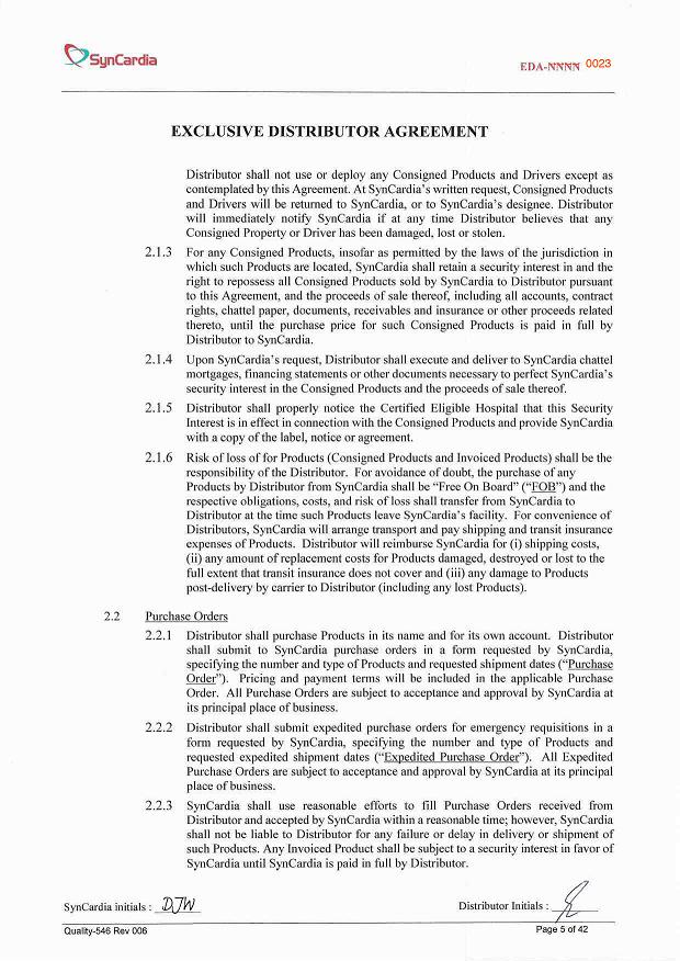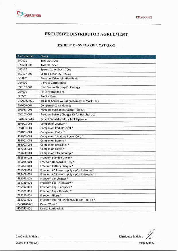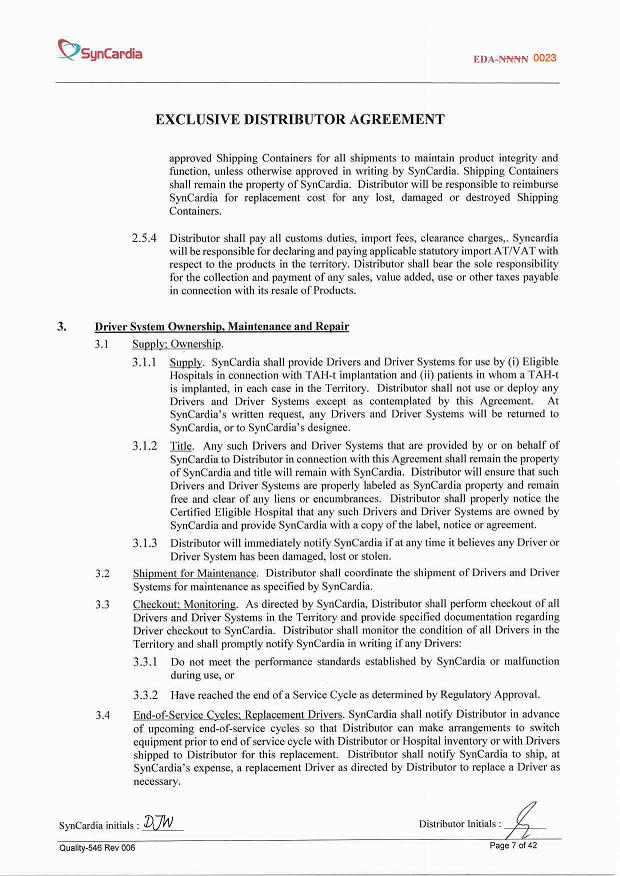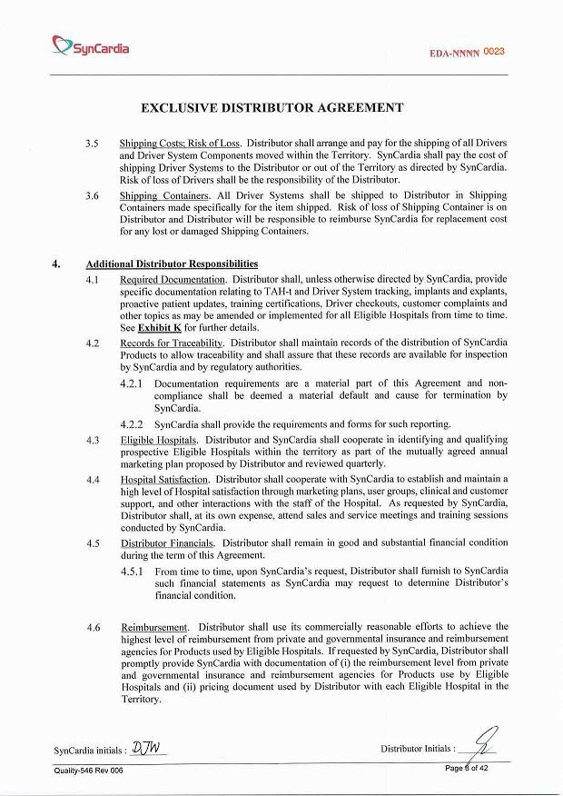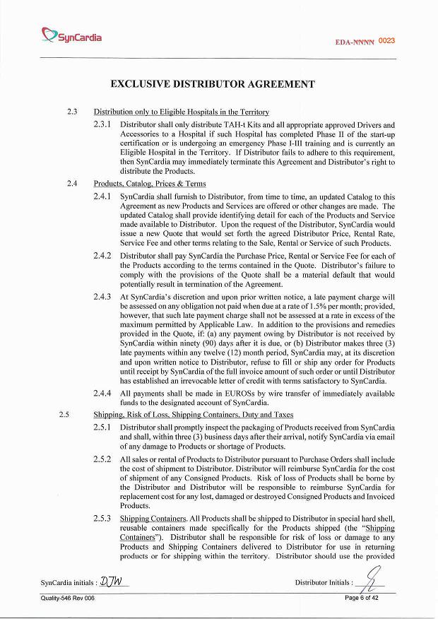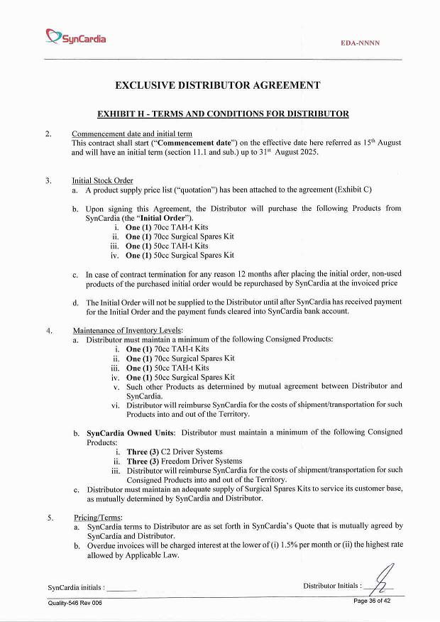 t‘丨’syn C ar di a e d a-n n n n n ex c lusive DIS t ribut o r a g reement exhi b it h-terms and c o nd i tions for DIS t ributor 2。Comment m e nt d a t e and ini t i al t e r m this contract s hall sta r t(« c om m encement dat e ")o n i:he effective d a te here r ef e m,d as 15th a u g u st and w i ll h a ve an initial term(section 1 1.l a nd sub.)截至2025年8月31日151日。3.1nitial股票订单a。A product s upp l y pri ce l. i st(“q u ot a t i o n”)h a s has been attached to th e-agre e m e n t(ex h i b i t c)b. U pon sig n ing t h i s agreem e nt,t h e d is t r i but o r wUI purchase the f o l l l owing produ c ts from synca r d i a(“initial orde r”)。1.O n e(1)70 CC TA H-t套件i i。一(1)70ce Surgica l Spare Kit ru。一(1)50 cc t A H-t Kits 1 v.一(1)50cc s u r gic al s pares kit c. la case of c o n tract t t e r m in a t i o n f o r any r eas o n 12 mon t h s after p l acin g the imtial o r der,购买的初始订单的no n-u s ed p r o d u ct将是r e p u r c ha s e d b y synca r d a at t h e invoiced p rice d。Lnitial Order w iU not b e s up p l ied to the distributor un til aft e r SynC a r di a ha s received p a y m ent f o r the in i t ial o r der and the payment f 1 m d s cleared in t o syn c r o·d ia b a n k acc o u nt。4 .M a intenance of fn v entory L e ve l s:a. d i s o·i bu tor m u st maintains a min i m um of the f o ll o wing Co n si g n e d pr o duc t s:t. o n e(1)70 cc tah-t ki t s i。一(1)70 c c s u r gical s par e s k i t m。一(1)SOCC TAH-T K i t s iv。一(1)50cc surgi c al sp a r e s k i t v. s uch other pr o d u ct由mu t 1 1al协议betw e e e n n di s tribu t o r和sy n c a r d i a. v 1确定。D istr ibut or will r e i mbu r se synca r dia f o r the costs of s h i pment/tra n s p orta t i on f o r s uch pr o d u cts.into a n d o u t of the territory. b. S ynCardia拥有U nits:d i str i bu t o r must m a i nt a i n a miL1i m u m of the following c o n s i gn e d product s s:1。T hree(3)C2 dri v e r syst e m s 11。三(3)F r eedom dri v er systems i i i i。D i s tr i b u tol'wiU r e imbu r se syqcardia f o r the costs of shipping/transportation f o r s uch consigned prod u cts into and out the territory. c. Di s tributor m u s t ma i tain an adequ a te s upply of s urg i cal sp a r e s kits c u stomer bas e,As mutu a l l y d et e ani n ed by S y n CA r d i a and distributor。5.PR i cin g(f erms:a. SynCardia t e r ms t o Distributor is as set fo rth in SynCardia ' quote t h at is mutual l y a g r eed b y sy u cardia and d i s t ribu t o r. b.逾期发票w will be ch a r g e d interest at t he l ow e r of(i)l.5 % per m o n th or(i i)t h e highest rate allowed b y applicable law。SynCar d i a initia l s:_ d ist r ibutor jnit i alsc i z quality-546 rev 006第36页,共42页