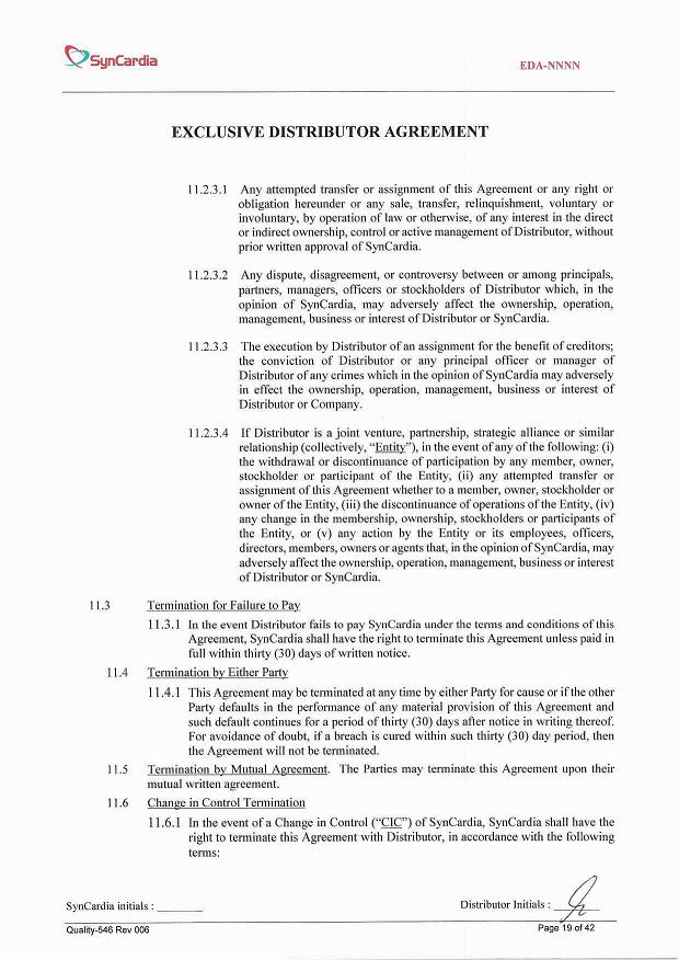 SY n Car d i a rn,TDBUTOR JNIT;AL:-1.。SynCardia i n i tials:_。/p年龄19 of 42 Qua l ity-546 Rev 006 EDA-N NNN独家DIS T RI B UT O R A G REEM E NT 11.2。3. 1任何企图tra n sf e r或thi s的受让人同意m e nt或本协议项下的任何权利或义务或任何出售、tr a nsfe r、放弃、voluL 1自愿或非自愿、通过操作o f法律或o t h erwis e、直接或indi r ect所有权、contr o l或积极管理Dist r iboto r的任何i利益,未经SynC a. rd i a事先书面批准。1 1 .2.3.2任何di s pute,d i s a greemen t,或controv e r sy be t ween or among principal s,p a rt n e r s,manage r s,officers or stockh o l ders of distributor which in the op i n i on of SynCard ia,may adversely affect t he ownership,operatio n,managemen t,b u s in e ss or i n tere s t of distributor o r S y n c a rdi a。1 1 .2.3.3 T I 1 e由分销商执行i on on a s mission f o r the b e nefit of cred i tors;SynCard IA的定罪o f分销商或任何PR i ncipal官员或任何cri:m e s wh i c h i n·tbe意见可能对Distiibutor o r Company的ownershi p、operation、management、b u s in e s o r i nterest产生不利影响。1 l.2.3.4如果D i str i butor i是合资企业e、prutnership、str a. tegic联盟或类似关系(c o l l ectivel y,“实体y”),i 11 tbe的aoy事件如下:(i)t h e退出o r终止参与任何membe r,o w n e r,s tockholder ot p a 1 ticjp a nt of the entit y,(ii)任何ttempt e-d转让或转让第i s协议where e r给m e mbe r、拥有e r、s t ockholder或实体的所有者,(i i i)discon t inu a nce of the entity operations,(iv)t he membe r s hi p、ownership、stockh o l d ers或pa:rtki pants of the entt i t y的任何变更,o r(v)实体或其雇员、高级职员的任何行动,dire c tor s,member s,o w ners OT a g ents that,in the opinion of S y n cania,m ay advers e l y affect the own e rship,op e r a t i o 1:i,,manage m ent,b u s i ness or interest of Di s tributor or s:yn c arclia。11.3终止F ai l ure to pay 11。3 .1在事件D i的出押人fai i s根据t e m 1 s和th i s agr e emellt的条件向Syncardia付款时,Sync a rdia s hall有权在书面通知的t h irty(30)天内终止本协议unl e s全额付款。Tenninaj,ion b y either pqrty 11。4. l t h i s协议可随时因cau s e或i f在履行本协议的任何事项i aJ条款时的其他pa 1 ty d e过失而由eith e r par t y终止,并在通知u 1 writs u 1 g of them后的三十(30)da y s期间终止。For avo i d ance of doub t,. If a breach i s cured within such thi 1 ty(30)day p erio d,then the agreem e nt wijJ not be term i. nated。经双方协议终止。T H E双方可在相互wri t ten a g,i-e e e.ment后终止本协议。Ch a n g e in contr o l tennination 11。6 .1 In t b. e e vent of a C han g e in Con t r o l(' C I C ")of SynCardia,SynCard ia SBAU has the right to term i nate this agreement with。Di s tributo r,according to w i t h the f o l l o w i ng terms:] 1.41 1。5 i 1。6