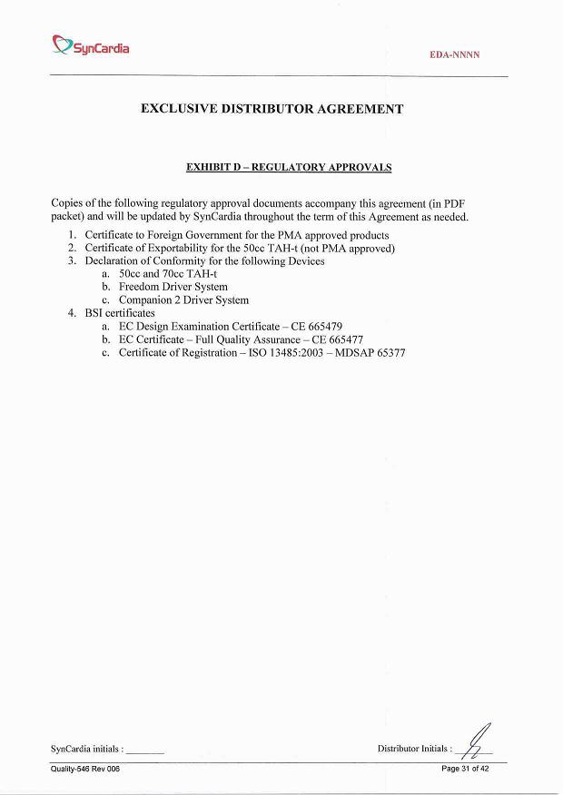 Syn C ar di a Qual l t y-546 Rev 006第31页,共42页E D A-N NNN EX C LUSIVE DI S TRI B UTOR Agreement Exhibit D-REGUL A T ORY A P Provals Following i ng r egulat o ry approv a l docu m e n t s accompany th i s agreement(in PDF packet)and wiU be updated b y S y nCA n:lia t h r ou g hout th e term of th i s agreement as nee d ed。1.向Foreign Government提供PMA批准的产品c ts 2的证书。50CC T A H-T(:未获P MA批准)3的Expo r tabil i ty证书。D e c l arati o n of conf o nnity for th e following devices a. 50cc a nd 70cc t a h-t b. Freedom dr i ver system c. C o mpanion 2 dri v e r s y s tem 4。BSI CE1tificates a. EC D e s i gn examination in a tion certificate-CE665479 b. EC CE1tificat e-Fu l l qual i ty a ssura n ce-CE665477 c. certific a te of registration-ISO 13485:2003-MDSAP 65377 Syncardia initials:___ d;stdbro,lnitfa l s:l