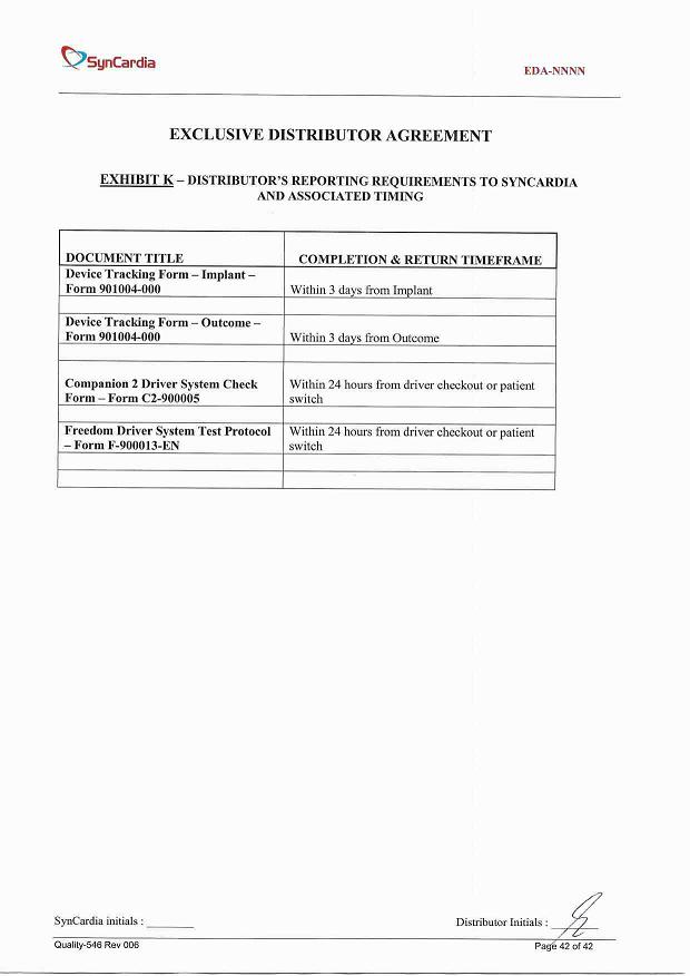 质量-546 Rev 006 PA42 of 42 SY n Car d i a EDA-N N N N Exclusive D I STRIBUTOR Agreement EXHIB I T K-D I STRIBUTOR向S YNCARDIA和相关T I Ming SYUCardia首字母的报告要求:_ d是k ibuto,lnirials,4完成I on & RETUR N TIMEFrame文档标题设备跟踪表单-植入物-表单90 1004-000 W i thin 3 d ays from m tmn l ant 3 days from outcome device tracking表单-outcome-表单901004-000 within. in 24 hours from driver checkout或患者开关伴侣2d r iver系统检查表格-F orm C2-900005在司机结账后24小时内o r p a tient开关fr e edom driver s ystem test p rotocol-表格F-900013-en