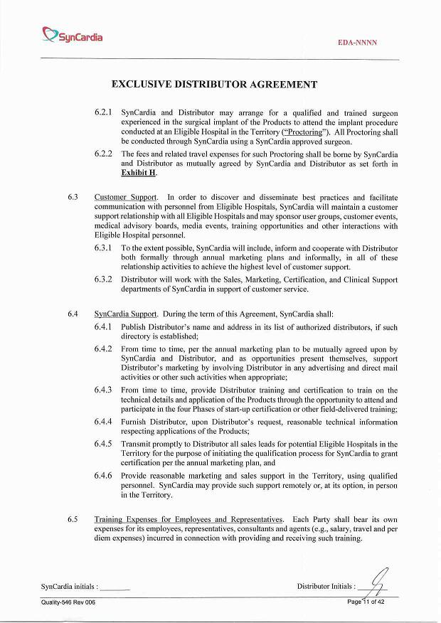 t丨' syncardia Quallty-546 rev 006 e d a-n NNN独家d i s t ri b ut o r协议6。2 .1 S y n Cardia和D i str i b u tor may ar r ange for a qualified and trained surgeon e experienced in the S u r gical implant of the Products io attend the i m p l a n t pro c eurect con d u cted at an eligible H os p i tal n the Ter r i tory(“Proctorin g”)。A ll Proctor jn g应通过SynCardia US i n g a SynCardia approved sur g eon进行管道输送。根据Exhi b i t H. 6.2.26.3 c u stomer s upport中的规定,SY n C a rd ia ai,d d i stribut o r作为相互a g r eed由S y n C a r d i a和d i stri b u t o r承担的T h e费用和相关差旅费将由S y n C a rd ia ai,d d i stribut o r承担。In ord e r to discover a n d d.iss e mi n ate best practices and faci l i tate com m u n icat i on with person ne l from e ligi b l e hospitals,SynCardia w i ll m aintain a customer s u p port rel a tions h i p w i t h a l l e l e i g i b l e hospitals and may spon o r user groups,c u s tomer event s,m e d ical advisory bo a r d s,M e d ia event s,traini ng oppor t u nities and other i n teracti o n s w i th eligible h o s p i tal pe r sonnel。1.到ext e n t p os s i ble,SynCardia将包括e、infonn和co o p erate与Di s t r i butor都通过annu a l营销p l a n s a n d i nfotma l y,在所有t b ese r e l a ti o n s h ip a c ti v i t i es中实现t h e highe s t l. evel的客户支持。2.Di s tr i b u t o r wijJ work w i t h the s a l es,marketing,c e r tificatio n,and clinic a l support deprutme n ts of SynCardia·i n suppo r t of cu s tomer servic e。6.4同步a r d i a s uppoii。D u ring t h e term of this agre e men t,S y n cardia shal l:6.4.1 p u blish distributor's name a nd a d ress in its. l ist of a u th o r i zed clist r i b u t or s _,if s u ch d i r ectory is e sta b l ishe d;from time to tim e,根据将由SynC a r d i a和Dist r i buto r共同商定的ar u 1 ual营销计划,a n d as opportunit i es present themesetve s,支持Dist r·i butor的m营销,方法是i nvolving D istribut o r在任何a d v e 1 t i s i ng a n d dire c t m a i l activiti e s或其他s u ch a c celebrities appropri a te from time to time e e e,pro v i de d i st r i b ut o r训练和ce 1 ti:fic a ti o n to t r ain on the technic a l deta i l s and applic a t i o n of the p ro d u cts thr o u gh the o p p ortuni t y to att e n d而part i cipate i n the fo u r p h ases o f start-u p ce r t ification or o t h e r fi e ld-deliver e d trai n. mg;fur n i sh di s t r i b u t o r,up o n d i st r i butor's r eque s t,r easona b l e technica l informa t ion r e specting ap p l i c a t i o n s of t h e product t s;transmit prom p t ly t o di s tributor a ll sales leads f o r potent i al elig i b l e hospitals i n the terri t ory for the purpose of i n i t i ating t h e qualification proc e s s对于SynCardia授予cert i fic a ti o n p e r the a n n u a l marke t i ng p l a n,a n d在T erritory中提供合理的m a r k et i n g和s a l es s u p po r t,u s ing q u a. lified p e r so n n e l。SynCardia may p rovide such support r e mote l y or,a t its opti o n,in p e r s o n in t h e t e n itory。6.4.2 6.4.3 6.4.4 6.4 .5 6.4 .66.5 T r aining exp. enses for emp l o yees a nd re p r ese n t ativ e s。每一方sha l l lbear i ts o w n e xpens e s for i ts e m ploye e s,re p r entatives,consultants r u 1 d a g e nts(e. g。,salar y,travel and per d i em expenses)i ncurred i n co n n ection w i t h p r o v i d i n g and recei v i ng su c h training。Syn C ardia首字母:_