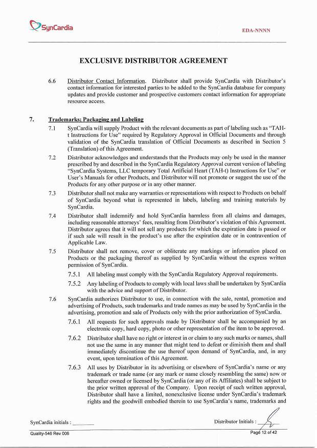 SY n Car d i a Qu a tity-546 Rev 006 PAG EDA-NN NN EXCLUS IVE DI S TRIBUTOR Agreement6.6 d i s t r i bu t or c o n tact l nf o n ation。DIS t r ibutor SH a ll prov i d e SynCard ia wi t h分销商的contact i u formation for i n terest e d parti e s将添加到SynCardfa databa s e for company updat es和pr o vide customer e r s c o n t act information for r appropriate r e s o urce acc e ss。7 .Trad e marks;packaging a nd Lab e line 7。1 s y a card i a will s uppJy product w i t h t h e r e l. evant docum e n ts as part of l a b eling su c h. as‘’not a ht instrumnctions for us e " required by r e g ul a t ory approval ia official documents并通过SynCard的validati o n. i a t r ansl a t i o n of official documents as des crib e d in secti o n 5(transl a t i on)of th i s a g rne m en t。Distribu t或acknow ] edge and understand s that th e p r oducts may o n l y be used in t h e m a n n e r p r escribed by and described in the syncard:ia r. egulatory a proval current v e r s ion oflabe l i ng‘SynCardia Systems,LLC temporarily Tot a l Artificial Heati(TAH-t)Instruc t i o n s for use " or use r’s Manua l s for other p roducts,nd分销商wi l l不推广或s u ggest t h e将产品t s用于任何其他e r p u r pose或以n y o t b e r方式。D i s t ributor s hal l n o t ma k e any warr a n ties or representations w i th respect to products on behalf o f sync a r dia beyond what is r presented i n l ab e l s,labeli n g and t r aining m a teri a l s by syncardj a。D i strib u tor shall indemn i fy a n d hold SydCardfa harmless from a ll claims and damag e s,including i n g reasonable att o r n ey s‘fees,resulting from d i stributto r’s vi o la t ion of t h is agreem e n t。D i s t ributor agrees t h at it will not se e ll any products for the ex p i ration da t e is p a s e d or i f such sale will r esult in t b. e product’s use after t h e xpiration date or in c o n travention of applicable law。Distribu t或s h all not remove e,cover or ob l i terate a n y markin g s o r inf o r m ation placed on produc t s or t h e packaging th e r eof as s u p p l i ed. by syncard-ia without the expr e ss w r it t en permi s s i on of syncardia。1.所有标签m u s t均符合S y n卡ia R e g ulator y批准要求n ts。2.任何l abeling of products to co m p l y w i th loc a l l aws s hall be und ertaken by Syn C a r d ia with the a dvice and s u p p m t o f d i stri b u t o r. SynCardia auth o r izes distributor to us se,in connection with the s ale,re n ta l,promotion. and adver t is i n g of e r o duc t s,此类t r a d标记和商品名称可能是u s e d b y sync a r dia i n the advertisin g,promo t i on a n d s a le of P r oducts only with t h e pre-authoriza t i on o f SynCardia。7 .2 7 .3 7.4 7 .5 7 .6 7 .6 .1 ALI re q u est for s t 1 c b ap p r o vals made by D i stri b u tor s hall shall with an electronic copy,b ard copy,photo o r other representatat i on of t h e i t em to be approved。Dist r i but o r sh a ll has no right or int e r est in or claims to a n y such marks or n a me s,shajl not u se the same i n.任何可能倾向于击败o r d min i sh t h em and s h all的方式,我都会在S y nCardi a的要求下间接否认i n ue the us se,并且,在任何情况下,在t e rm i nati o n of this agreem e nt。AU U S es by Dist r i but o r in its adv e 1 tising o r els e where of synca r d i a ' s name or a t 1 y t r adem a r k or trade n a me(o any mark or n a me closely similar to l ing t h e s a me)现在或以后拥有或l icens e d b y synca r d i. a(o r any o f its affilia t e s)s h all be s u bject to tbe p r i o r written approval of t h e Co m pa n y。U p o n rec e ipt o f such written approva l,d i s tribu t or s hall has a l i m i ted,n o n e x c l usual license und e r SynCardi a的trndemark权利和其中体现的使用SynCardi a的nam e,tr a demark a n d 7的商誉。6.2 7.6 .3 SynC a rd i a init i a l s:d i distributor ini t ials:-