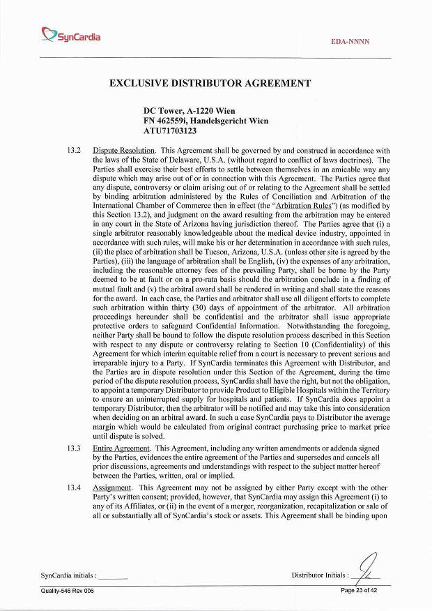 SynCar d i a ED a-NNNN Exclusive D I S TRIBUTOR Agreement DC TOwe)·,a-1220 Wien FN 462559 i,Handelsgericbt Wien ATU71703123 13。2争议R e解决方案。T H i s协议应由gov e r n ed by and con s tmed根据wi t h the laws o f the st a t e of d e l a ware。,US. S. A.(w it h o u t reg a rd to conf l i ct of laws dictions)。pa t t ies s厅行使其b e st eff o r ts,以a m i电缆方式a n y d isp u t e在m s e lv e s之间设置t le,其中m a y产生了o f或i。n与t h i s a g r eement的连接。双方同意,任何d i sp u t e,con t r oversy o r c laim产生于或r elat i ng to a g r eement sh a ll b e set t l ed by b i nding a r b·i t r ati o n admini s t e r e d by the R 1,1 Jes of Conciliati o n a n a n d a r b itrat i. on of the l nternation a l c h amb e r of Commerce then in effect(the“Arbi t ration RLLle s”)(as m o d ified by t h i s Section 13。2),and j u d g ment on a ward re s u l t i n g from a rbi t ration may b e entered in any c o u rt i n t h e state of Ariz o n a having j u risdiction of them。PA r ties a g r ee that(i)a single arb i trator teas o na b ly knowled geable about t h e me d. i cal device i nd u stry,app o inted according to w i th s a ch rule s,wilJ make bis or her deterer. mioa t ion according to w i t h such rule s,(i)t h e p l ace of arbitration s h aji be tu c son,Ari. zon U. S. a.(u n l ess other site i s agreed b y the partie s),(i i i)a r bitration sh a ll b e e e n glish的语言,(iv)任何仲裁员的费用o n,i n c l u d i n g the i:easonable a ttorney fee of the previous Part y,s厅由当事人认为e d在f a ult或按比例bas i s承担,如果在findi n g中的ar b itration c o n c lu d e有相互过错和(v)t h e a r b i tr a l award s h all b e r以书面形式结束,s厅说明t h e aw a rd的r e. a s o n s,t h e partie s and ar b it r at o r s h all u se all hard efforts to complete s u c h arbitration w ithin t h i rty(30)days of a p p p oi n t m e nt of the arbitor。AJI a r bitration process ings h e reu n d e r s hall b e confi. den t iaJ和arb i trator s h a ll issue approp r i ate protective o r ders to safe g u ard confidential i n format i on。Notwi t h s tandiDg前述,P a 1 ty均不得遵循所描述的disp u t e resohltion过程i n t h为SE c t ion with r e spect to any d i s pute或c o nt r ove r sy r e l a t i ng to Section 10(C onf i d entiality)of this Agreement对于whi c h interim e q ui t a b l e reli e f from a cou,t i s neces a r y to prev e n t se r io u s and ir r epara b l e hurt to a party。If SynCardia terminates t his agreement w ith d i s t ributo r,and th. e partie s are in disputes r es o l. ut i on u n d er th i s section of t h e agreemen t,during the time period of the di s pute resolution process,S y n c a rcl i a sh a ll have the right.;but n ot t h e obligation,指定临时经销商向Eligi B L E医院提供产品,以减轻患者和患者的负担。如果SynCardia确实指定了临时分配给r,则第th e n t h e仲裁员w will be notified aud may take th. is into consider a tion w h en dec i d i ng on a ll a r bi t ral裁决。在这种情况下,Syn C arclia p ay to D istribut o r the av e r age margin whi c h wo u l d b e calcu l ated from o r i ginal co n tract p u r cha s i n g price to market price u n til d i s pute is s o l ved。整个协议1 i t。Th i s agre e m en t,i. ucl L 1 d n g任何经当事人签署的书面修正案n t s或增编s,ev i d ences t h e e e n t i r e agreement of the。缔约方a n d s u p e r sedes和c a n c els就betw e en t h e pr u t ies,w r i tten,ora l o r im p l ied的s u bje ct事项进行的所有事先讨论s、协议和un d e r stan d i n gs wi t h。A s si g n m e nt。Th i s a g r e e m ent may d 01. be as s i g n ed by either part y‘s w r itten conse n t except w i th the other part y’s w r itten conse n t;provide d,howeve r,t h at syncr u·d i a may assign this agreem e nt(i)to any of its affi l. iates,or(ii)in the event of a m e rger,re o r ganization,r ecapit a l i zation or s a le of a U or substantia l l y a ll of syncr u·dia ' s stock o r a s e t s。本协议s hall be b. i ndin g up o n page 23 of 42 qual i ty-546 rev 00613.31 3.4 sync a rd i a initia l s:__