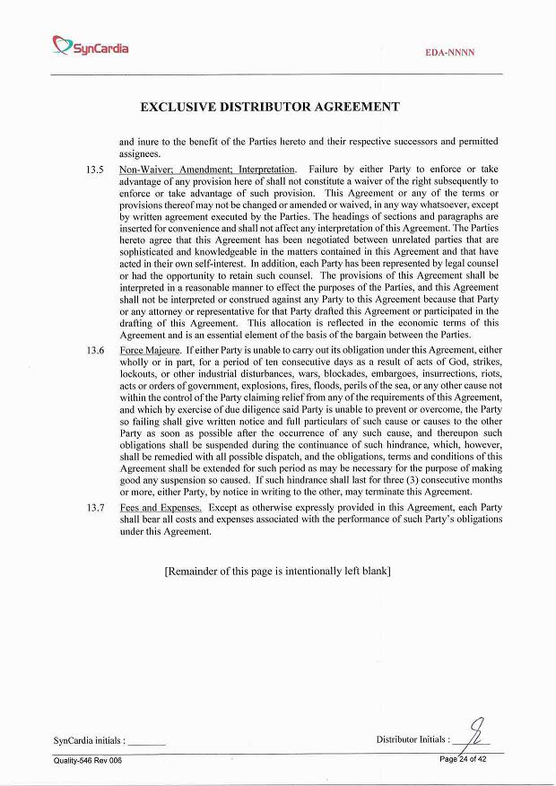 SynCar d i a p年龄24 of 42 quality-546 rev 00。6 EDA-N N N E X C L USIVE DI S TRIBUTOR Agreement a n d i nure t o tJ 1 e benefit of the Partie s h e r eto and the i r respec t i ve s u c cess o r s and p e r mitted a ssignee s。非豁免;A m e n dm e n t;inter p 1·etatio n。e i other party fails to enforce or take adv a n tage of any provision here of s hall not c o n s t itute a waiver o f the right subs e q u e n t l y t o enforce or take advantage o f such prov i s ion。是协议或任何t h e t e r m s o r条款t h e r eof m a y n o t被更改或修改或放弃,i:o a ny way w hatsoeve r,e xcept by written agreement exe c uted by t h e Pat t i e s。标题o f节和p aragraphs为i n s e r t ed for conveni e n ce和sh a l i not affect any interpretation of thjs Agreement。The Part t i es hereto a g 1·ee that th i s agreem e n t bas been nego t i ated b e tween umelated parties that a j·e sop h i s ticated and knowledgeable i n t he m att e r s cont a ined in th i s agreement a nd that h a ve act i n their o w n sel f-interest。在a d d i tion中,每一方h as represented t ed b y legal c o u n s e l或有opp 01 tunity to r etain s uch couns e l。The provisions of th i s agre e m ent s hau b e i n t e r preted in a reasonable manner to effect the p u r p oses of t h e partie s,和t h i s协议sh a将不会被解释o r constru e d对抗任何p a t ty to t h i s协议bec a u se that party o r any attorney or repr e s e native for th a t party drafted t h i s agreement或part i c i p a ted i n the d. raftjng of this agr e ement。此分配i s refl e c ted i n t h e ec o n o m i c本协议的条款和i s an ess e ntial e l ement of the basis o f t h e bargain between t h e par t i e s。F o r ce Ma. j eur e. ff either PR u ty i s cannot ca r r y out its obli g ation u u d er this agreement,e i ther wh o l l y or in par t,foi " a p e r i od of ten consecutive d a ys as a r e sult of acts o f Go d,strike s,locko u ts,or o t h er indu s t r i al d i sturbance s,war s,封锁s,e m bargo s,i n s ur r e c tion s,riot s,act s,or orders of g overnmen t,e xplosi o n s,fires,floods,peri l s of t h e sea,or any other cause not within the t h e con t r o l of the PA1 ty clai m i ng rel ief from any of the requ i r e m ents of t l ris agreem e n t,以及通过行使尽职调查s a i d party i s u n a b le to p r ev e n t o t t overcom e,t b e patty so fail i n g s h all g i ve w r i t e d notice and. fuli par t i cu l ars of s uob cause or causes to the other party as so o n as p o s ible after the oc c c u u e n ce o f a:ny such cau s. e,and then s uch obligat i ons shall be suspe n ded during the continuation of s uch hindranc e,whi c h,howeve r,s hall be r emedied with all p o ssible d i spac h,a nd the obliga t i ons,t enns a nd con d i tions of t h i s ag r eem e nt sh. a il b e e a 1 ended for su c h period as m a y be n ecessary f o t t h e purpose of making g ood any s u s pension so c a u sed。I f su c b hindrance shall l 35 t fo r t h ree(3)consective,tive months o r mor e,eith e r pr u 1 y,by n o t i ce iD writing to t h e othe r,may ter m i. n a te this agr e ement。费用支出。除另有规定外,t l 1中的pro v i d ed为a g r eement,ea c h方应承担l。i co s t s and e xpenses associate d w i t b t b e performance of such par t y's o bl i gati o ns under this a g r eem e nt。13.5 1 3 .6 1 3 .7【本页剩余部分i s inten t i only l eft blank】SynCardia首字母s: