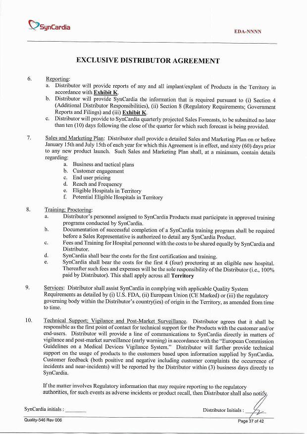 SY n C ar d i a Q u ality-546 Rev 006 p年龄37 of 42 EDA-NNNN Exclusive DISTRIB U T O R Agreement6。报告:a. Dist r i butor将根据E x h i b i t k b提供该地区产品的任何和所有植入物/外植体的报告。Dist n butor将向SynCardia提供(i)第4节(a ditional distributor responsibilities)、(ii)第8节(regulatory requires e m e nts;government reports and filing)和(iii)e x h ibit k. c.分销商将向S y nCardia提供季度预计销售预测,不迟于提供S uch foreca s t的季度收盘后十(10)天提交。7.S ales和Ma r keting P lan:D分销商应在本协议生效的每一年的15日或之前,以及在任何新产品推出之前的六十(60)天,提供详细的销售和M arketing P l an。此类销售a n d mar k eting plan s hall至少包含有关以下方面的详细信息:a. b US i ness和战术计划b. Custo m er en g agement c.最终用户定价d.达到和频率e.合格H ospit a l s i n teITitory f.领土8的潜在合格H ospitals。培训;监理:a. D i stiib u t或分配给SynCardia Products的人员mu s t p:arti c ipate i n批准了由SynCar d ia开展的培训项目。在销售代表:tative i s被授权详细介绍任何SynCardia产品之前,需要Successf u l co m完成SynCardia培训计划s hall的文件。医院人员的费用和培训,费用由SynCardia和分销商平均分摊。SynCardia将承担首次认证认证和培训的费用。SynCA r d ia应承担在符合条件的新医院进行首次4(fou r)p roctoring的费用。此后,这些费用和开支将由Di的贡献者全权负责(i. e。,100%由Distr i butor支付)。这将适用于所有T e r r itory b. c. d. e. 9。S ervices:分销商应协助Sync a rdia i n遵守(i)美国FD A、(ii)欧盟(CE标志)或(iii)经不时修订的分销商原产国(i e s)内的监管管理机构详述的AP p可许可质量体系要求。10.T e chnical支持;vigi l ance和post-mark e t s监视。经销商同意,作为产品与客户和/或终端用户技术支持的第一联系点负责。分销商将根据《欧盟委员会关于医疗器械警戒系统的指导方针》,在vig i l ance和上市后监测(早期预警)事项中提供一条通信线路t o SynCardia dire c tly。" D分销商将进一步向基于SynCardia的Information Suppl i ed的定制e-RS提供产品使用方面的技术支持。Custo MER反馈(包括客户投诉nts事件和近-事件的发生)将由分销商w i thin(3)b _ business days直接向SynCardi a报告。If the matter invol ves regulatory information that may r e quire r e porting to the regulatory authoritie s,for such events such as a d v e r se incidents or product recal l,then d i s t r ibutor shall also no t·syn c ard.ia initials:___