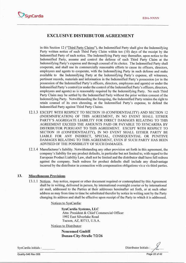 SynCar d i a qua l i ty-546 Rev 006 ED A-n n n n n exclusive DI S T RIBUTOR A G R E E M E N T在本条第12款(“第三方索赔s”)中,被赔偿方应向赔偿方发wri t ten notice of s uch third party claim w ithin t e n(10)da y s of the repensed party receiving su c h notice。赔偿方可随后r、在接到第1被赔偿部分y的通知后,承担并控制sub th i rd party C la i m在其c h oice的ln d emnif ying p art y's e xpense和t h r o u gh counseJ的辩护。被赔方应协同p erat e,并应使用i ts comm e r c i a lly r easonabl. e eff o rts促使i ts offic e r s、董事s、雇员和代理人协同e,与被赔方i fying party u 1 such defense并向被赔方提供赔偿部分y的费用,所有wi t n esse s,相关记录s,t b e受偿的part y的po session(或在受偿的patty的o ffic e-s、董事s、雇员和代理人的p o s session)或根据lndemnifi. ed part y的c o n tr o l(或und e r the contr o l of t b e受偿的pru t y的offi c er s,d irector s,雇员e s a nd agents)按赔偿方的合理要求。No s uch t h ird party claim m a y be settled by the ldern. n ified party w ithout the ludem 11 i ify party的事先书面同意。Not w i thstanding t he foreg o mg,lhe reminded party retains the right to retai n co u n sel of its own choosin g,at t he ndemn i fied party ' s e xpense,to fend the Ind e m nifi ed PR u·ty against tliird party cl a i m s。3.除R E S PECT to SE C TLON 10(保密性)和S E CT I on 12(indemnIFTCATTON)o F本协议T外,在任何情况下均不得向其当事人就d l RECT damages re l. \ t ING to ' i HFS协议支付超过发行人根据本协议支付给SYNCARDIA的A m ounts PA m或付款。就第10条第I款(保密性)而言的EX C EPT,在任何情况下,任何一方均不得对与本G REEMEN T相关的任何间接T、SPECIA L、后果性或PUN L TIVE DAMAGES,即使已告知该方其可能性或F such d AMAGES。4.M anufac t urer的责任。Notwithstand i ng any o t b er provi s ion set f o 1 t h in this agreemen t,the c o mpany的liabi l ity for r u 1 y product d e faul t t s,in p a rticular but not l i mited to,with r e g a rd to the eur o p e an product liabi l i ty law,s ba l l不受限制并且分销商s hall有完整的r e dress against the co _ mpany。S u c h r e dr e ss for product d e faults sha l l mc l ude any d isadv a ntage incu 1 Ted by the d i s tributor in connection w i th co m p ensa t i. on obliga t i o n s vis a v i s第三方。1 3 .杂项规定13。1 .1 n otices。任何notic e、request或other documents required or conspectat e d by th is a g r eement shall be i n writin g,de l ivered in personal,by internat i on a l ov e rn i g h t c o urier or by internationa l air mail,created to the patties at their address h ere i naf t er set f o 1 t h,或在m a y等其他地址不时被par l y c ha n ging发送的书面通知取代there e fo r bynotice,其地址a nd sh a ll be e effective u p o n r eceipt of the par l y c ha n ging is effective u p o n r eceipt of the party of it is addressed to。Notices to SynCA r di a:SynCardia S y stems,LLC ATTN:President & Chi e f Comme r c ial Officer 1992 East S iJ v e rla k e Road Tucson,AZ,85713,U. S.A. Notices to D istributor:Neucom e d GmbH l > onau-City-Stra6e 7/2/26 S y nC a rdia in i t i a l s:_