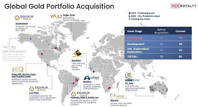 2025年9月26日,Vox从Deterra Royalties Limited收购了一个黄金资产组合,其中包括贵金属购买协议(“PMPA”,历史上称为“承购”)和常规特许权使用费。尽管最初被标记为先前所有者的承购,但这些PMPA在实质上与流媒体安排更紧密地保持一致。根据这些协议的条款,Vox以通常由市场参考价格(LBMA或COMEX)设定的动态价格购买规定百分比的可支付黄金,并授予Vox在每一交付盎司的金属销售时获取保证金的能力。这种定价和实物金属交付机制为Vox提供了直接接触金属生产和价格走势的机会,类似于传统的流媒体协议。这些PMPA在经济上受到与金属价格波动和产量相关的现金流的驱动,类似于流。因此,Vox认为这些PMPA更等同于流,并将在其投资组合报告和未来披露中提及它们。