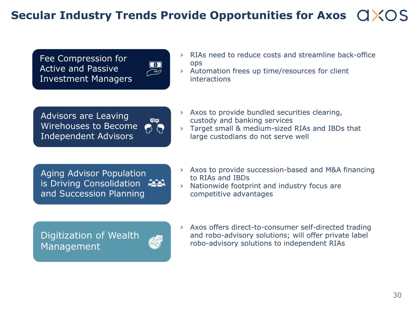 30个长期行业趋势为AxOS提供机会丨RIA需要降低成本并简化后台操作丨自动化为客户交互腾出时间/资源丨AxOS提供捆绑证券清算,托管和银行服务丨瞄准大型托管机构服务不佳的中小型RIA和IBD丨AxOS向RIA和IBD提供基于继承的和并购融资丨全国范围的足迹和行业聚焦是竞争优势丨AxOS提供直接面向消费者的自主交易和智能咨询解决方案;将为主动和被动投资经理的独立RIA费用压缩提供自有品牌智能咨询解决方案财富管理老龄化顾问人口数字化正在推动整合,继任规划顾问正在离开Wirehouses成为独立顾问