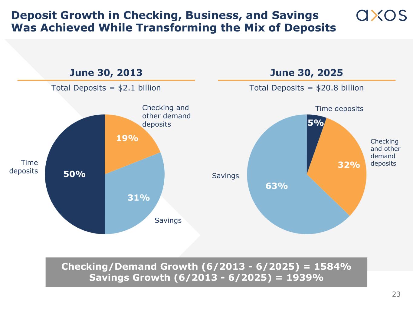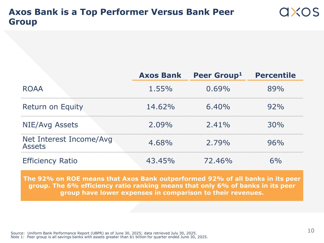 10 Axos Bank Peer Group1百分位ROAA 1.55% 0.69% 89%股本回报率14.62% 6.40% 92% NIE/Avg资产2.09% 2.41% 30%净利息收入/Avg资产4.68% 2.79% 96%效率比43.45% 72.46% 6%资料来源:截至2025年6月30日的统一银行业绩报告(UBPR);数据检索于2025年7月30日。注1:同业组为截至2025年6月30日季度资产超过10亿美元的所有储蓄银行。Axos银行与银行同业集团相比表现最佳,92%的ROE意味着Axos银行的表现优于同业集团所有银行的92%。6%的效率比排名意味着,与收入相比,同行集团中只有6%的银行的费用更低。
