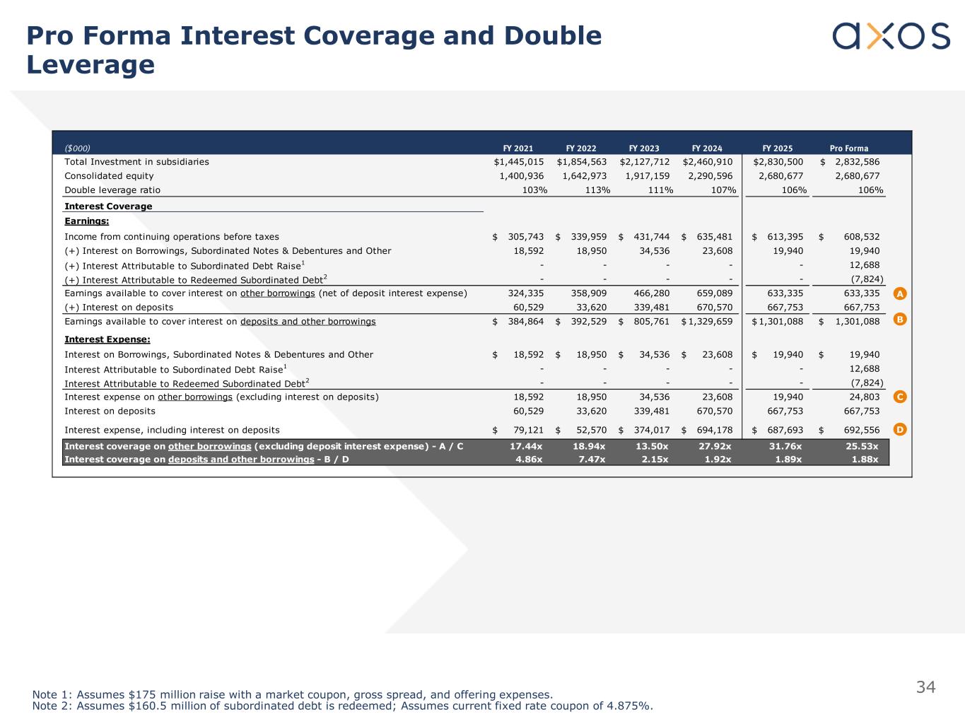 34备考利息保障和双重杠杆(000美元)2021财年2022财年2023财年2024财年2025财年备考子公司投资总额1,445,015美元1,854,563美元2,127,712美元2,460,910美元2,830,500美元2,832,586美元合并权益1,400,9361,642,9731,917,1592,290,5962,680,6772,680,677双重杠杆率103% 113% 111% 107% 106%利息保障收益:税前持续经营收入305,743美元339,959美元431,744美元635,481美元613,395美元608,532美元(+)借款利息,次级票据和债券及其他18,59218,95034,53623,60819,94019,940(+)应占次级债务筹集的利息1------12,688(+)应占已赎回次级债务的利息2-----(7,824)可用于支付其他借款利息的收益(扣除存款利息支出)324,335358,909466,280659,089633,335633,335(+)存款利息60,52933,620339,481670,570667,753667,753可用于支付存款和其他借款利息的收益384,864 $ 392,529 $ 805,761 $ 1,329,659 $ 1,301,088 $ 1,301,088 $利息次级票据和债券及其他18,592 $ 18,950 $ 34,536 $ 23,608 $ 19,940 $ 19,940 $应占次级债务筹集的利息1------12,688应占已赎回次级债务的利息2-----(7,824)其他借款利息支出(不含存款利息)18,59218,95034,53623,60819,94024,803存款利息60,52933,620339,481670,570667,753667,753利息支出,包括存款利息79,121美元52,570美元374,017美元694,178美元687,693美元692,556美元其他借款的利息保障(不包括存款利息支出)-A/C 17.44x 18.94x 13.50x 27.92x 31.76x 25.53x存款和其他借款的利息保障-B/D 4.86x 7.47x 2.15x 1.92x 1.89x 1.88x B D A C注1:假设以市场票息、总利差和发行费用筹集1.75亿美元。注2:假设1.605亿美元次级债被赎回;假设当前固定利率票息为4.875%。