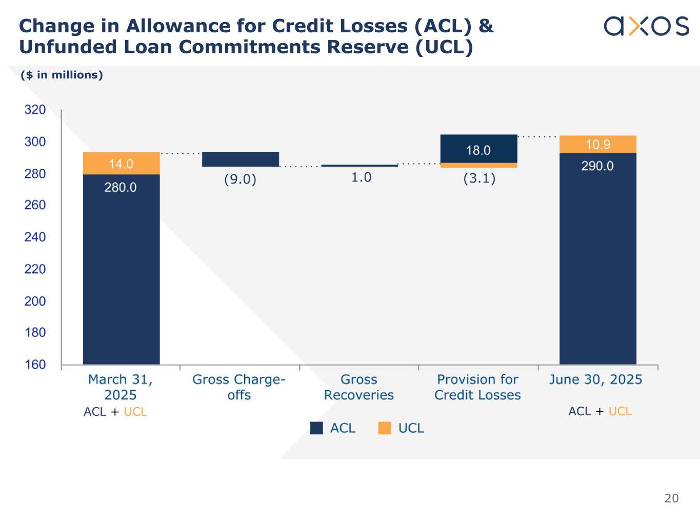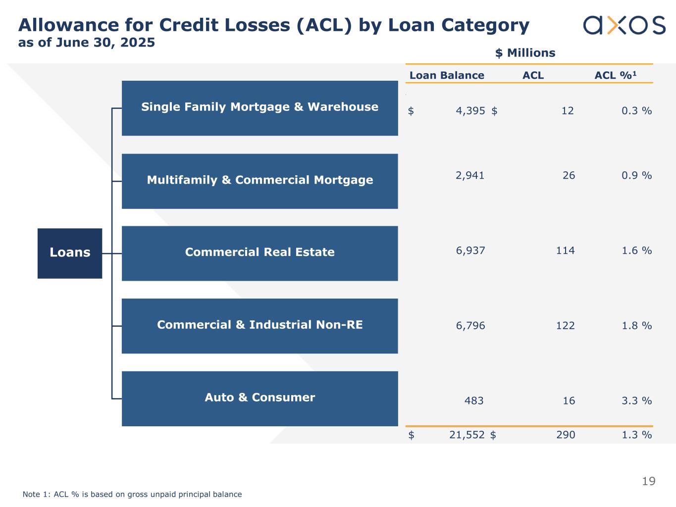 19截至2025年6月30日按贷款类别划分的信用损失(ACL)的单户抵押贷款和仓库津贴(百万美元)多户和商业抵押商业房地产商业和工业非可再生能源贷款贷款余额ACL ACL % 11 $ 4,395 $ 120.3% 2,941260.9% 6,9371141.6% 6,7961221.8% 483163.3% $ 21,552 $ 2901.3% Auto & Consumer Note 1:ACL %基于未付本金余额总额