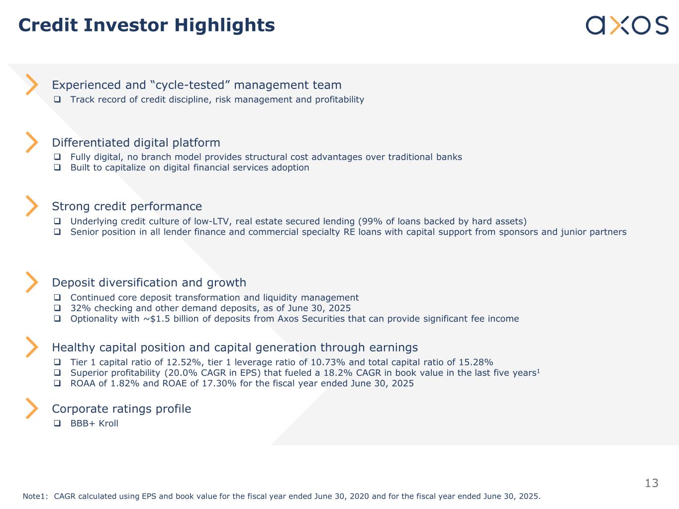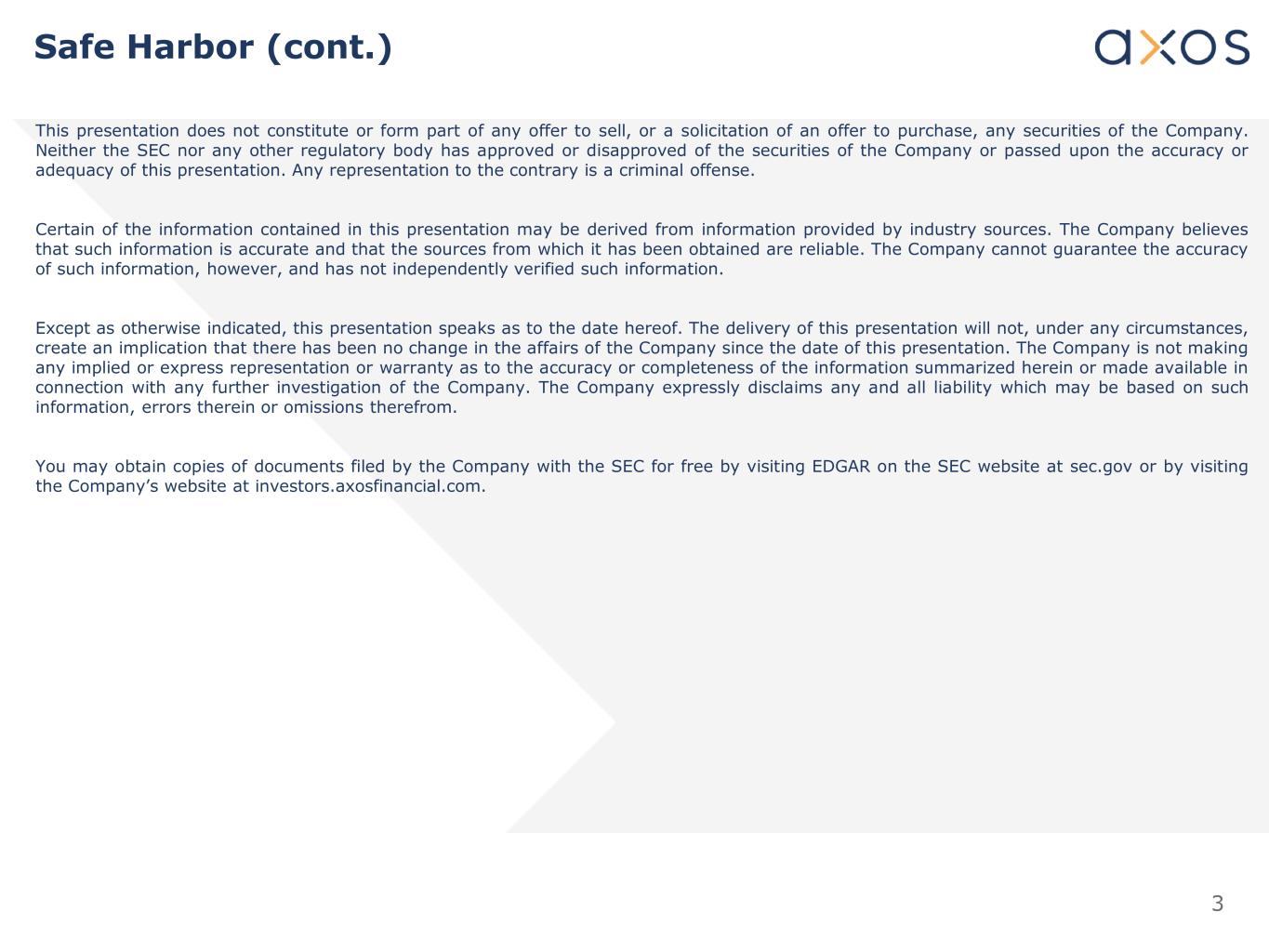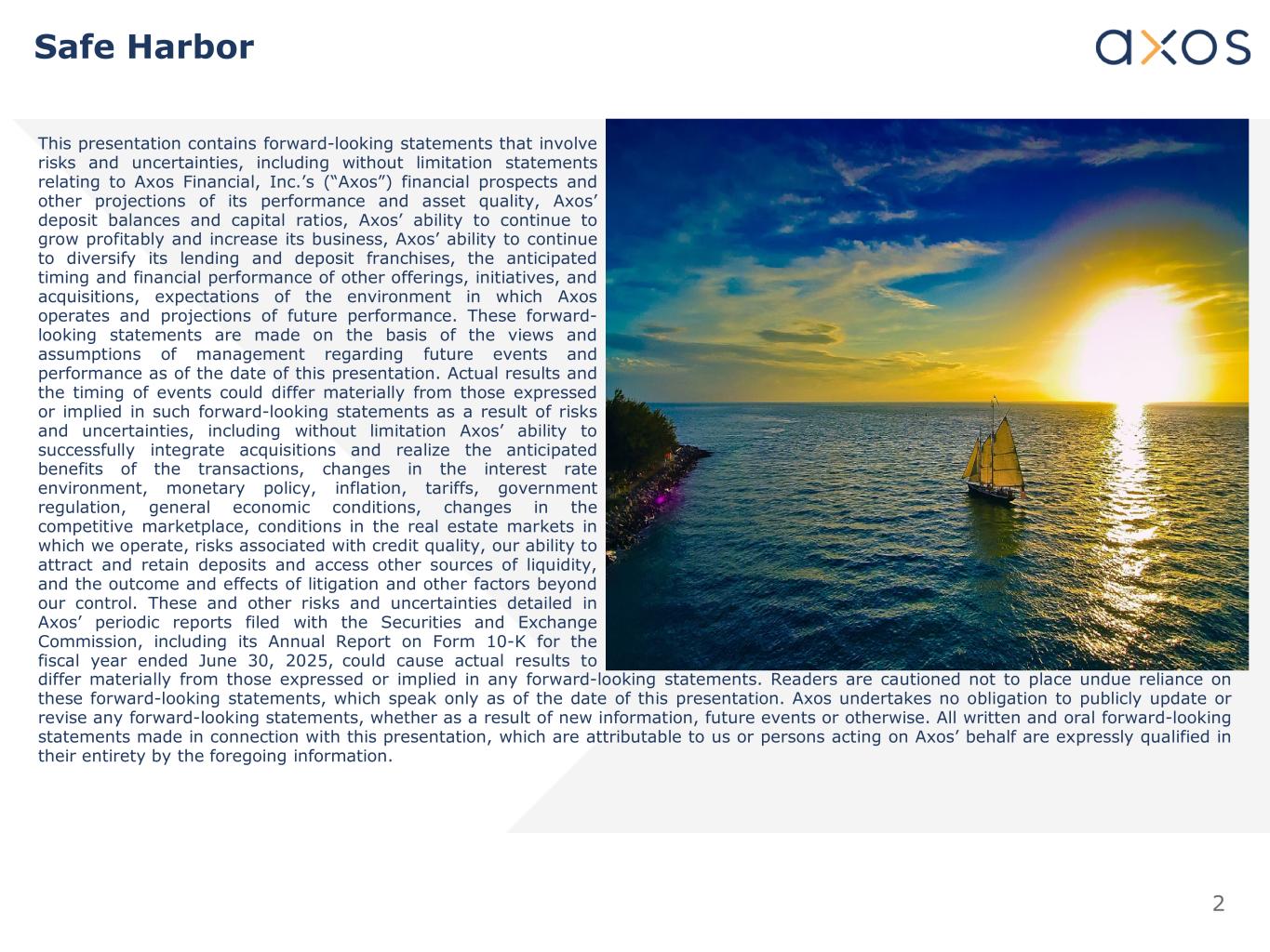 2安全港本演示文稿包含涉及风险和不确定性的前瞻性陈述,包括但不限于与Axos Financial, Inc.(“Axos”)的财务前景以及对其业绩和资产质量的其他预测、Axos的存款余额和资本比率、Axos持续盈利增长和业务增加的能力、Axos继续实现贷款和存款特许经营权多样化的能力、其他产品、举措和收购的预期时间和财务业绩、对Axos运营环境的预期以及对未来业绩的预测有关的陈述。这些前瞻性陈述是基于管理层对截至本演示文稿发布之日的未来事件和业绩的看法和假设作出的。由于存在风险和不确定性,包括但不限于Axos成功整合收购和实现交易预期收益的能力、利率环境变化、货币政策、通货膨胀、关税、政府监管、总体经济状况、竞争性市场变化、我们经营所在的房地产市场状况、与信贷质量相关的风险、我们吸引和保留存款以及获得其他流动性来源的能力,实际结果和事件发生的时间可能与此类前瞻性陈述中明示或暗示的内容存在重大差异,以及诉讼的结果和影响以及我们无法控制的其他因素。Axos向美国证券交易委员会提交的定期报告中详述的这些以及其他风险和不确定性,包括其截至2025年6月30日的财政年度的10-K表格年度报告,可能会导致实际结果与任何前瞻性陈述中明示或暗示的结果存在重大差异。告诫读者不要过分依赖这些前瞻性陈述,这些陈述仅在本演示文稿发布之日发表。Axos不承担公开更新或修改任何前瞻性陈述的义务,无论是由于新信息、未来事件或其他原因。所有与本演示文稿相关的书面和口头前瞻性陈述,凡可归因于我们或代表Axos行事的人,均明确完全符合上述信息。
