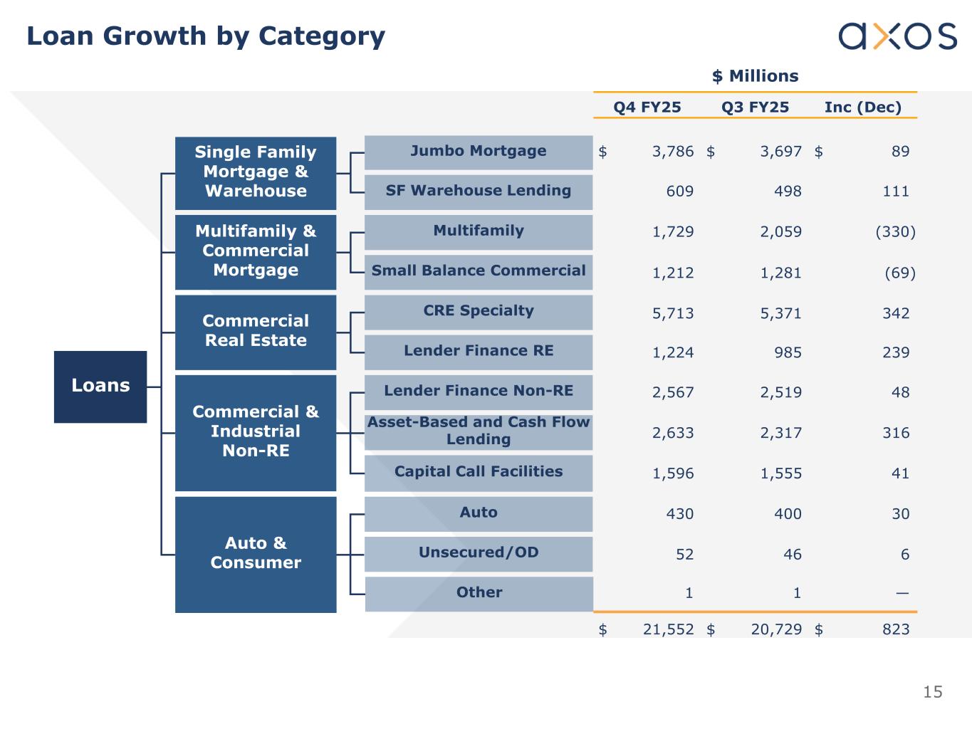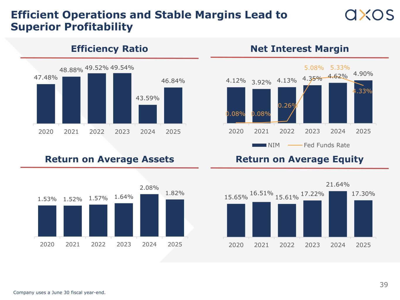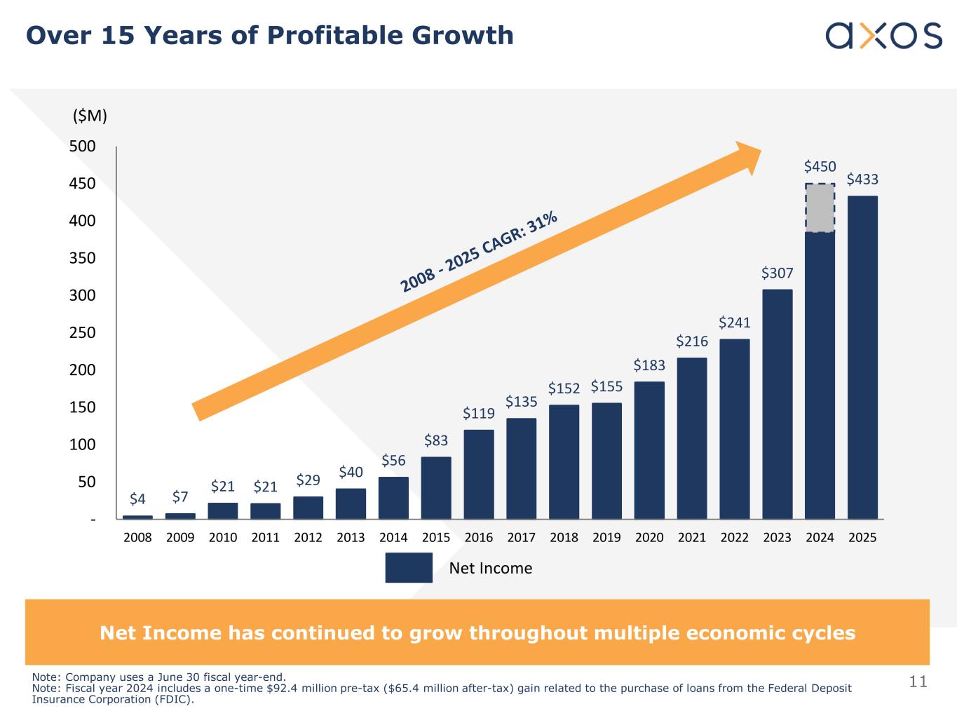 2安全港本演示文稿包含涉及风险和不确定性的前瞻性陈述,包括但不限于与Axos Financial, Inc.(“Axos”)的财务前景以及对其业绩和资产质量的其他预测、Axos的存款余额和资本比率、Axos持续盈利增长和业务增加的能力、Axos继续实现贷款和存款特许经营权多样化的能力、其他产品、举措和收购的预期时间和财务业绩、对Axos运营环境的预期以及对未来业绩的预测有关的陈述。这些前瞻性陈述是基于管理层对截至本演示文稿发布之日的未来事件和业绩的看法和假设作出的。由于存在风险和不确定性,包括但不限于Axos成功整合收购和实现交易预期收益的能力、利率环境变化、货币政策、通货膨胀、关税、政府监管、总体经济状况、竞争性市场变化、我们经营所在的房地产市场状况、与信贷质量相关的风险、我们吸引和保留存款以及获得其他流动性来源的能力,实际结果和事件发生的时间可能与此类前瞻性陈述中明示或暗示的内容存在重大差异,以及诉讼的结果和影响以及我们无法控制的其他因素。Axos向美国证券交易委员会提交的定期报告中详述的这些以及其他风险和不确定性,包括其截至2025年6月30日的财政年度的10-K表格年度报告,可能会导致实际结果与任何前瞻性陈述中明示或暗示的结果存在重大差异。告诫读者不要过分依赖这些前瞻性陈述,这些陈述仅在本演示文稿发布之日发表。Axos不承担公开更新或修改任何前瞻性陈述的义务,无论是由于新信息、未来事件或其他原因。所有与本演示文稿相关的书面和口头前瞻性陈述,凡可归因于我们或代表Axos行事的人,均明确完全符合上述信息。