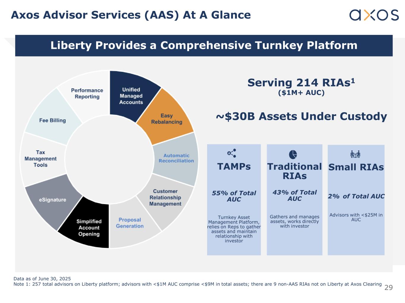 29 Axos Advisor Services(AAS)一览Liberty提供全面的交钥匙平台自动和解,服务于214个RIAS1($ 1m + AUC)~$ 30B资产托管下的小型RIA占AUC顾问总数的2%且AUC中< $ 2500万传统RIA占AUC总资产的43%,直接与投资者TMP合作,占AUC交钥匙资产管理平台总数的55%,依靠Reps来收集资产并与截至6月30日的投资者数据保持关系,2025年注1:Liberty平台上共有257名顾问;AUC < 100万美元的顾问占总资产< 900万美元;Axos Clearing有9个非AAS RIA不在Liberty上