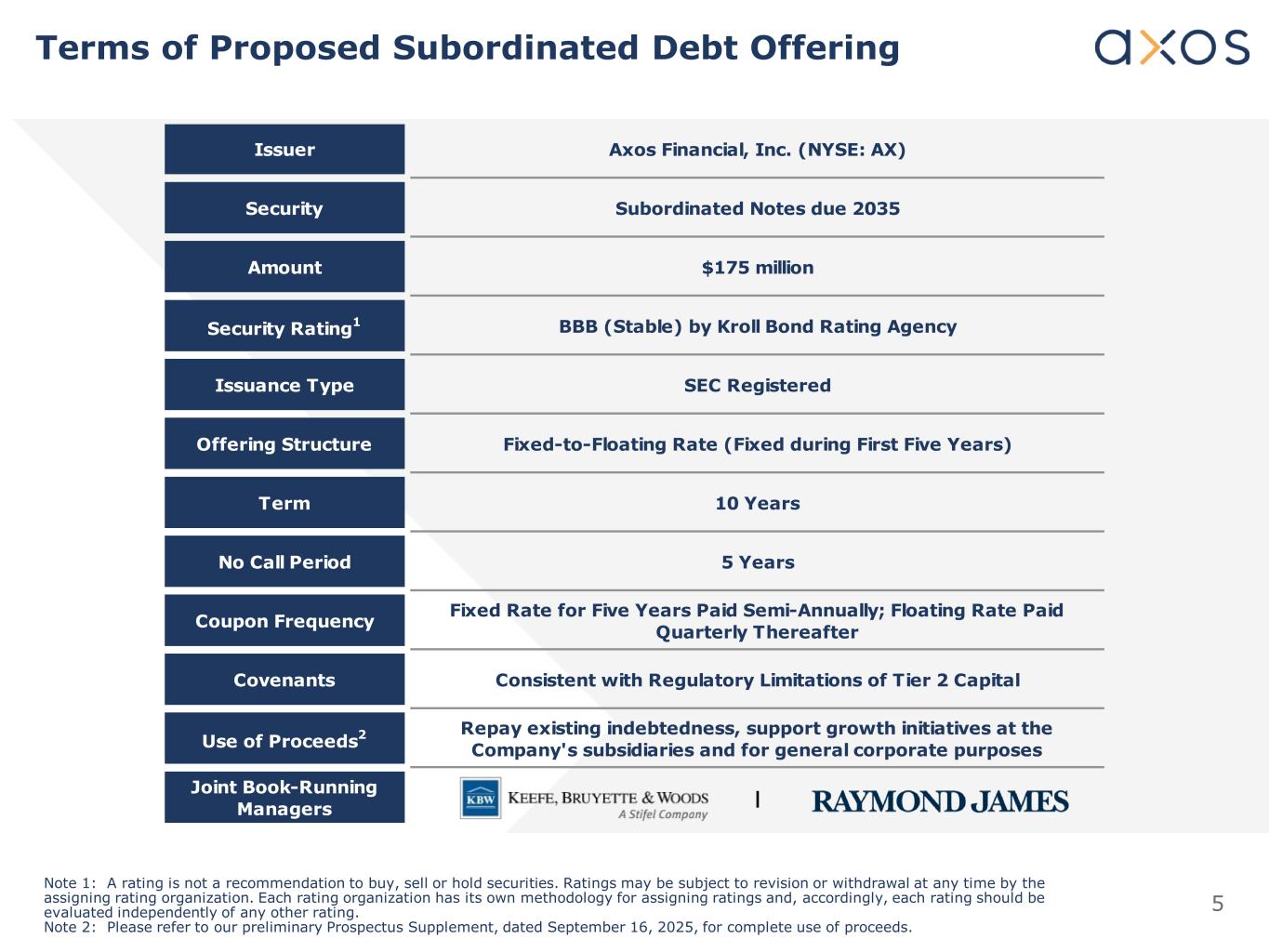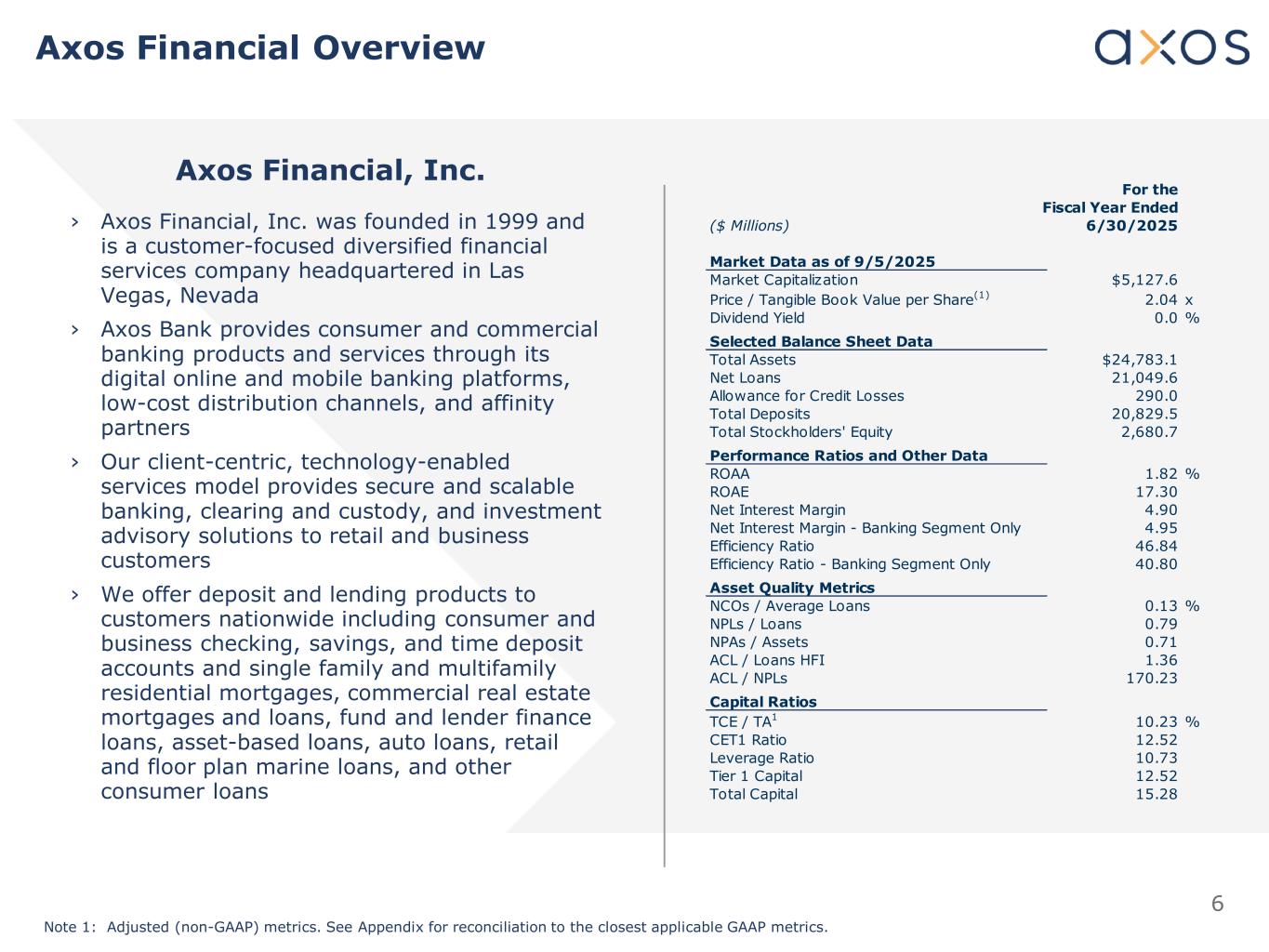 5注1:评级不是买入、卖出或持有证券的建议。评级可能随时被指派评级机构修改或撤销。每个评级组织都有自己的评级分配方法,因此,每个评级应独立于任何其他评级进行评估。注2:有关所得款项的完整用途,请参阅我们日期为2025年9月16日的初步招股章程补充文件。拟议次级债发行人条款Axos Financial, Inc.(NYSE:AX)2035年到期的证券次级票据金额为1.75亿美元证券评级1 BBB(稳定)由KRoll债券评级机构发行类型SEC注册发行StructureFixed to Floating Rate(fixed during the first five years)term 10 years no call period 5 years coupon frequency fixed rate for five years paid semi-annually;floating rate paid after quarterly paid through conventions consistent with tier2 capital use of proceeds2 repaid existing debt,support growth initiatives at the company's subsidiaries and for
