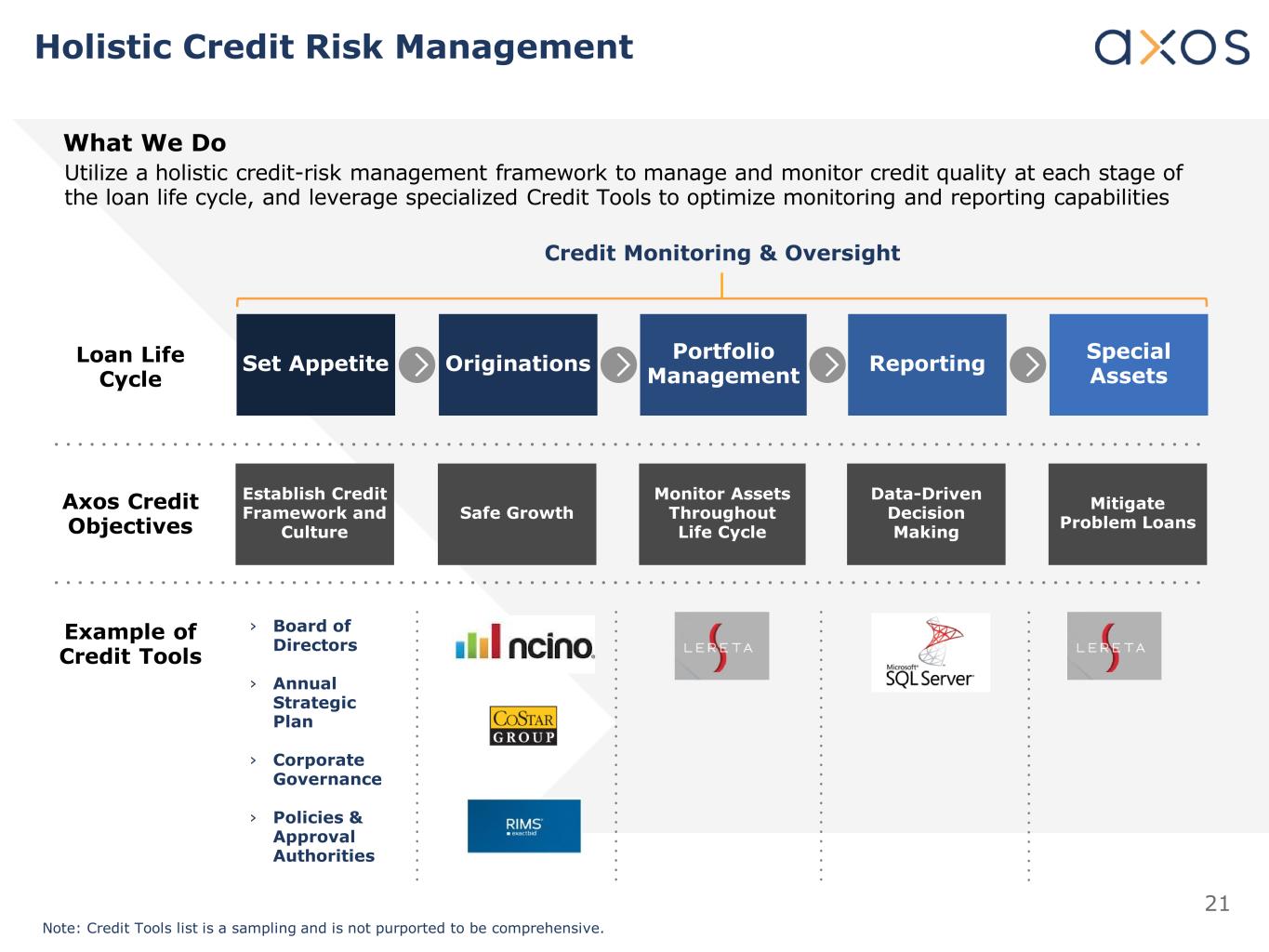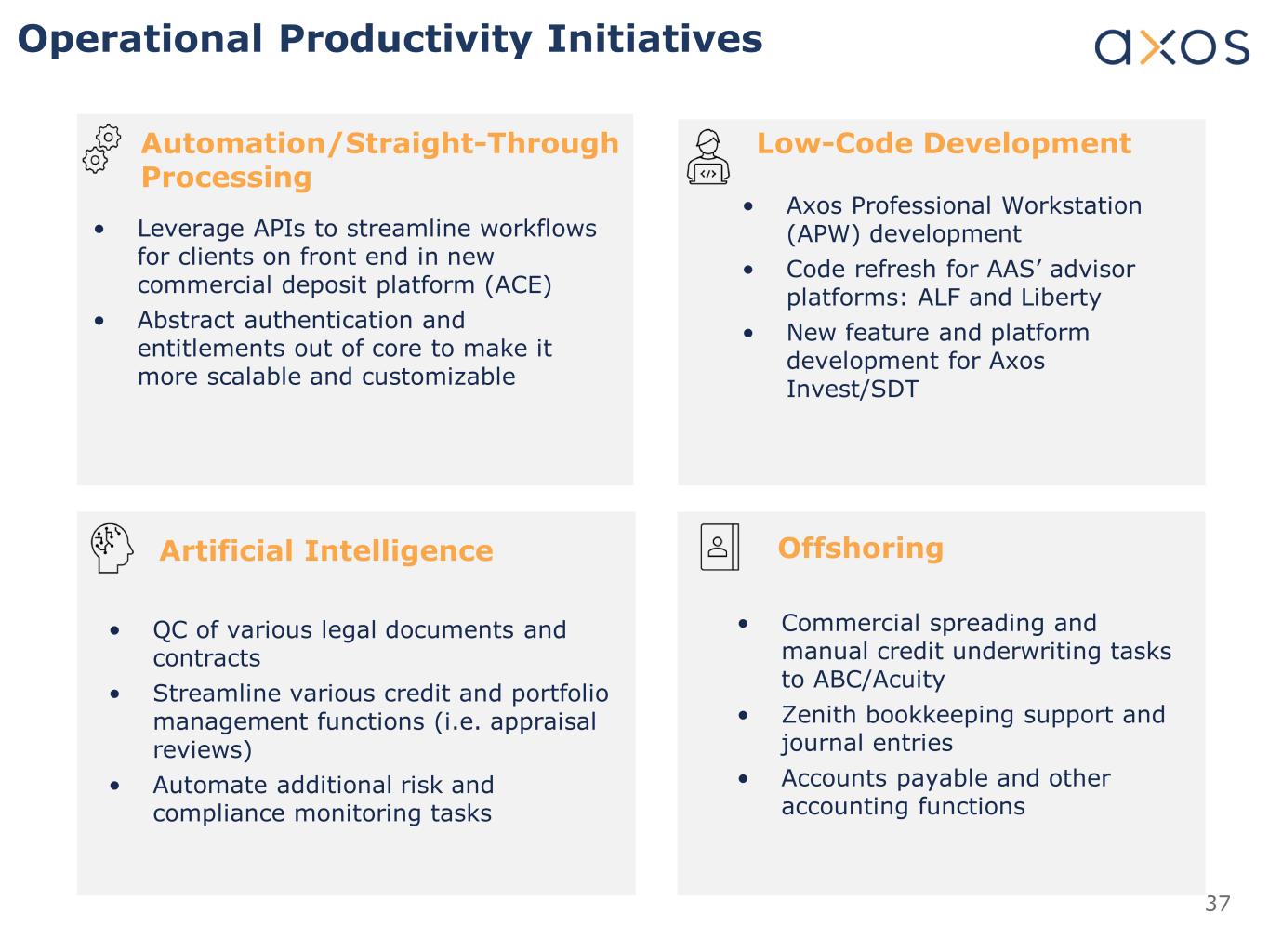 37项运营生产力举措自动化/直通式处理低代码开发人工智能离岸外包• AxOS专业工作站(APW)开发• AAS顾问平台的代码刷新:ALF和Liberty • AxOS Invest/SDT的新功能和平台开发•各种法律文件和合同的质量控制•简化各种信贷和投资组合管理功能(即评估审查)•将额外的风险和合规监测任务自动化•向ABC/Acuity提供商业传播和人工信贷承销任务• Zenith簿记支持和日记分录•应付账款和其他会计功能•在新的商业存款平台(ACE)中,利用API为前端的客户端简化工作流程•从核心中抽象身份验证和权利,使其更具可扩展性和可定制性