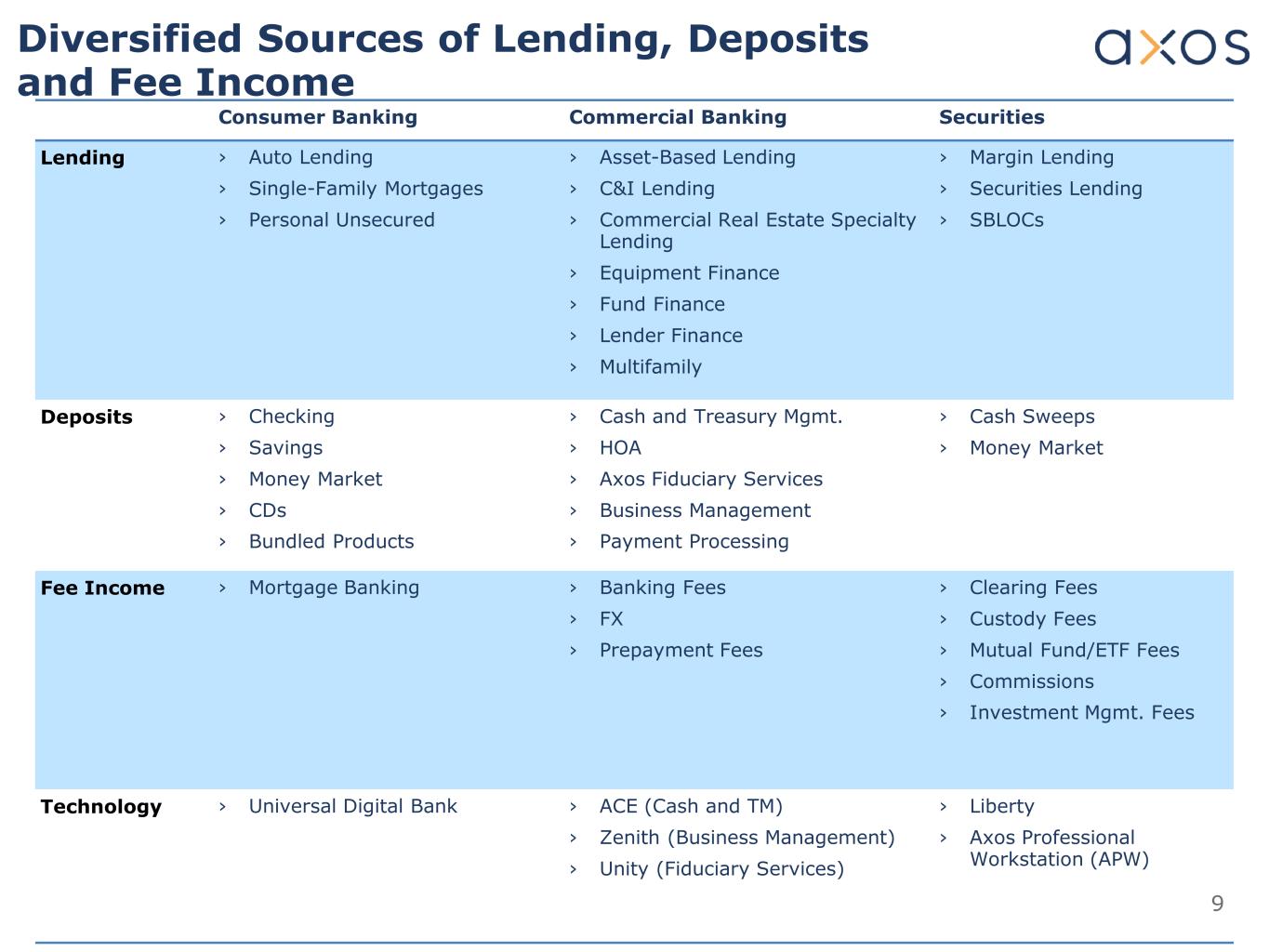 9贷款、存款和手续费收入来源多元化个人银行商业银行证券出借丨汽车贷款丨单户抵押贷款丨个人无抵押丨基资产贷款丨C & I贷款丨商业地产专业贷款丨设备金融丨基金金融丨贷款人金融丨多户家庭丨融资融券丨SBLOCs存款丨查账丨储蓄丨货币市场丨CDs丨捆绑产品丨现金和国库管理。丨HOA丨Axos受托服务丨业务管理丨支付处理丨现金大扫除丨货币市场手续费收入丨抵押银行丨银行手续费丨外汇丨预付款手续费丨清算手续费丨托管费丨共同基金/ETF手续费丨佣金丨投资管理。Fees技术丨环球数字银行丨ACE(Cash and TM)丨Zenith(业务管理)丨Unity(受托服务)丨Liberty丨Axos专业工作站(APW)