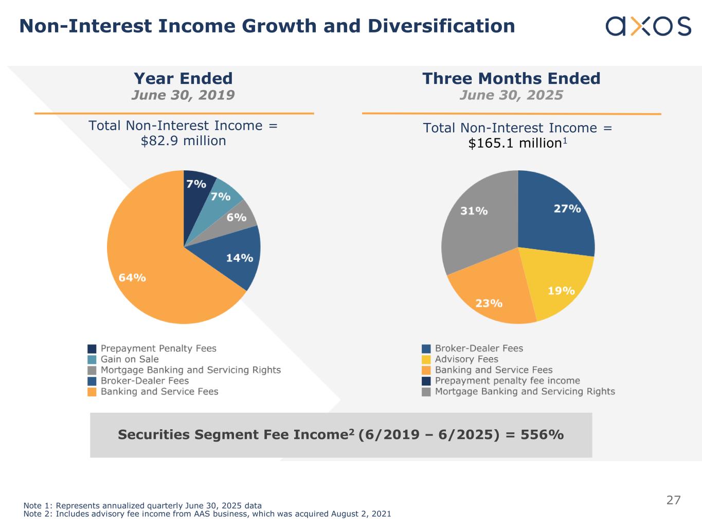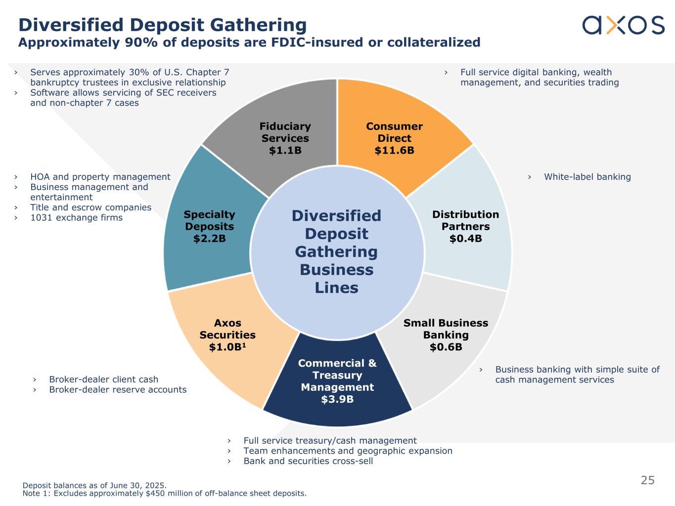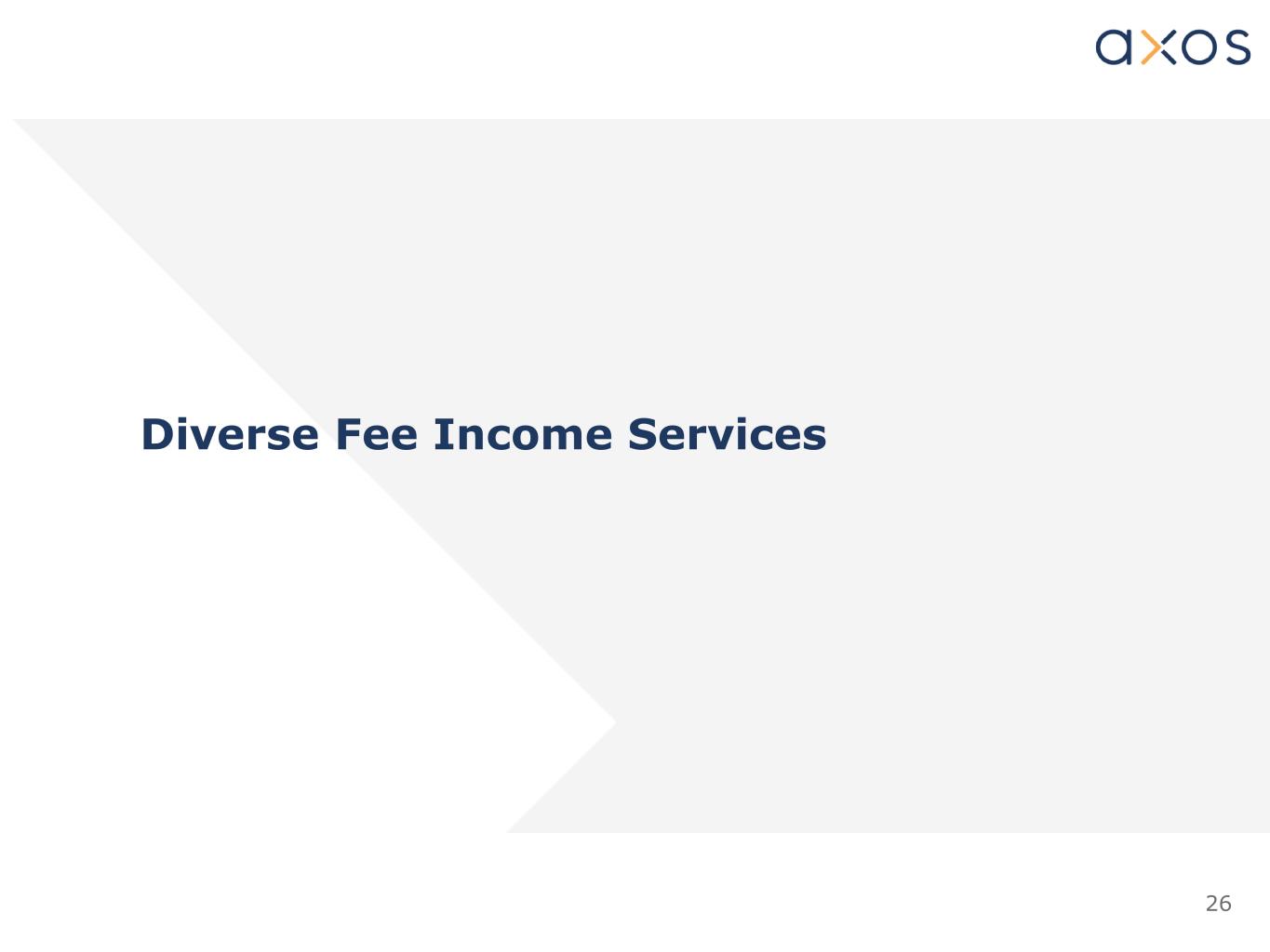 25多元存款汇聚约90%存款由FDIC承保或抵押↓以排他性关系为约30%的美国第7章破产受托人提供服务丨软件允许为SEC接管人和非第7章案件提供服务丨全方位服务数字银行、财富管理、和证券交易↓白牌银行丨商业银行业务,提供一套简单的现金管理服务丨HOA和物业管理丨商业管理和娱乐丨产权和托管公司丨1031家交易所丨经纪自营商客户现金↓经纪自营商备用金账户丨全套服务金库/现金管理丨团队增强和地域扩张丨银行和证券交叉销售受托服务$ 1.1B消费者直接$ 11.6B特殊存款$ 2.2B分销合作伙伴$ 0.4B Axos Securities $ 1.0B1小型企业银行业务$ 0.6B商业和财务管理$ 3.9B多元化存款收集业务项目截至2025年6月30日的存款余额。注1:不包括约4.5亿美元的表外存款。