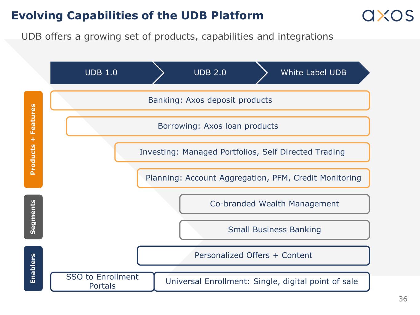 UDB平台的36项不断发展的能力UDB 1.0 UDB 2.0白标UDB银行业务:AxOS存款产品借款:AxOS贷款产品投资:管理投资组合、自定向交易规划:账户聚合、PFM、信用监控个性化优惠+内容联名财富管理SSO到注册门户通用注册:单一、数字销售点UDB提供越来越多的产品、能力和集成小型企业银行业务P ro d u ct s + F ea tu re s s eg m en ts en ab le rs