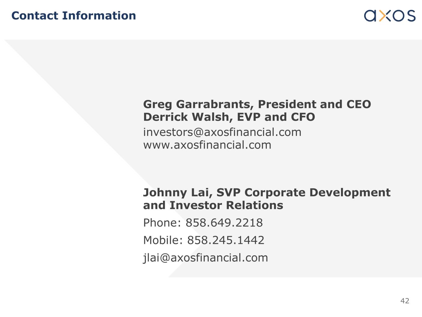 42 Greg Garrabrants,总裁兼首席执行官Derrick Walsh,执行副总裁兼首席财务官Investors@axosfinancial.com www.axosfinancial.com Johnny Lai,企业发展和投资者关系高级副总裁电话:858.6 49.22 18手机:858.24 5.14 42 jlai@axosfinancial.com联系方式