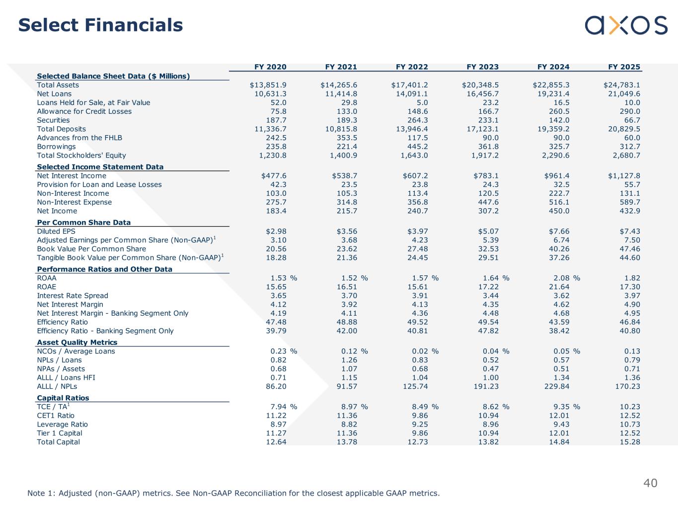 40 Select Financials FY 2020 FY 2021 FY 2022 FY 2023 FY 2024 FY 2025 FY Selected Balance Sheet Data($ millions)Total assets $ 13,851.9 $ 14,265.6 $ 17,401.2 $ 20,348.5 $ 22,855.3 $ 24,783.1 Net loans 10,631.311,414.81 4,091.116,456.7 19,231.421,049.6 Loans held for sale,按公允价值计算52.02 9.85.02 3.2 16.5 10.0信用损失准备金75.81 33.01 48.61 66.72 60.52 90.0证券187.7 189.32 64.32 33.11 42.066.7存款总额11,336.710,815.813,946.417,123.119,359.220,829.5 FHLB垫款242.53 53.51 17.59 0.09 0.06 0.0借款235.82 21.44 45.2361.83 25.73 12.7股东权益总额1,230.81,400.91,643.01,917.22,290.62,68 0.7选定损益表数据净利息收入$ 477.6 $ 538.7 $ 607.2 $ 783.1 $ 961.4 $ 1,127.8贷款准备金和租赁损失42.32 3.52 3.82 4.33 2.555.7非利息收入103.0 105.31 13.41 20.52 22.71 31.1非利息费用275.73 14.83 56.84 47.65 16.1589.7净收入183.42 15.72 40.73 07.24 50.04 32.9每普通股数据稀释后每股收益2.98美元3.56美元3.97美元5.07美元7.66美元7.43美元调整后每股普通股收益(非公认会计准则)13.10 3.68 4.235.3 96.74 7.50每普通股账面价值20.56 23.62 27.4832.53 40.26 47.46每普通股有形账面价值(非公认会计准则)118.28 21.36 24.45 29.5 137.26 44.60业绩比率及其他数据ROAA 1.53% 1.52% 1.57% 1.64% 2.08% 1.82 ROAE15.65 16.51 15.61 17.22 21.64 17.30息差3.65 3.70 3.91 3.44 3.62 3.97净息差4.12 3.9 24.13 4.35 4.62 4.90净息差-银行分部仅4.194.11 4.36 4.48 4.68 4.95效率比47.48 48.88 49.52 49.54 43.59 46.84效率比-银行分部仅39.79 42.00 40.81 47.82 38.42 40.80资产质量指标NCO/平均贷款0.23% 0.12% 0.02% 0.04% 0.05% 0.13不良贷款/贷款0.82 1.26 0.83 0.52 0.57 0.79不良资产/资产0.68 1.07 0.68 0.47 0.5 10.71 ALLL/贷款HFI 0.71 1.15 1.04 1.00 1.34 1.36 ALLL/NPLS 86.2091.57 125.74 191.23 229.84 170.23资本比率TCE/TA1 7.94% 8.97% 8.49% 8.62% 9.35% 10.23 CET1比率11.22 11.36 9.86 10.94 12.01 12.52杠杆率8.97 8.82 9.258.96 9.43 10.73一级资本11.27 11.36 9.86 10.94 12.01 12.52总资本12.64 13.78 12.73 13.82 14.84 15.28注1:调整后(非公认会计原则)指标。有关最接近的适用GAAP指标,请参阅非GAAP对账。
