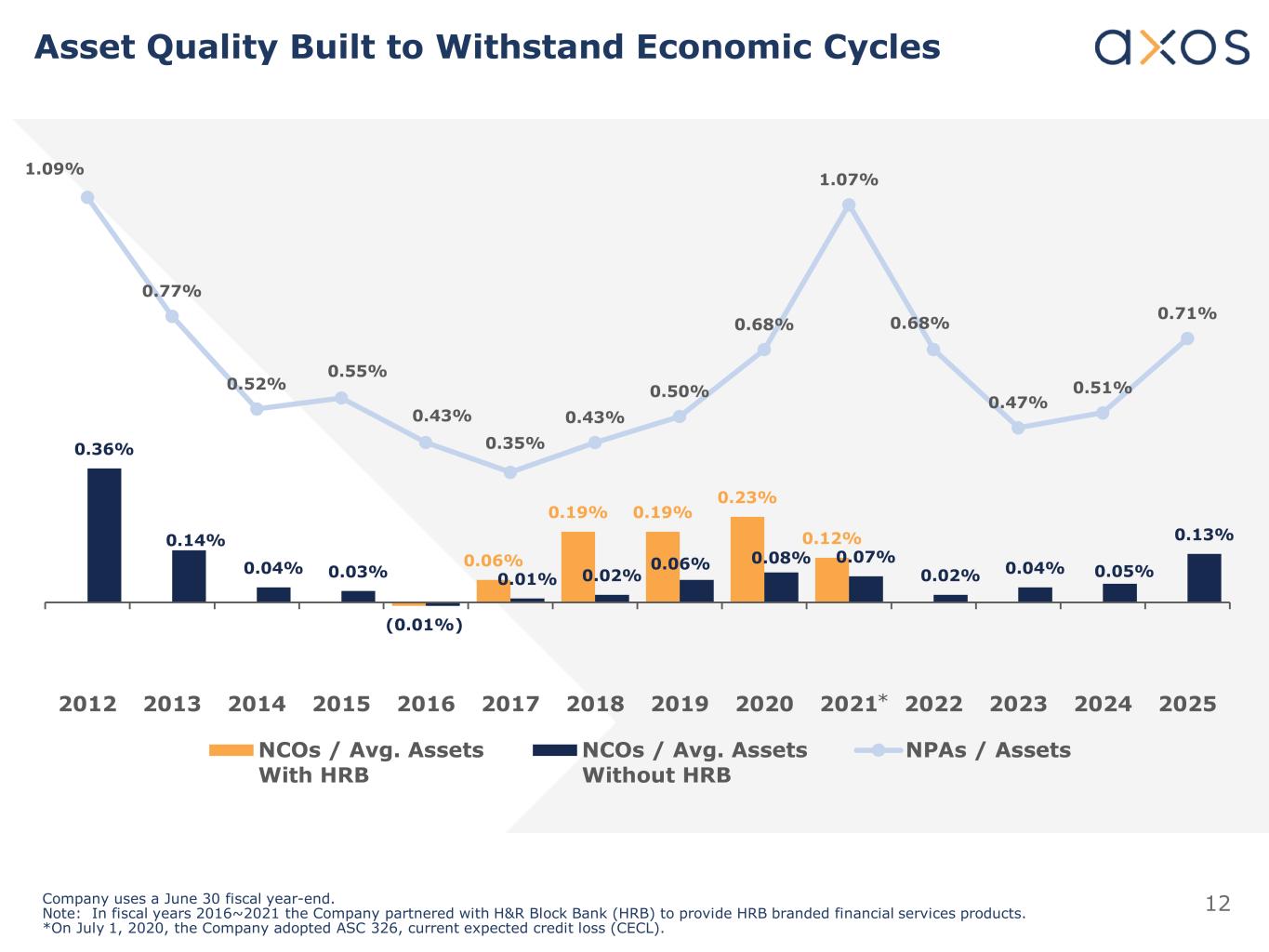 12资产质量建成承受经济周期0.06% 0.19% 0.19% 0.23% 0.12% 0.36% 0.14% 0.04% 0.03%(0.01%)0.01% 0.02% 0.06% 0.08% 0.07% 0.02% 0.04% 0.05% 0.13% 1.09% 0.77% 0.52% 0.55% 0.43% 0.35% 0.43% 0.50% 0.68% 1.07% 0.68% 0.47% 0.51% 0.71% 201220132014201520162017201820192020202120222022202320242025 NCO/平均具有HRB NCO/Avg的资产。不含HRB的资产NPA/assets公司使用的是6月30日财年年末数据。注:2016~2021财年,公司与HR布洛克服务银行(HRB)合作提供HRB品牌金融服务产品。*公司于2020年7月1日采用了ASC 326,当前预期信用损失(CECL)。*