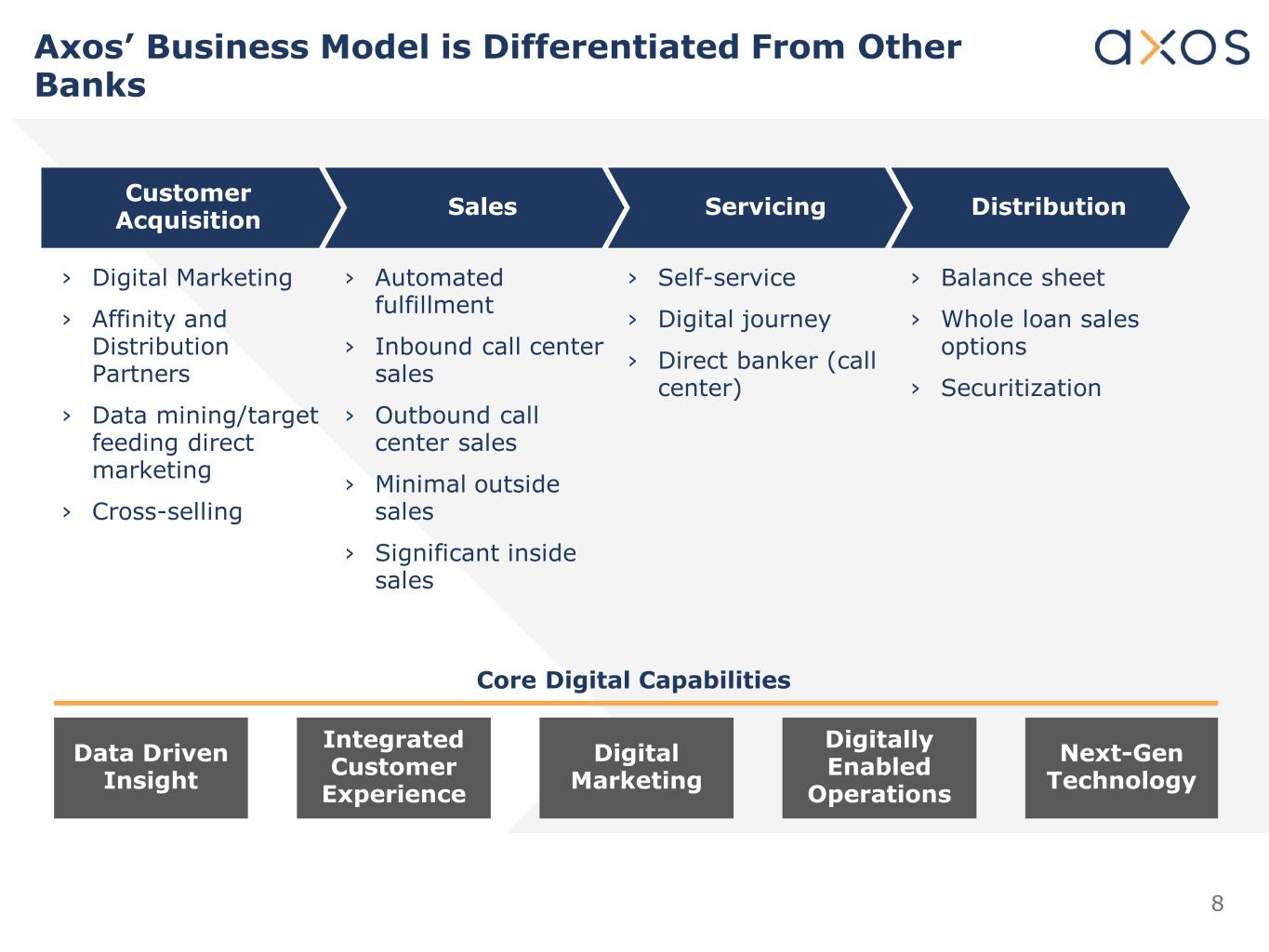 8客户获取销售服务分销丨数字营销丨亲和力与分销合作伙伴丨数据挖掘/目标馈送直销丨交叉销售丨自动化履行丨入境呼叫中心销售丨出境呼叫中心销售丨极简的外部销售丨显着的内部销售丨自助服务丨数字之旅丨直接银行家(呼叫中心)丨资产负债表丨整笔贷款销售选项丨证券化数据驱动洞察力整合客户体验数字营销数字化运营下一代技术核心数字能力AxOS的商业模式与其他银行形成差异化