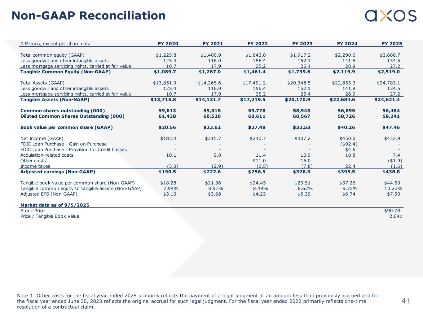 41非美国通用会计准则调节百万美元,每股数据除外2020财年2021财年2022财年2023财年2024财年2025财年普通股权益总额(GAAP)1,225.8美元1,400.9美元1,643.0美元1,917.2美元2,290.6美元2,68 0.7美元减去商誉和其他无形资产125.41 16.41 52.11 41.8 1 34.5减去抵押贷款服务权,按公允价值列账10.71 7.9 25.2 25.428.9 27.2有形普通股权益(非公认会计准则)1,089.7美元1,267.0美元1,461.4美元1,739.6美元2,119.9美元2,519.9美元总资产(GAAP)13,851.9美元14,265.6美元17,401.2美元20,348.5美元22,855.3美元24,783.1减去商誉和其他无形资产12按公允价值列账10.71 7.9 25.225.428.9 27.2有形资产(非公认会计原则)$ 13,715.8 $ 14,131.7 $ 17,219.5 $ 20,170.9 $ 22,684.6 $ 24,621.4已发行普通股(000)59,61359,31859,77858,94356,89556,484稀释后已发行普通股(000)61,43860,52060,61160,56758,72658,241每普通股账面价值(公认会计原则)$ 20.56 $ 23.62 $ 27.48 $ 32.53 $ 40.26 $ 47.46净收入(公认会计原则)$ 183.4 $ 215.7 $ 240.7 $ 307.2 $ 450.0 $ 432.9 FDIC贷款购买-购买收益---(92.4美元)-FDIC贷款购买信用损失----$ 4.6-收购相关成本10.19.81 1.4 10.9 10.87.4其他成本1--$ 11.0 16.0-($ 1.9)所得税(3.0)(2.9)(6.5)(7.8)22.4(1.6)调整后收益(non-GAAP)$ 190.5 $ 222.6 $ 256.5 $ 326.3 $ 395.5 $ 436.8每股普通股有形账面价值(non-GAAP)$ 18.28 $ 21.36 $ 24.45 $ 29.51 $ 37.26 $ 44.60有形普通股权益到有形资产(non-GAAP)7.94% 8.97% 8.49% 8.62% 9.35% 10.23%调整后EPS(non-GAAP)$ 3.10 $ 3.68 $ 4.23 $ 5.39 $ 6.74 $ 7.50市场数据截至2025年9月5日股价$ 90.78价格/有形账面价值2.04x注1:其他成本截至2025年的财政年度主要反映支付的法律判决金额低于先前的应计金额,而截至2023年6月30日的财政年度则反映该法律判决的原始应计金额。对于截至2022年的财政年度,主要反映了一项合同索赔的一次性解决。