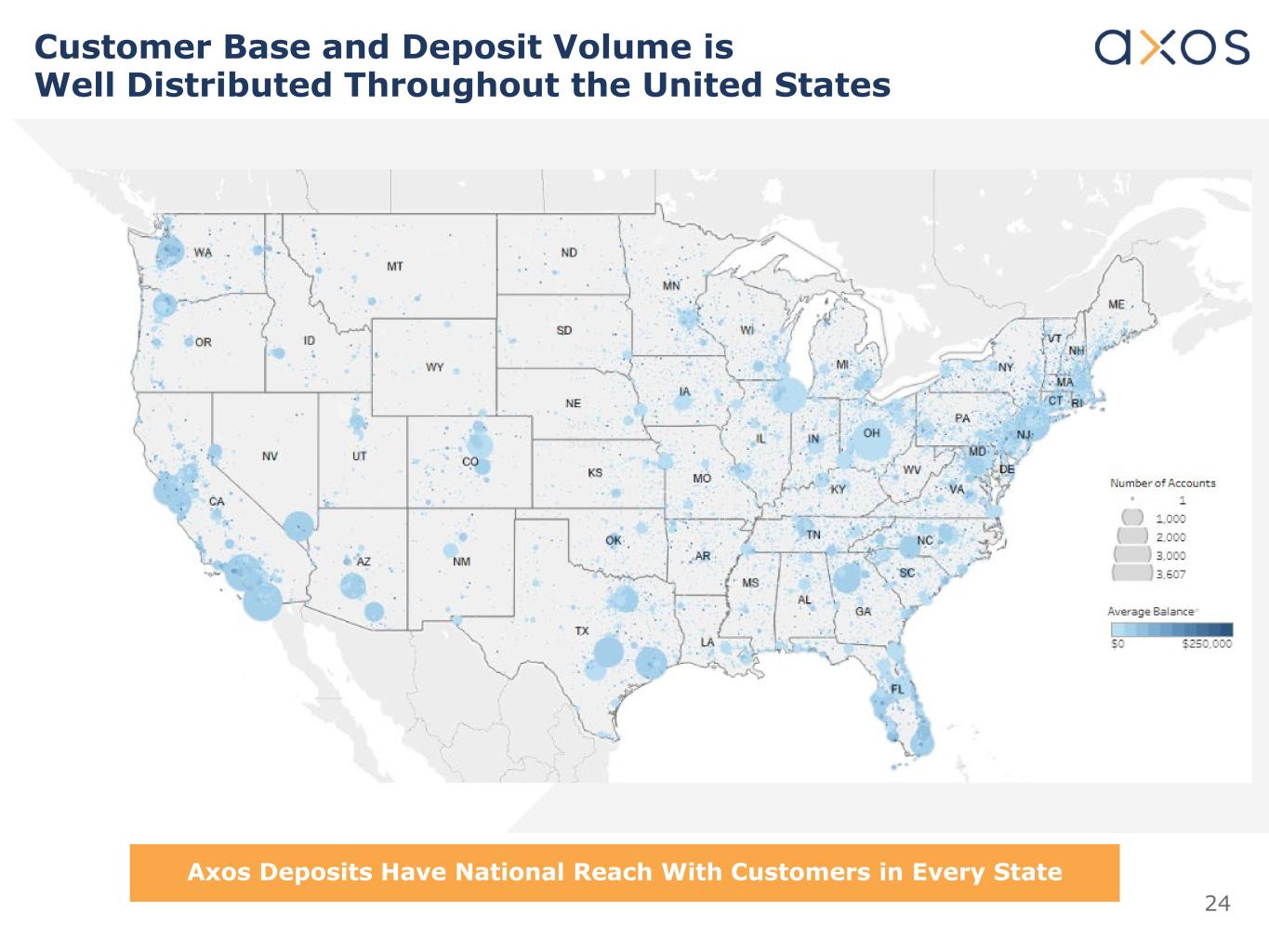 24笔AxOS存款在全国范围内覆盖了每个州客户群的客户,存款量在美国各地分布良好