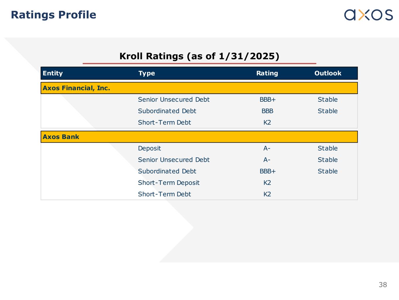 38评级简介主体类型评级展望Axos Financial, Inc.高级无抵押债BBB +稳定次级债BBB稳定短债K2 Axos银行存款A-稳定高级无抵押债A-稳定次级债BBB +稳定短债K2短债K2 Kroll评级(截至1/31/2025)
